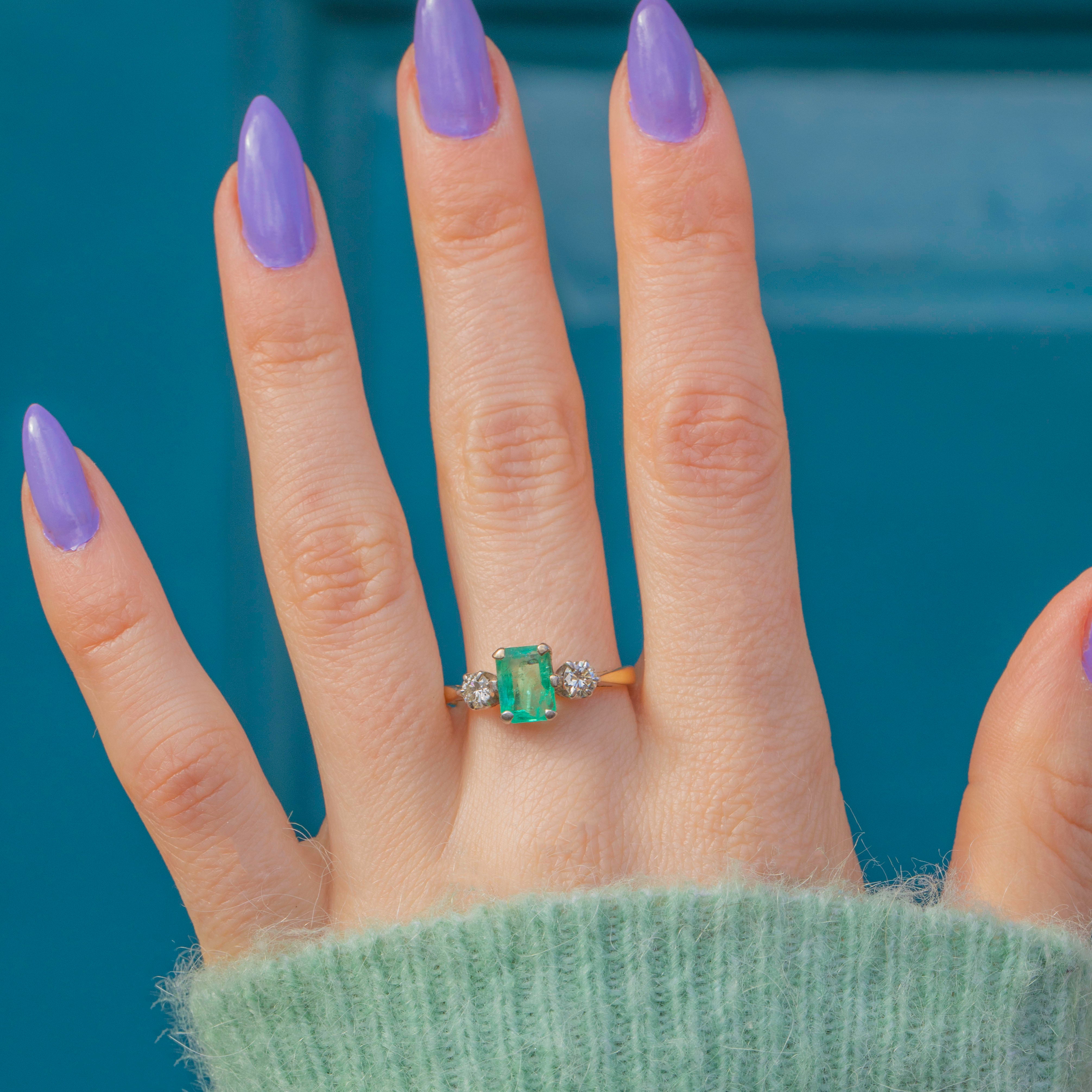 The bright green 1.20ct Emerald takes centre stage, flanked by brightly scintillating Diamonds! We love how dainty and lightweight this piece feels, she would make a perfect choice for a unique engagement ring if handled with the correct care.
