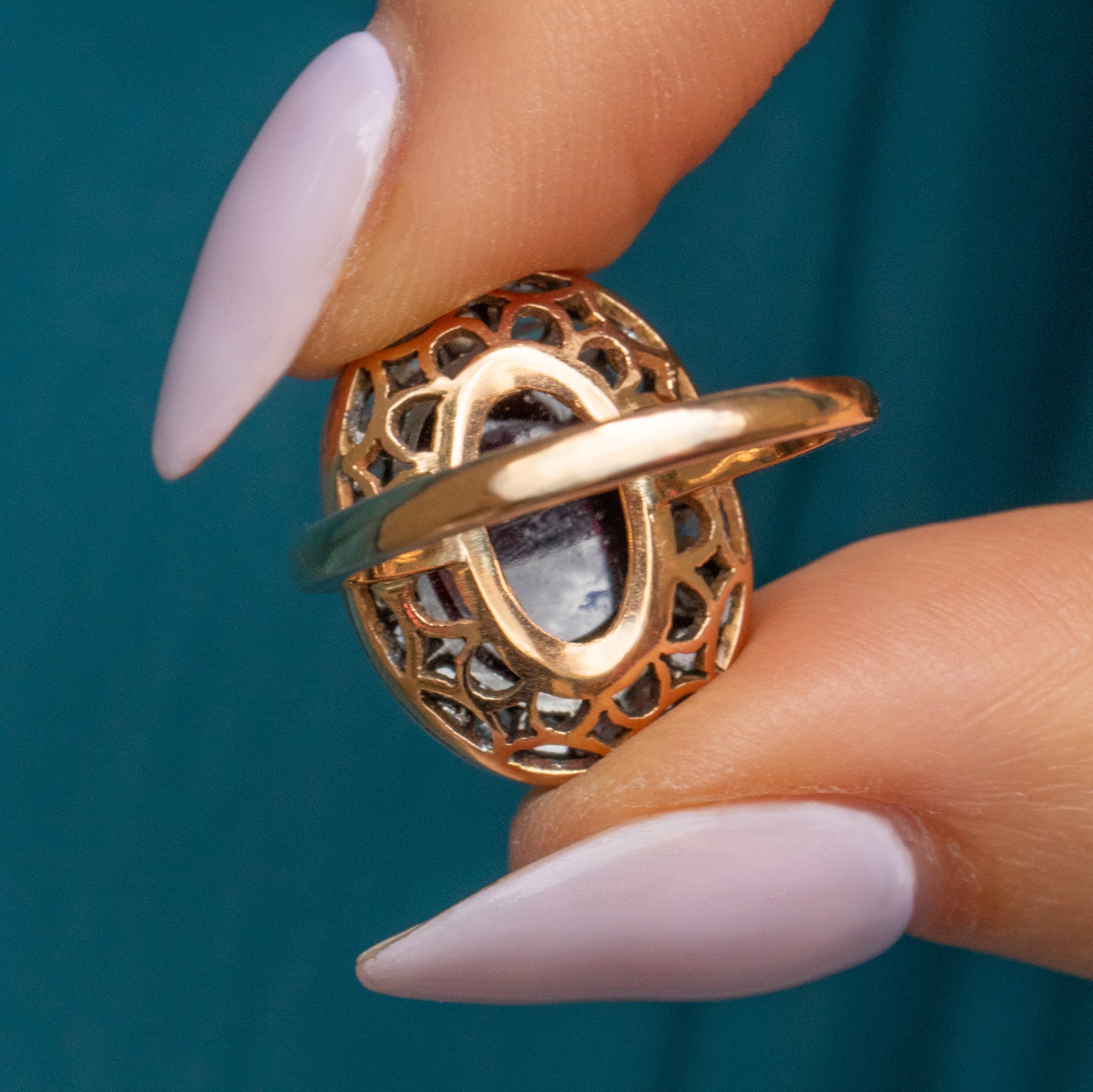 Your eye is immediately captured by the 6.20ct wine-hued Garnet, haloed by scintillating rose-cut Diamonds that total approximately 0.30ct. The Garnet and Diamonds cluster provides fabulous coverage, this Art Deco ring will not be opposed to taking centre stage as a statement piece on your hand!
