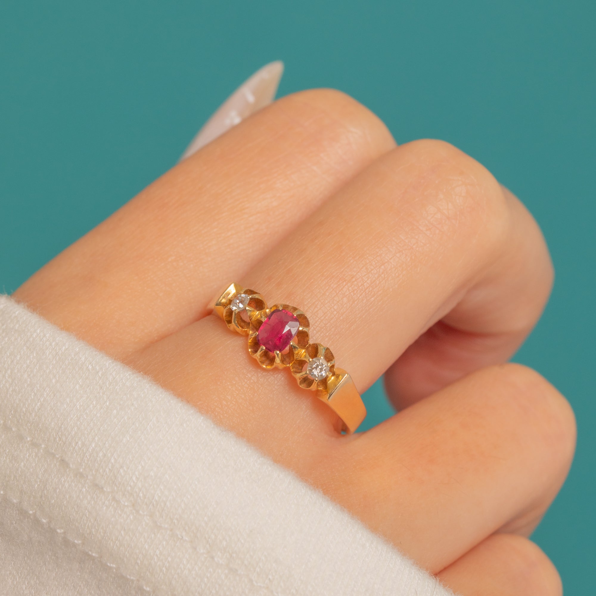 Fully hallmarked for Chester with the date letter “L” for 1911, this three-stone ring blends delicate proportions with timeless elegance. The open backs invite light through the gems, enhancing their glow. The Ruby is approximately 0.25ct, with Diamonds of approximately 0.06ct combined.
