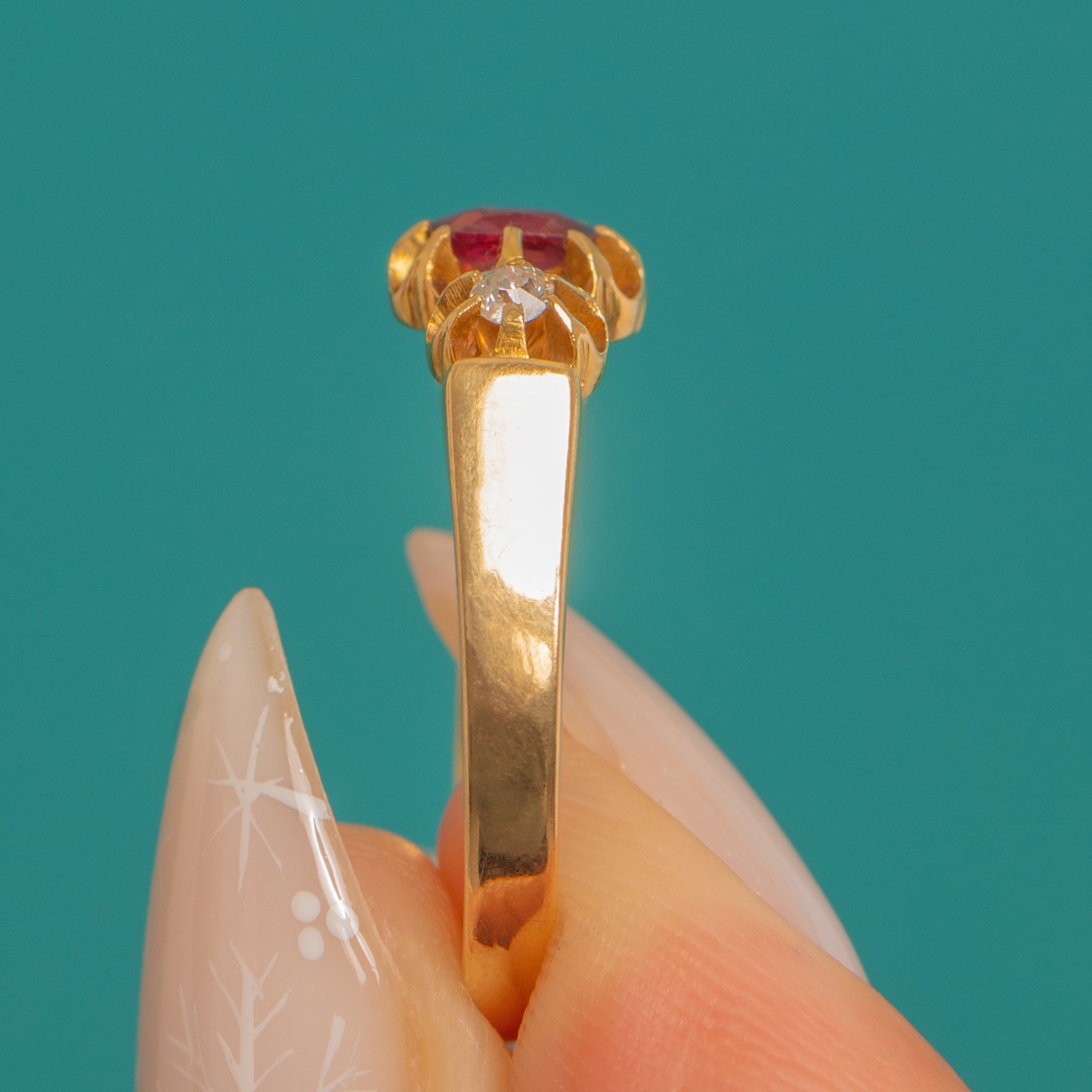 MATERIALS: Tests as 18ct Gold, Natural Ruby (0.25ct), Old Mine Cut-Diamonds (0.06ct).
