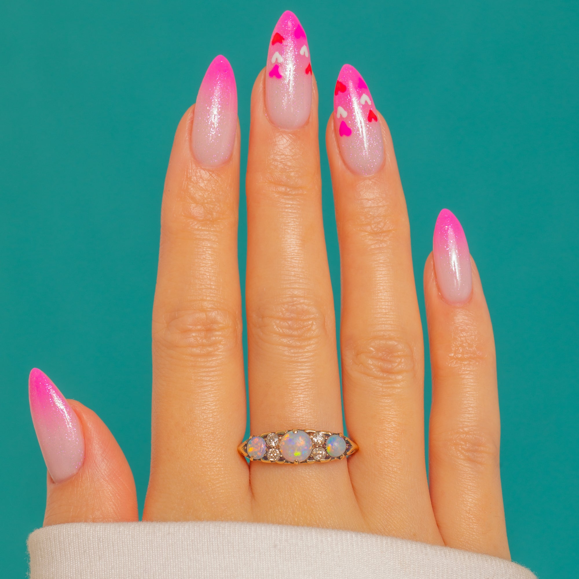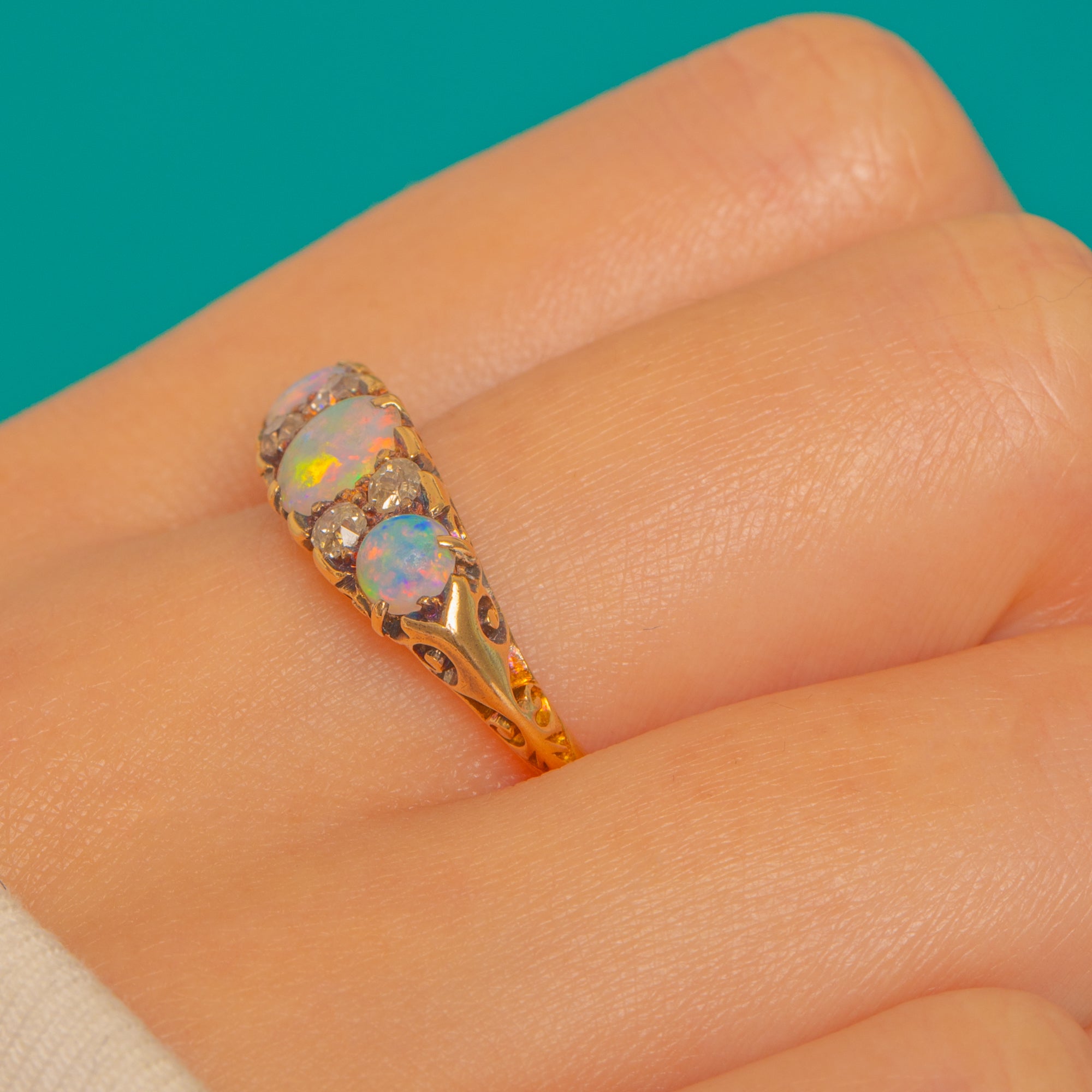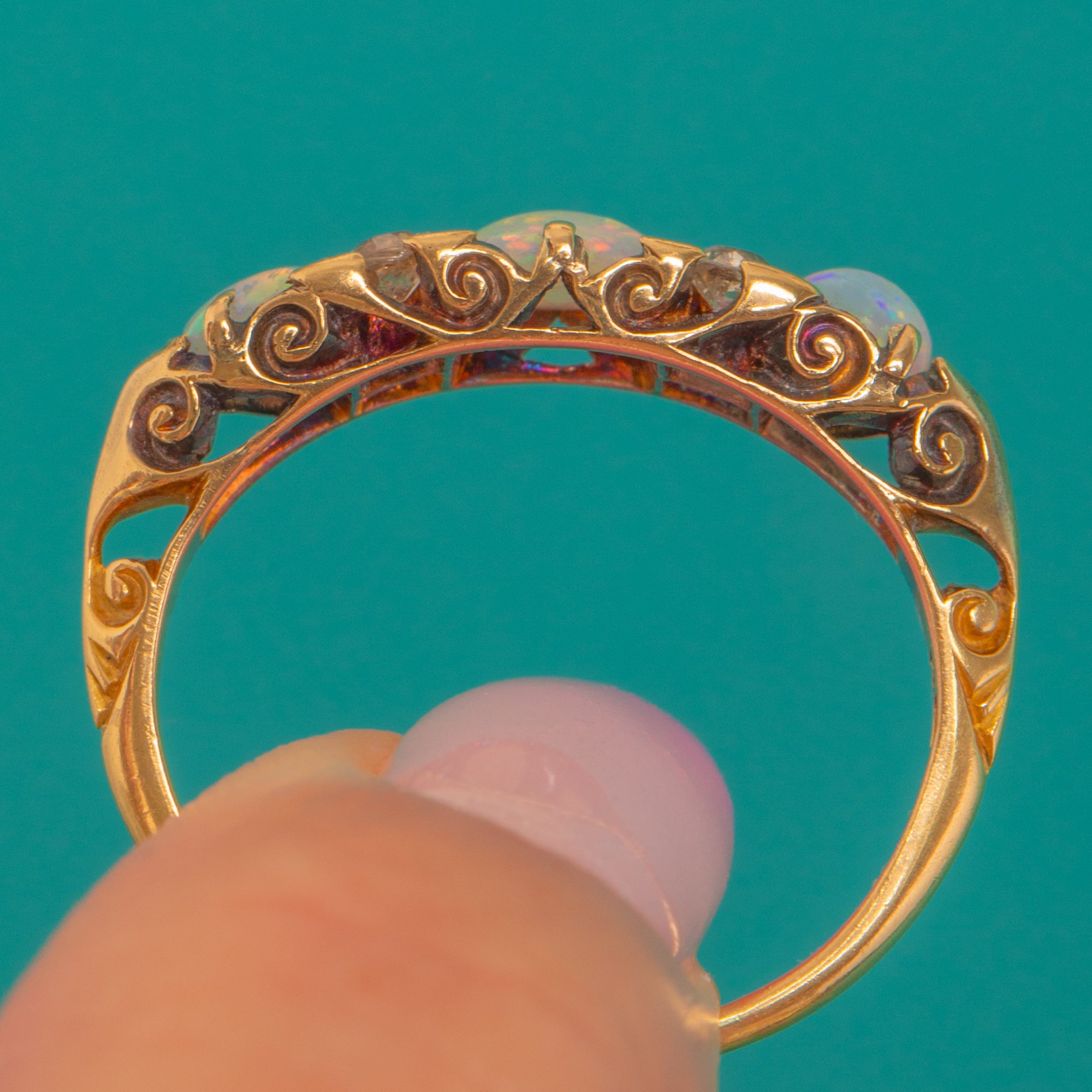 A romantic Victorian seven-stone ring in glowing 18ct Gold, set with a trio of luminous Opals and framed by four sparkling Old Mine Cut Diamonds. The Opals’ dreamy play-of-colour — flashes of soft blues, greens and pinks — dances beautifully against the warm Gold, while the Diamonds add a delicate, antique sparkle.
