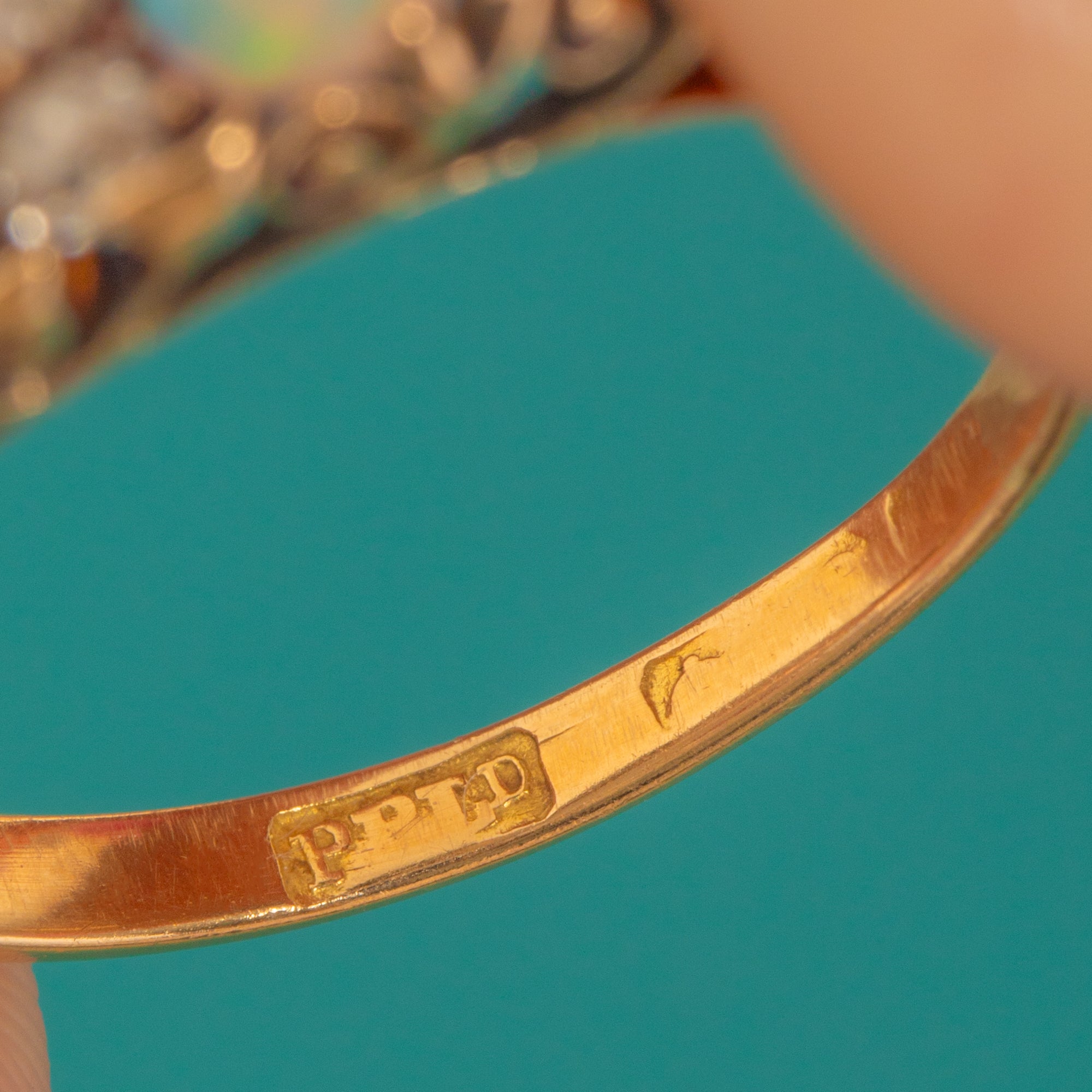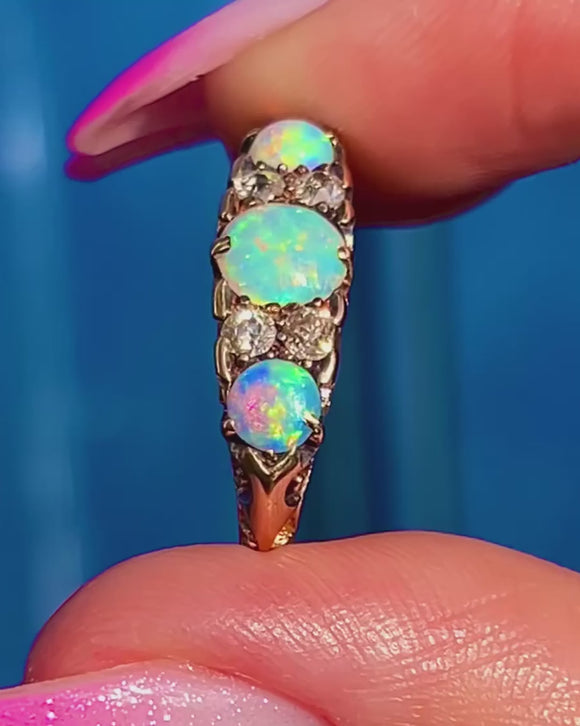 EXCELLENT: Opals and Diamonds are bright and securely set with minimal age-related surface wear visible. The 18ct Gold setting and decorative gallery are crisp with light, sympathetic wear. The band is slightly oval from a past downsizing, with no issues to wear or enjoyment.
