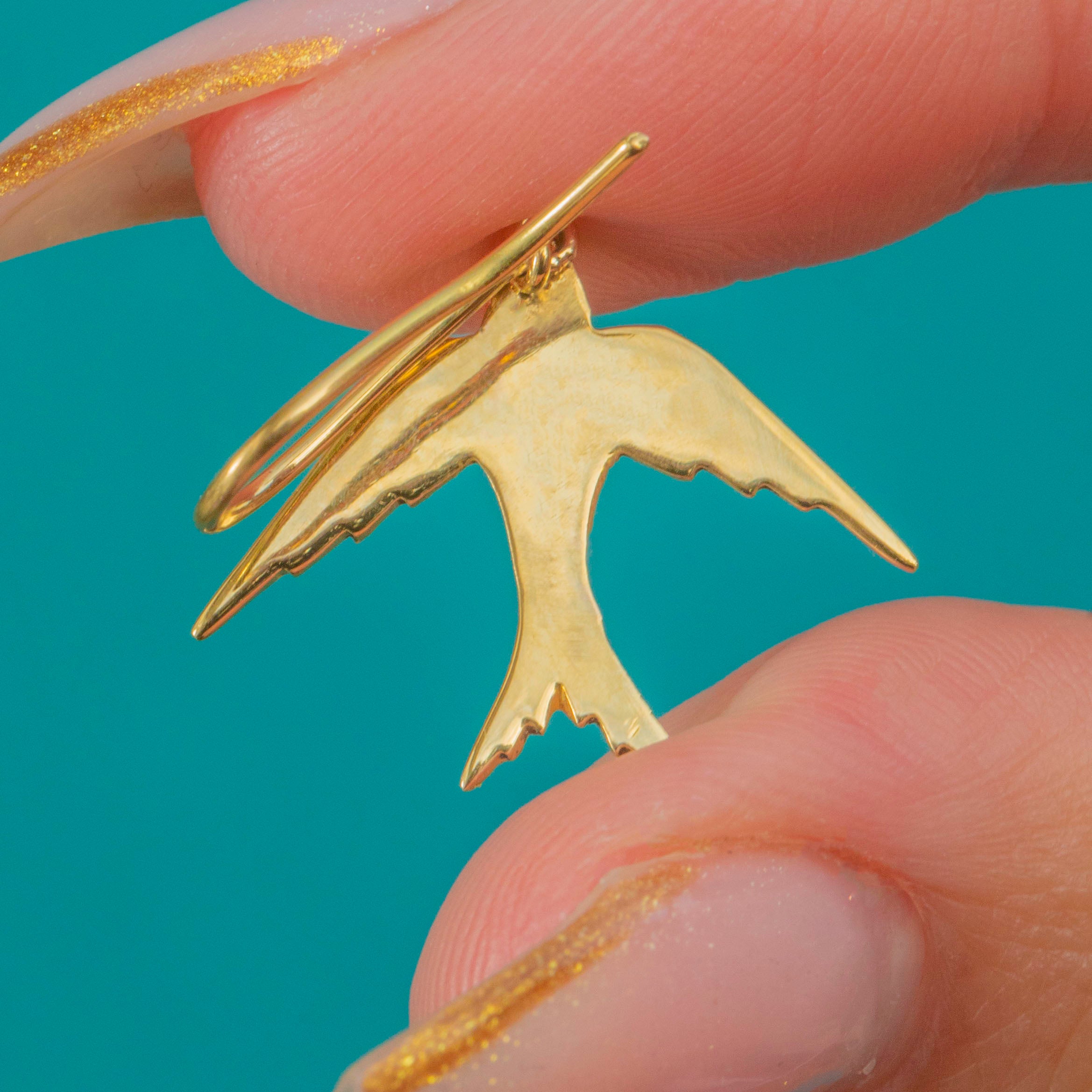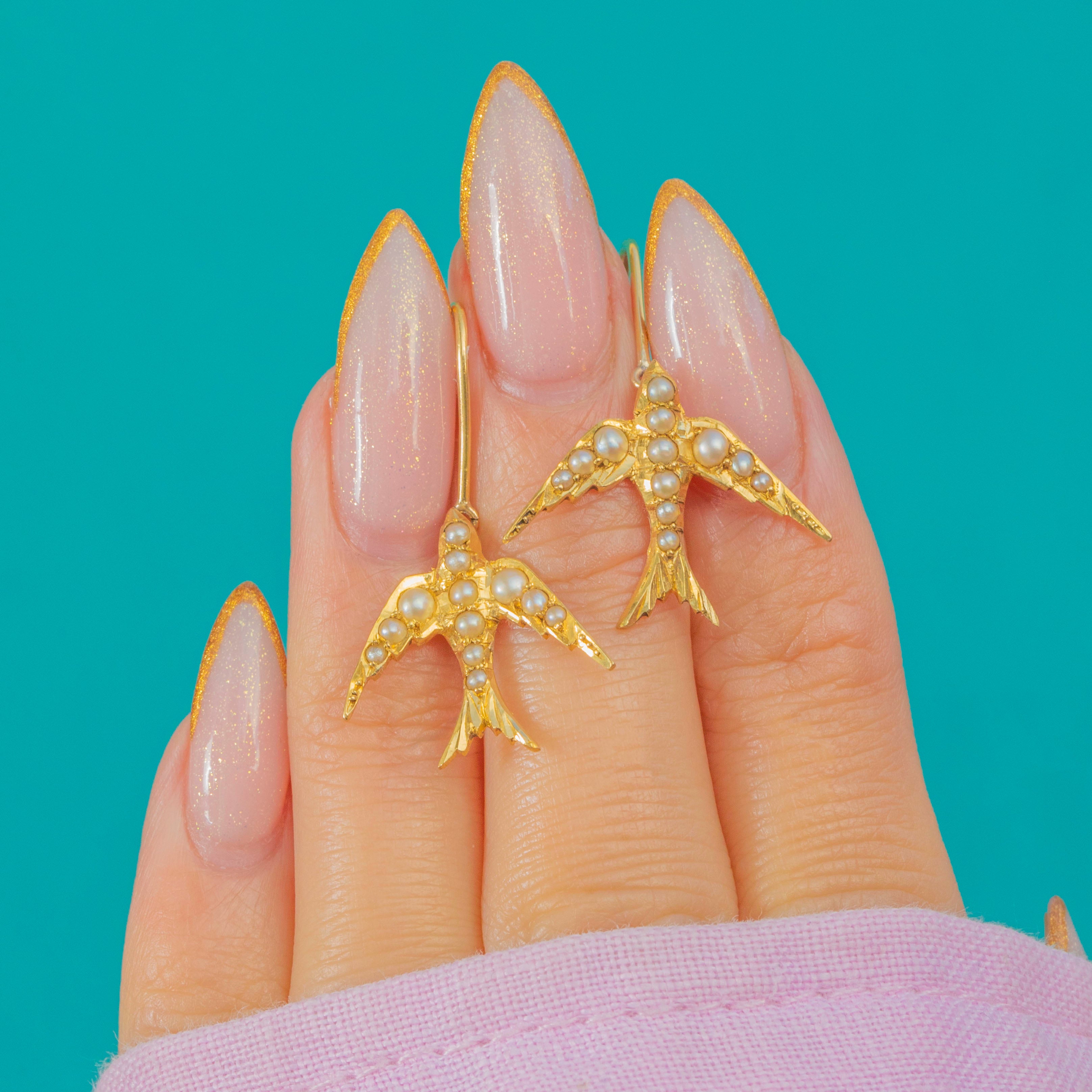 These Edwardian 18ct Gold Swallow earrings are a charming symbol of love and loyalty. Each Swallow is set with tiny Seed Pearls, giving them a soft, lustrous glow that catches the light beautifully.