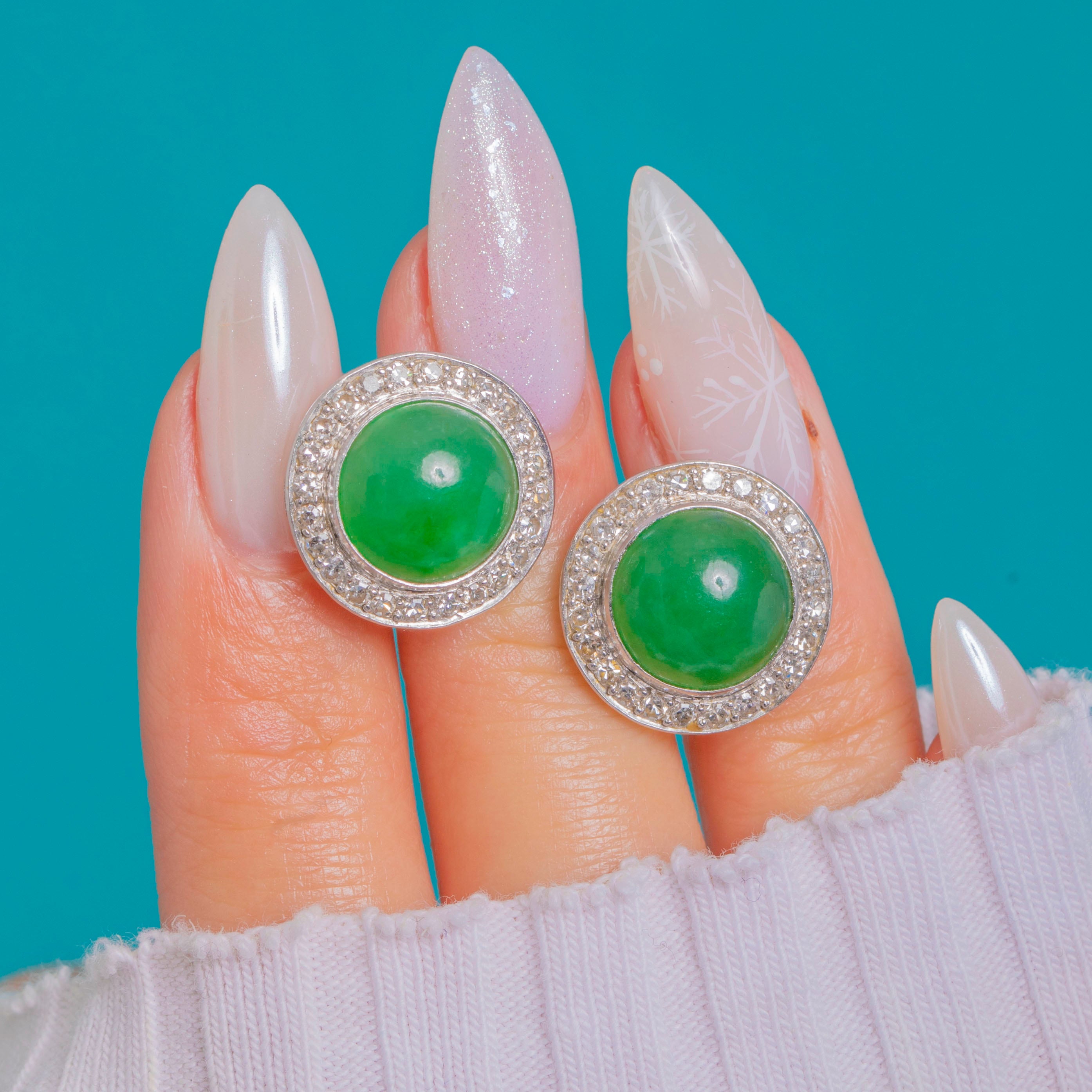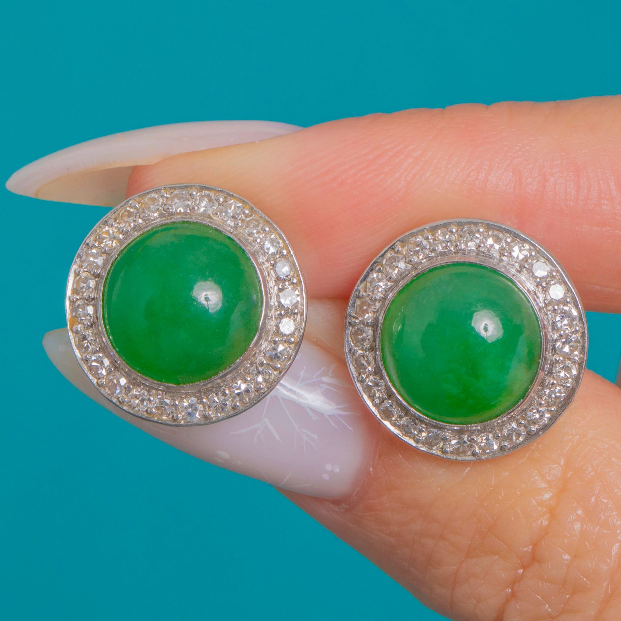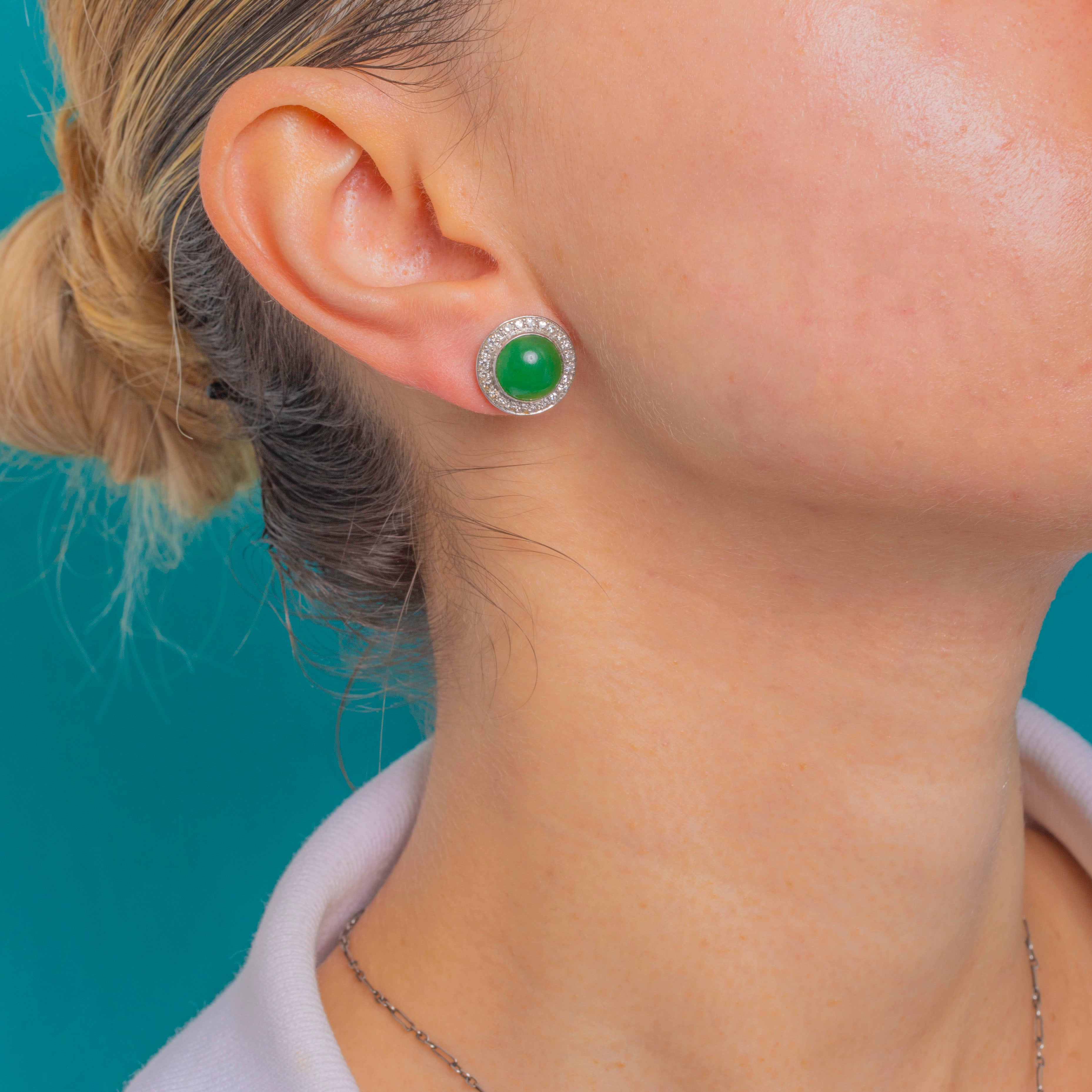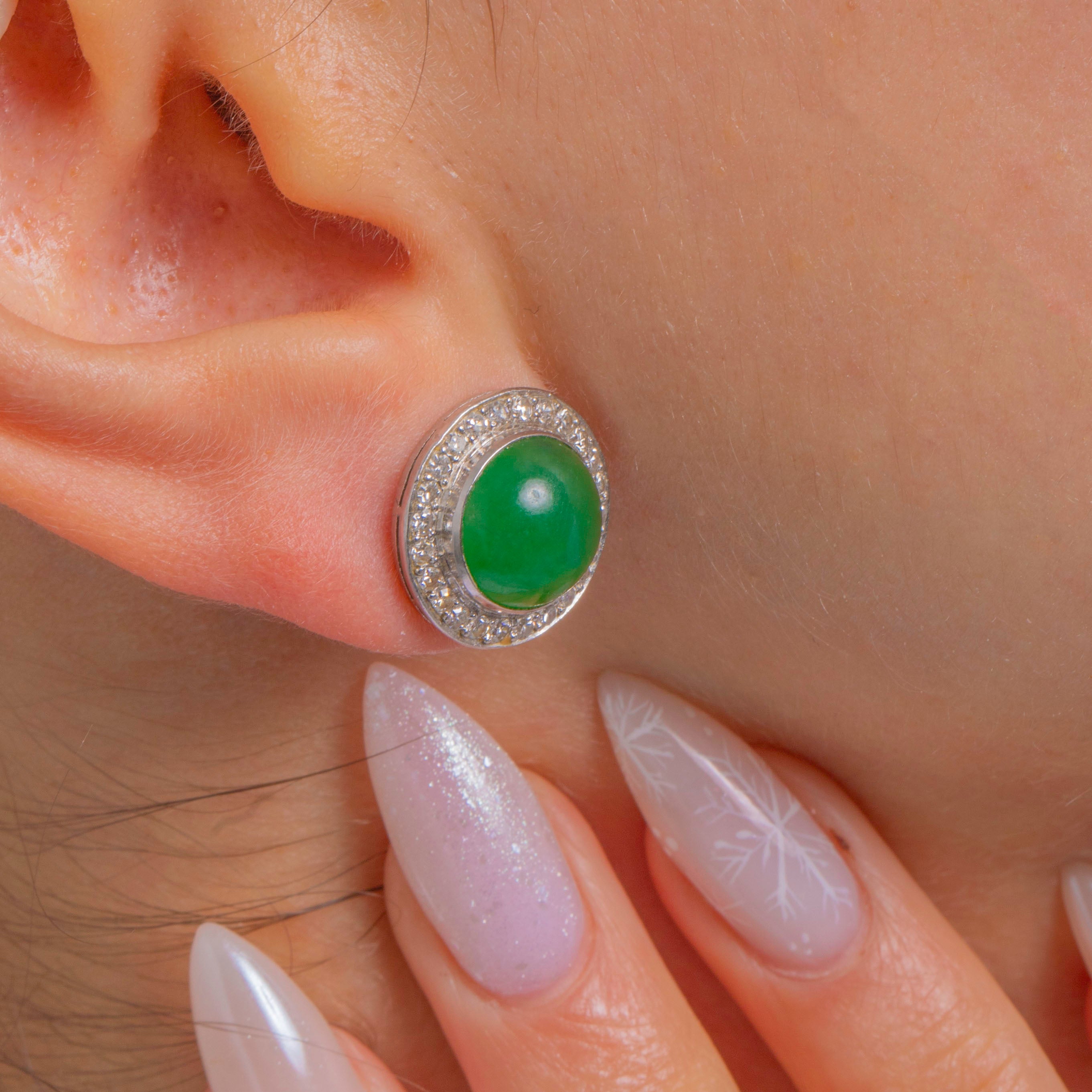 EXCELLENT: Jade cabochons are smooth and glossy with only minor natural surface dappling visible under close inspection. Diamonds are bright and securely set, with no missing stones and minimal wear to settings. Metalwork is crisp with a high polish; posts and butterflies are secure and well cared for.