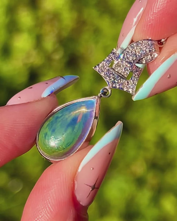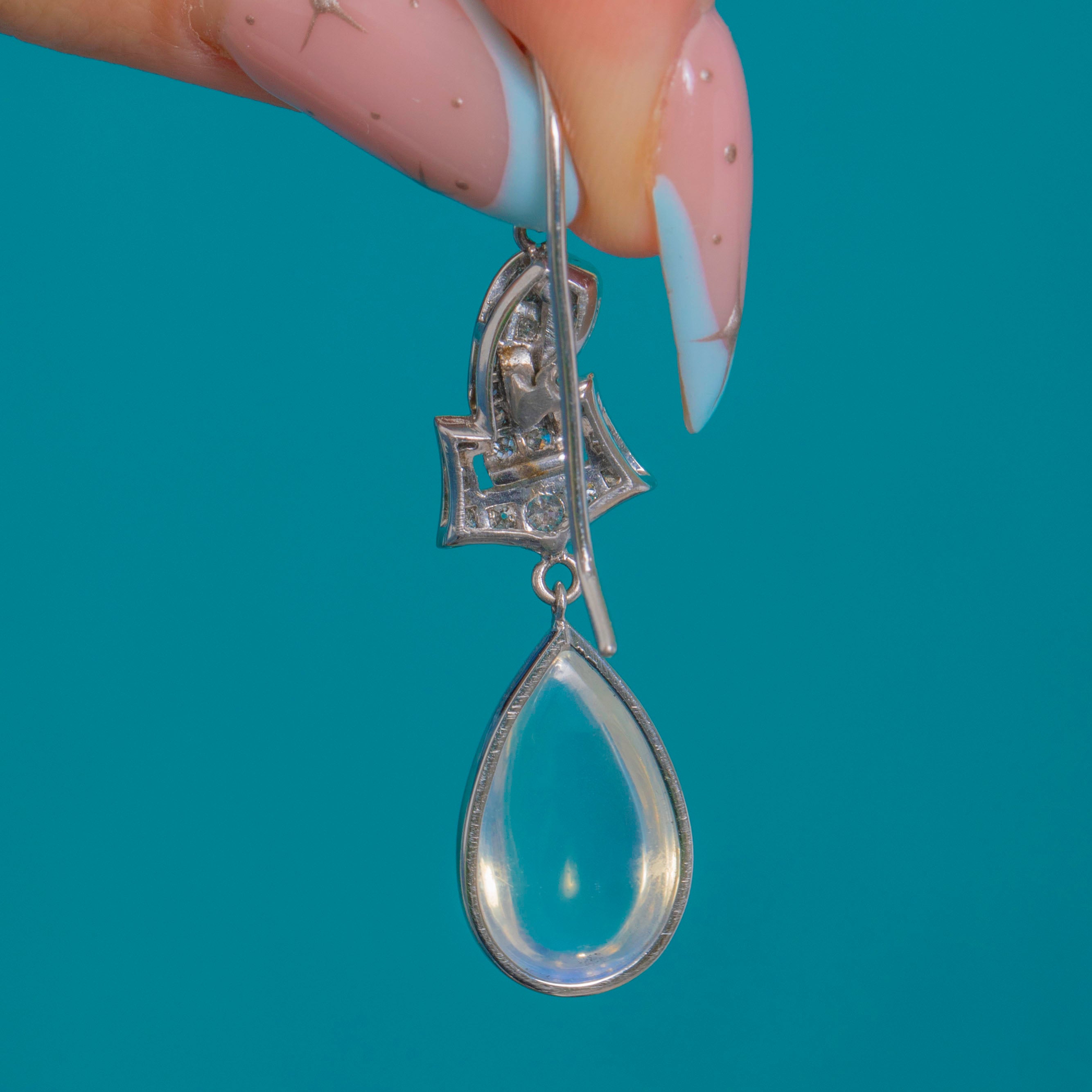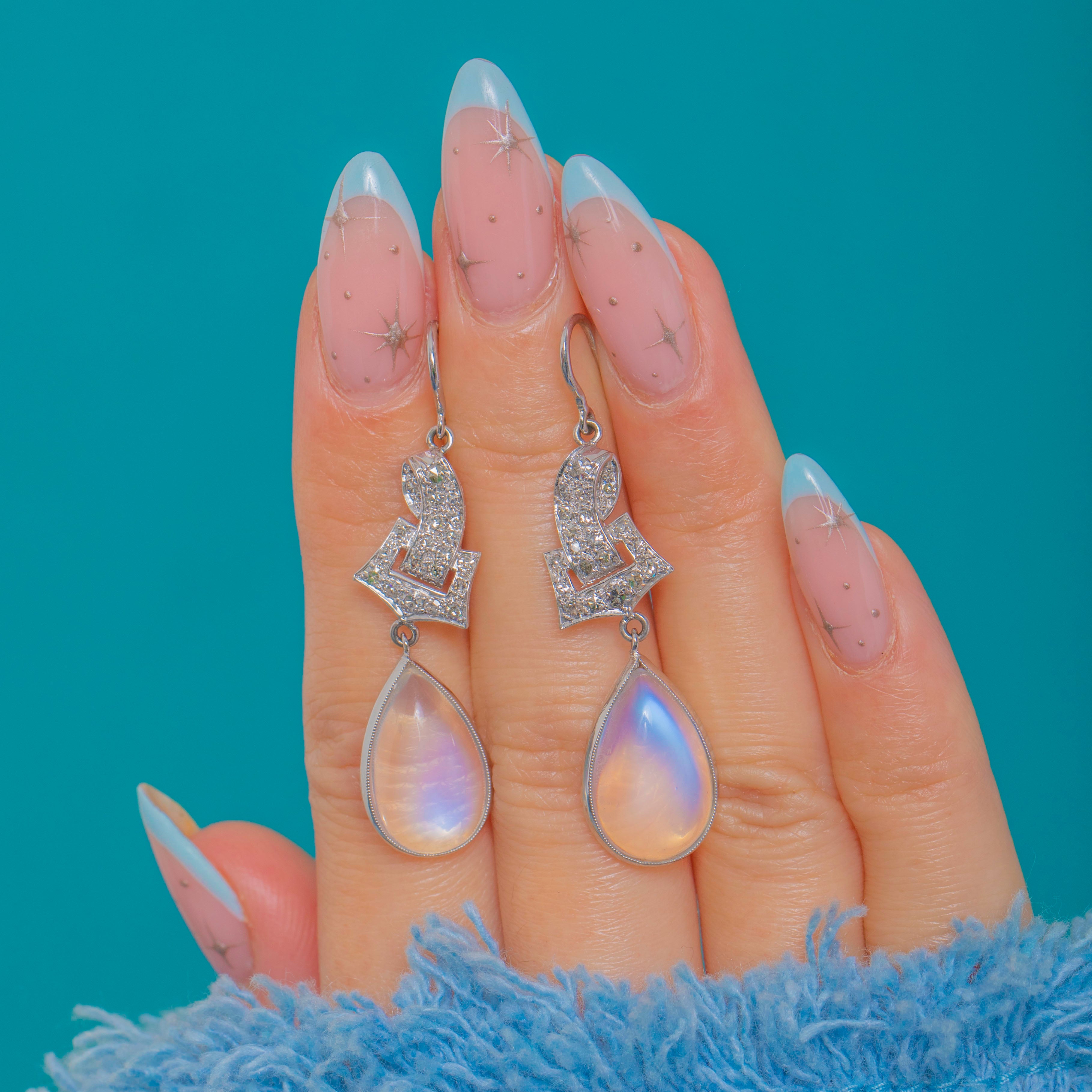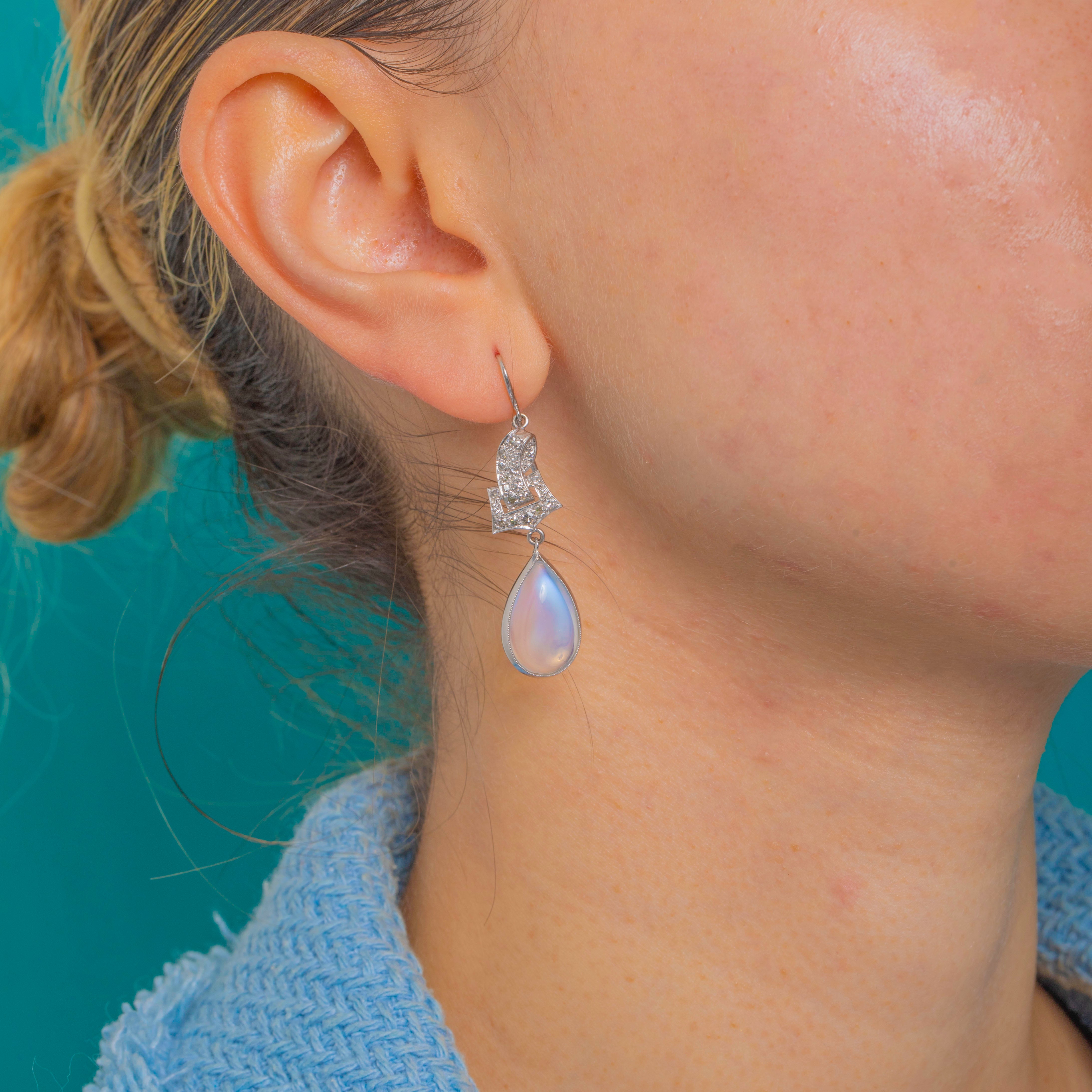 A sublime marriage of light and line, these early 20th-century drop earrings pair crisp pavé-set Diamonds with luminous pear-shaped Moonstone cabochons. Crafted in 18ct Gold and Platinum, the geometric top is edged with fine milgrain for that refined Edwardian finish, while delicate articulation lets the drops sway and catch the light.