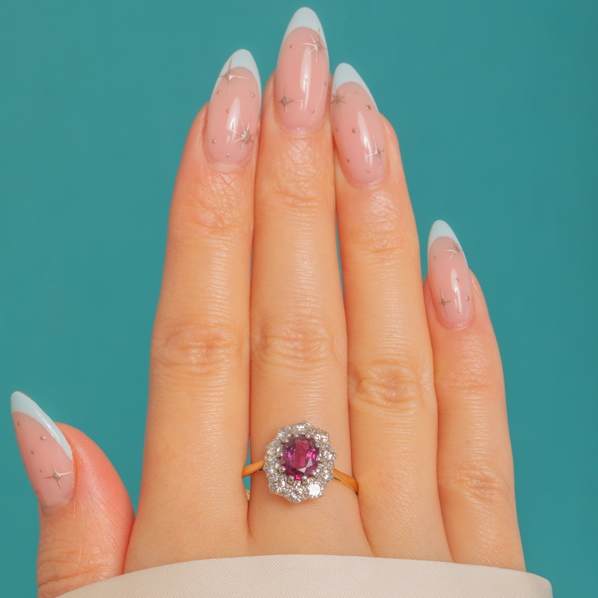 A beautifully poised Vintage cluster ring, crafted in rich 18ct Gold with elegant Platinum settings. At its heart sits a vivid oval Ruby, its saturated pink‑to‑purple hue framed by a scalloped halo of bright Diamonds. Fine bead and millegrain edges lend delicate texture and definition, enhancing the classic rosette silhouette.