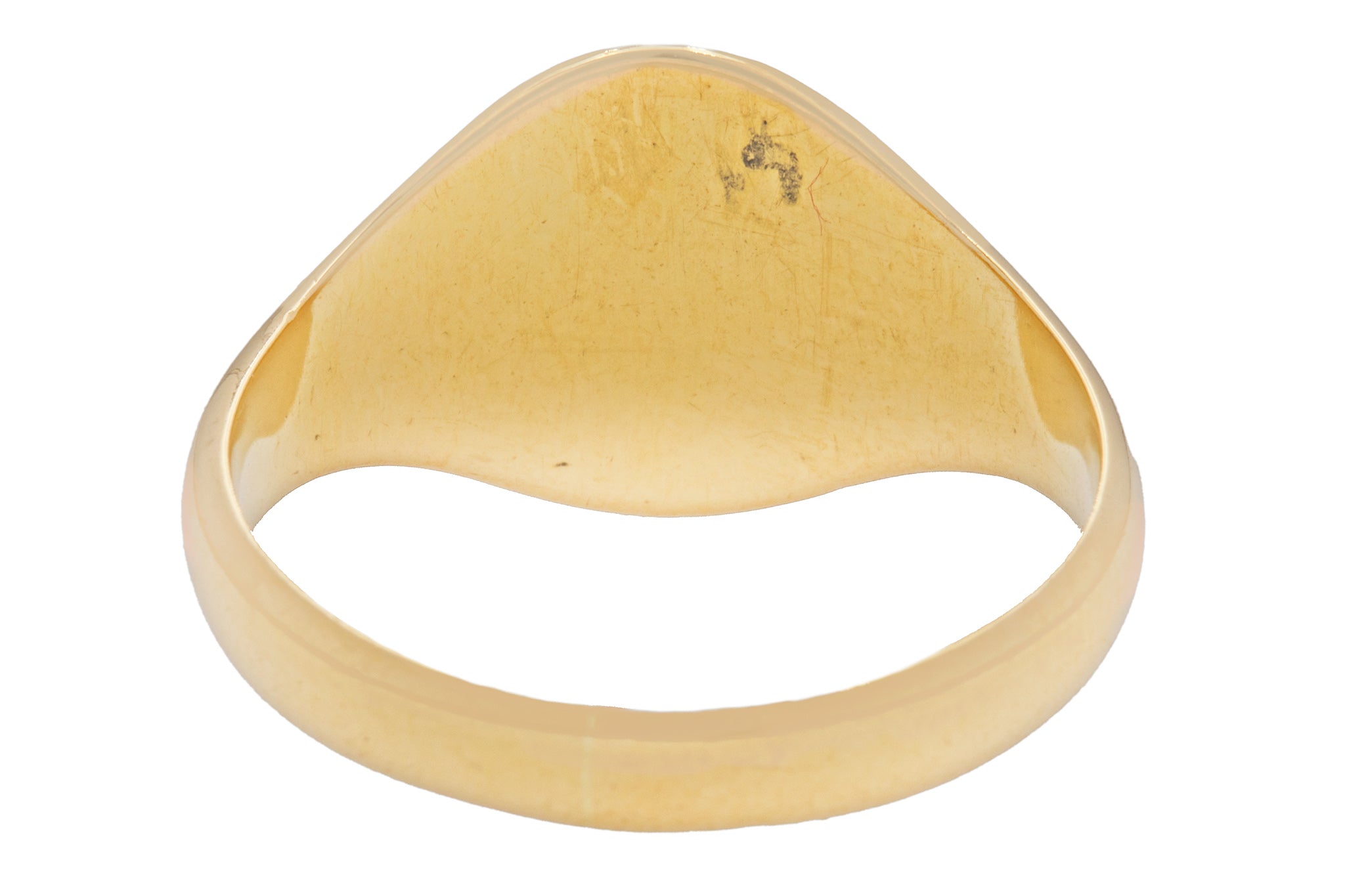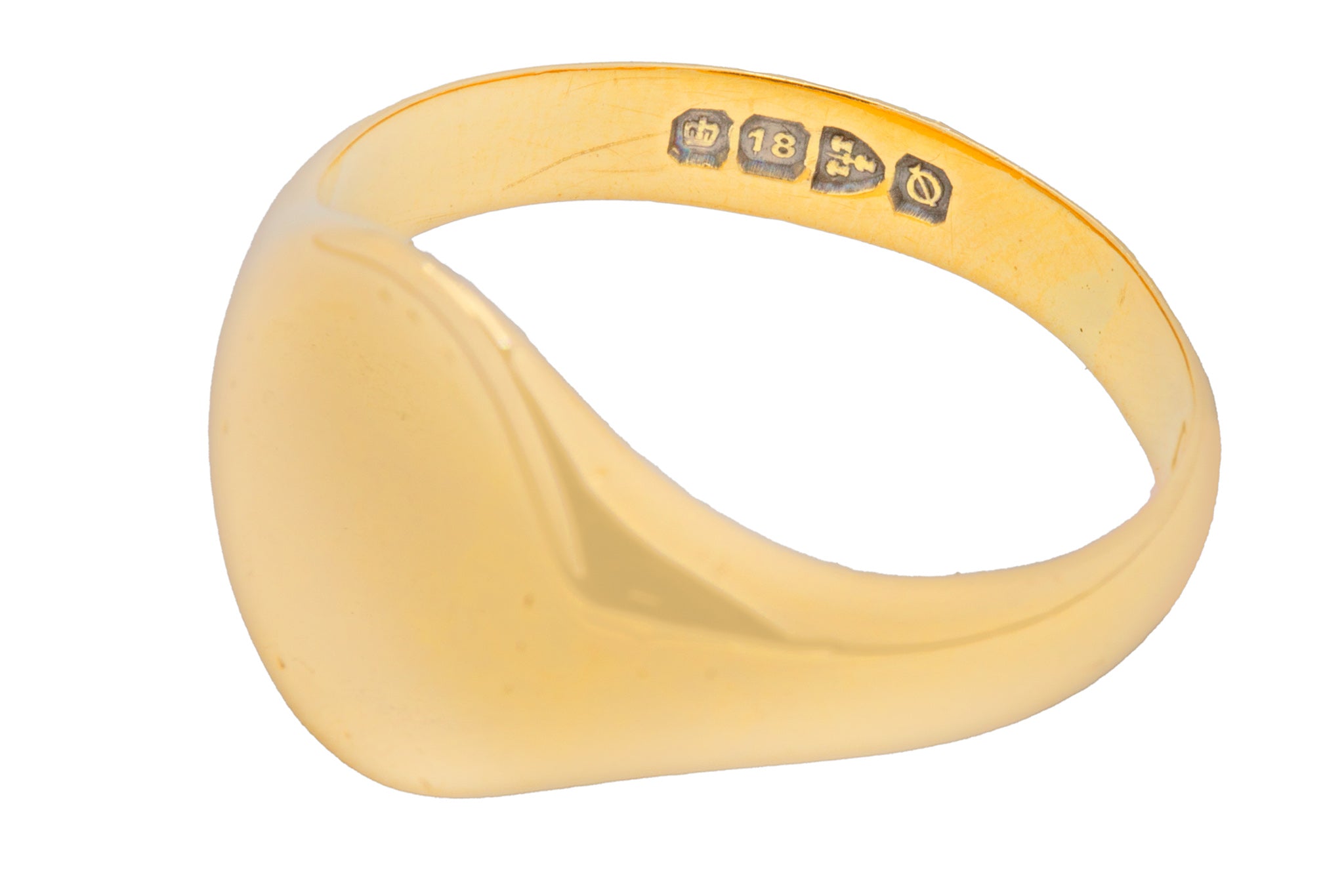 VERY GOOD. This 18ct Gold round signet ring is in very good condition. The inside of the band is fully hallmarked, and the band has a buttery tone overall. There are some faint engravings visible which have worn down over the years, but it's full of character nonetheless. There is an ever so slight and subtle resize mark, but this has been done well and the ring has remained fully intact.