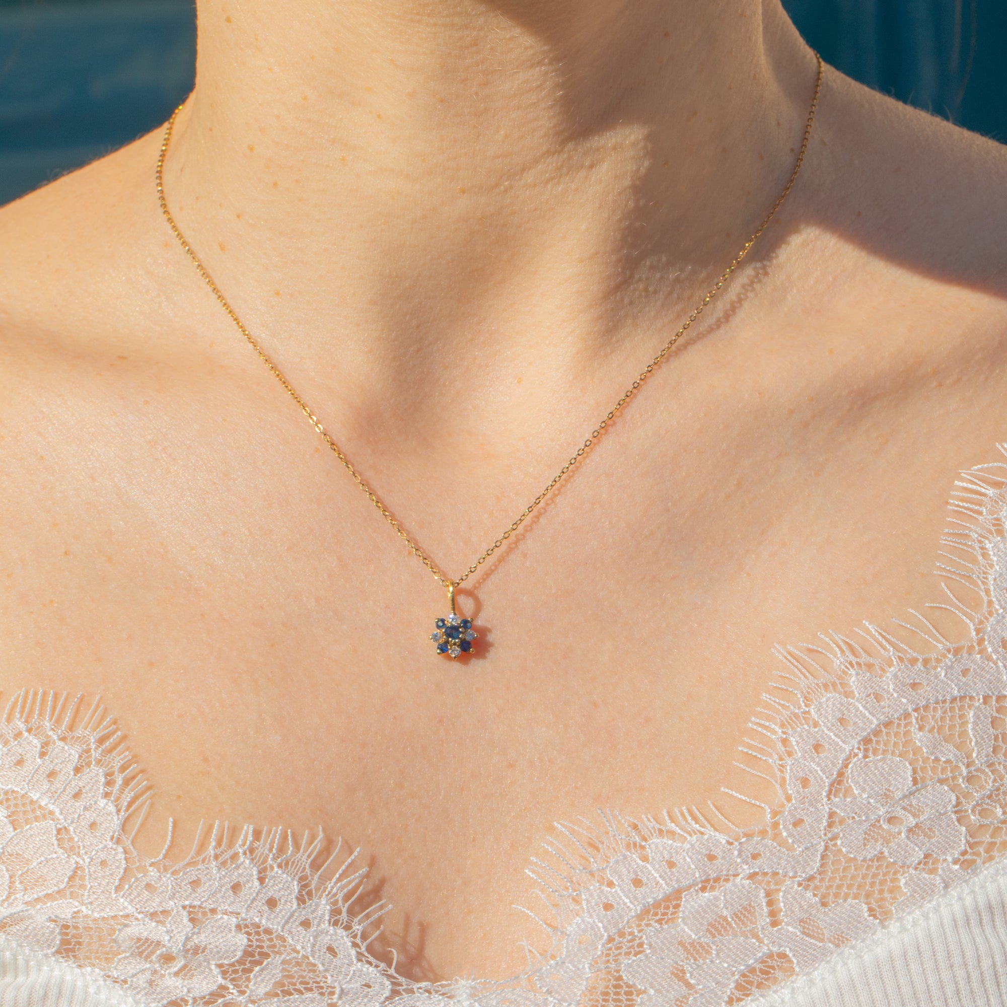 EXCELLENT. This 18ct Gold Sapphire Diamond flower cluster charm and chain is in excellent condition. Each gemstone is radiant and faceted wonderfully without evident signs of wear. With a secure chain, she can be worn with the utmost confidence!