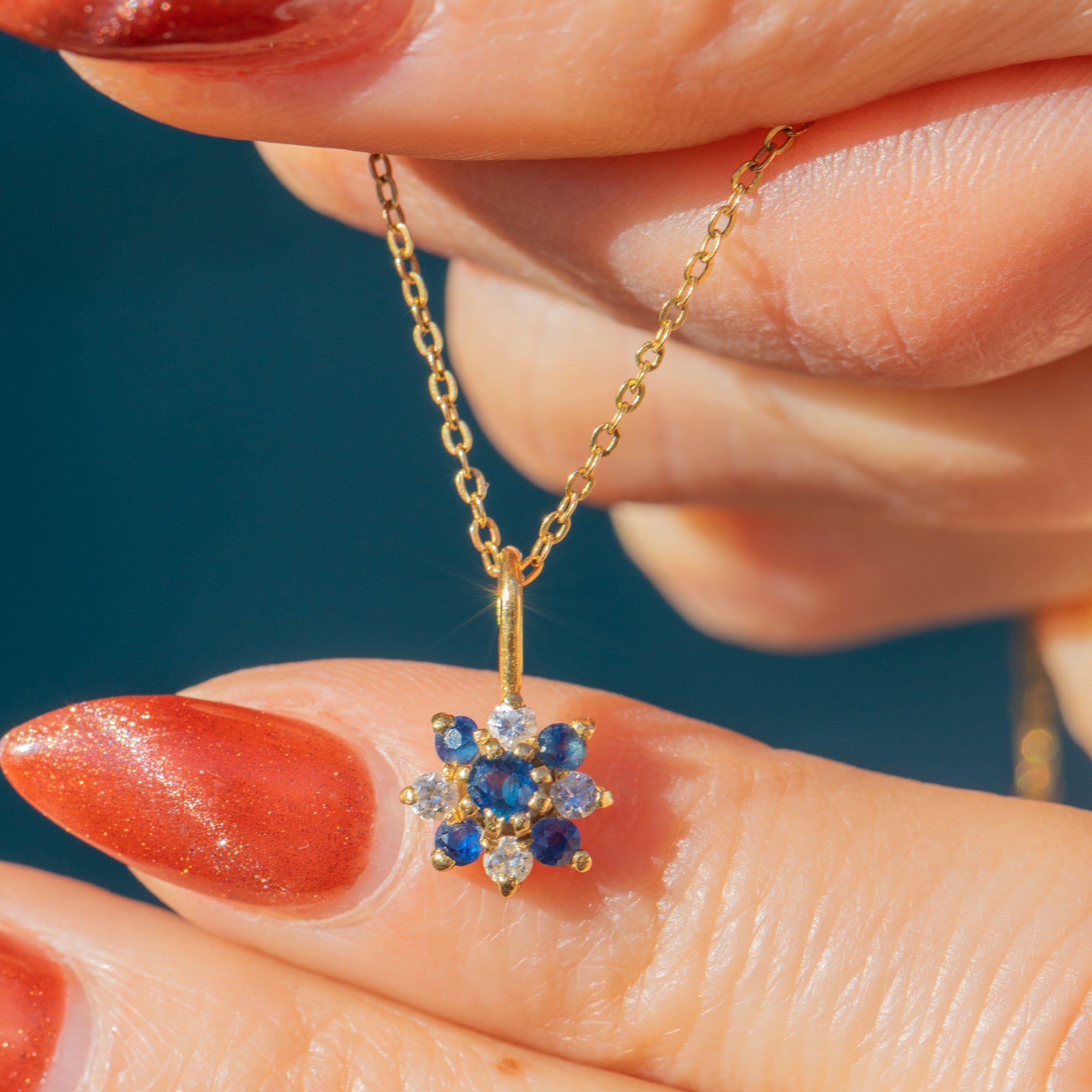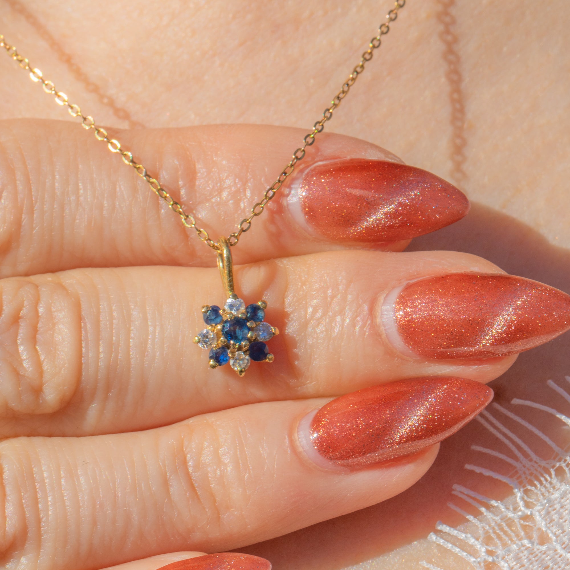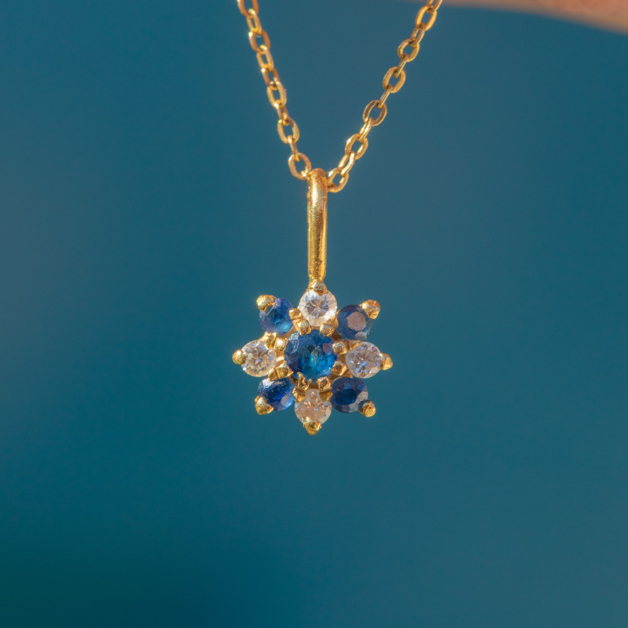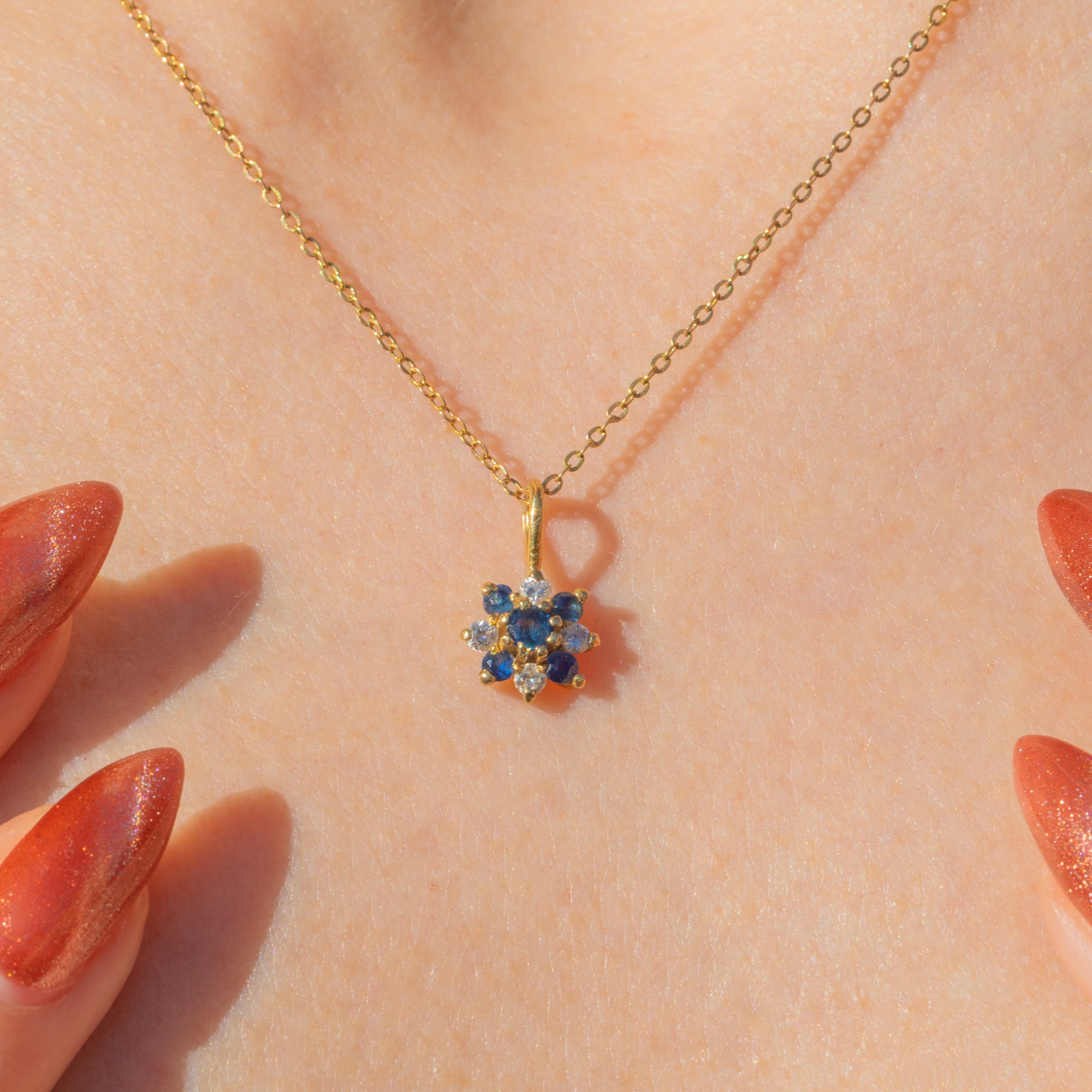 18ct Gold Sapphire Diamond Flower Cluster Charm, with 16" Chain