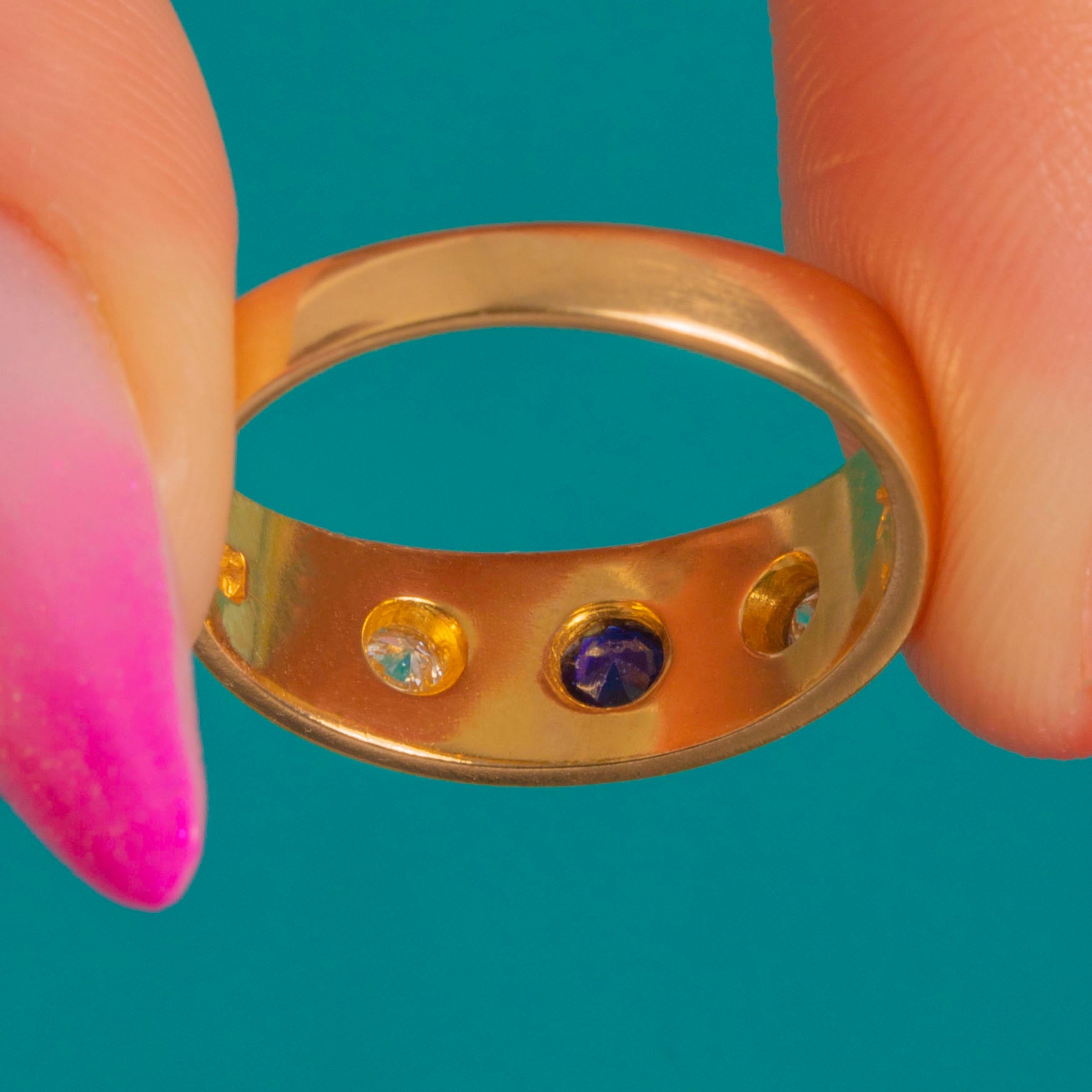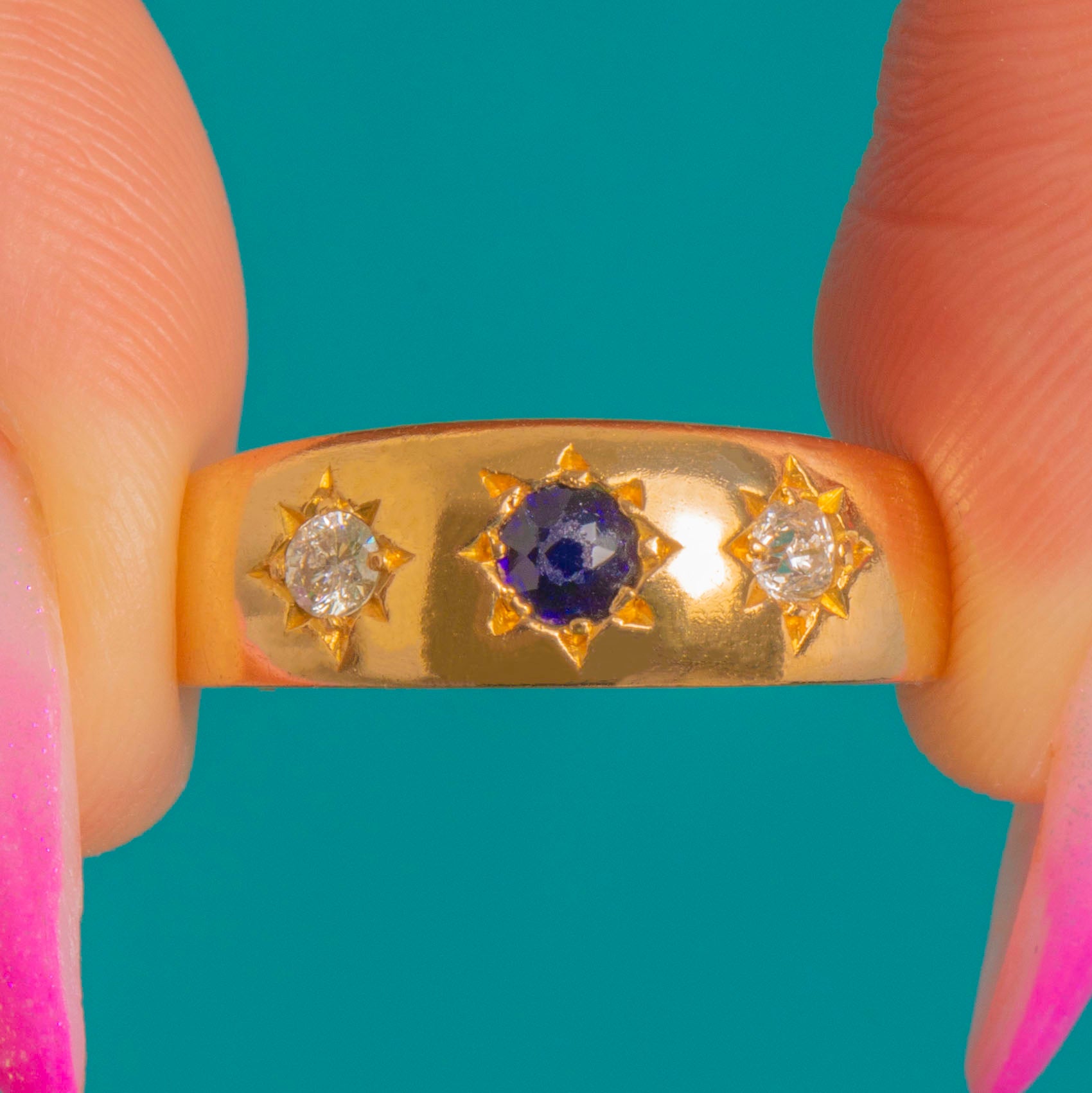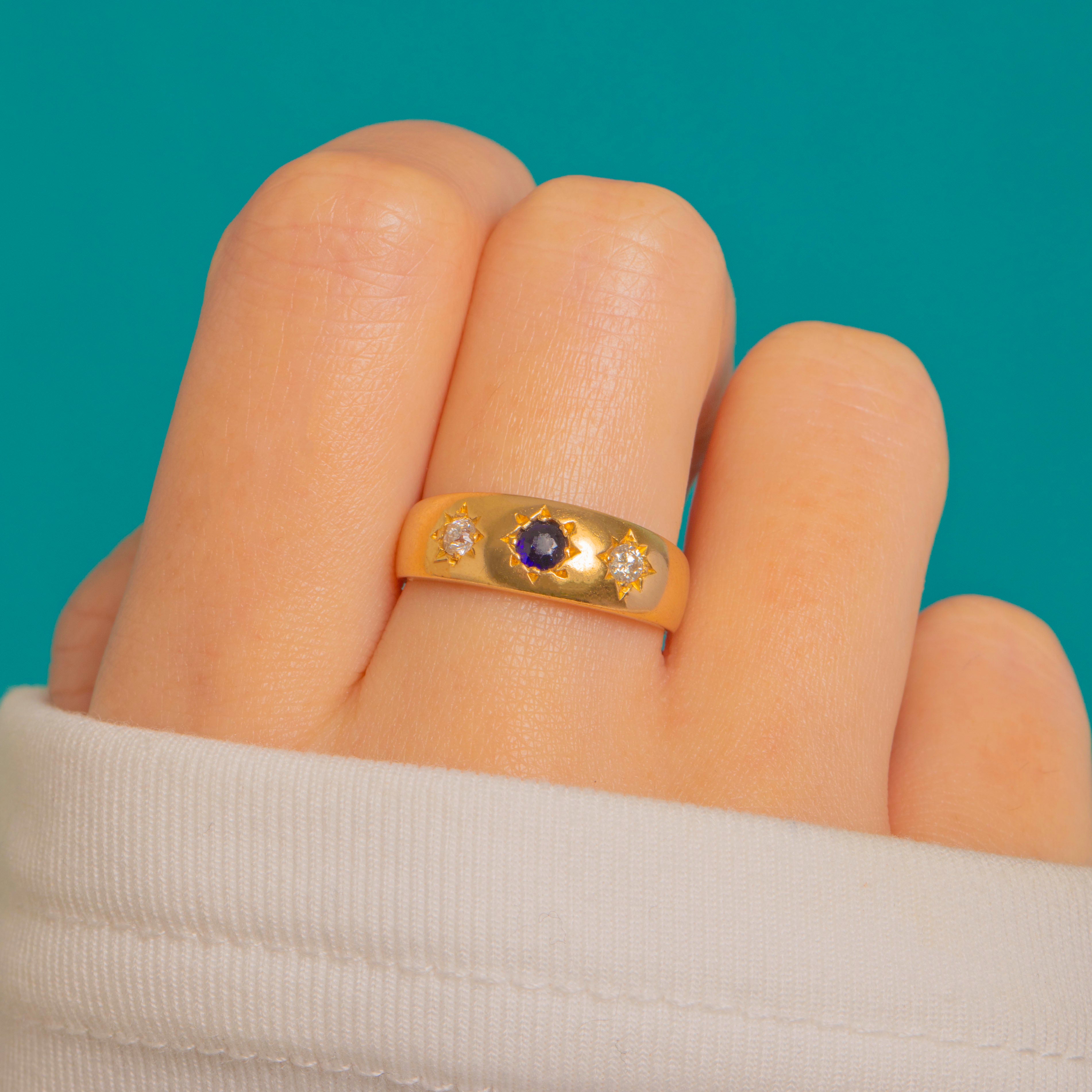 A classic Victorian treasure, this star-set gypsy ring is crafted in rich 18ct Gold and punctuated by a midnight-blue Sapphire flanked by two bright Diamonds. The low, flush settings and engraved eight-point stars lend a celestial shimmer that feels both refined and effortlessly wearable.