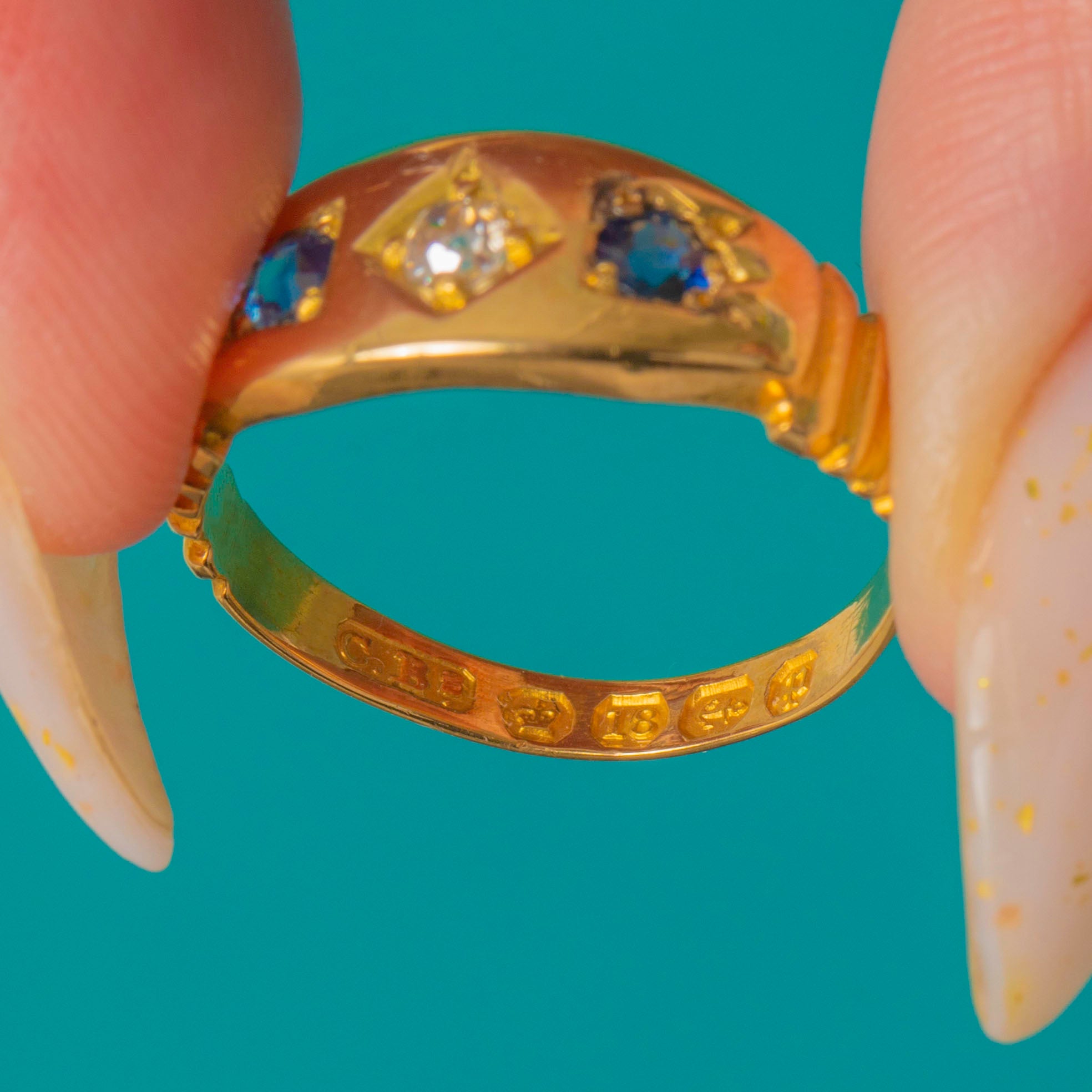18ct Gold Sapphire Diamond Three Stone Gypsy Ring c.1889 Item added