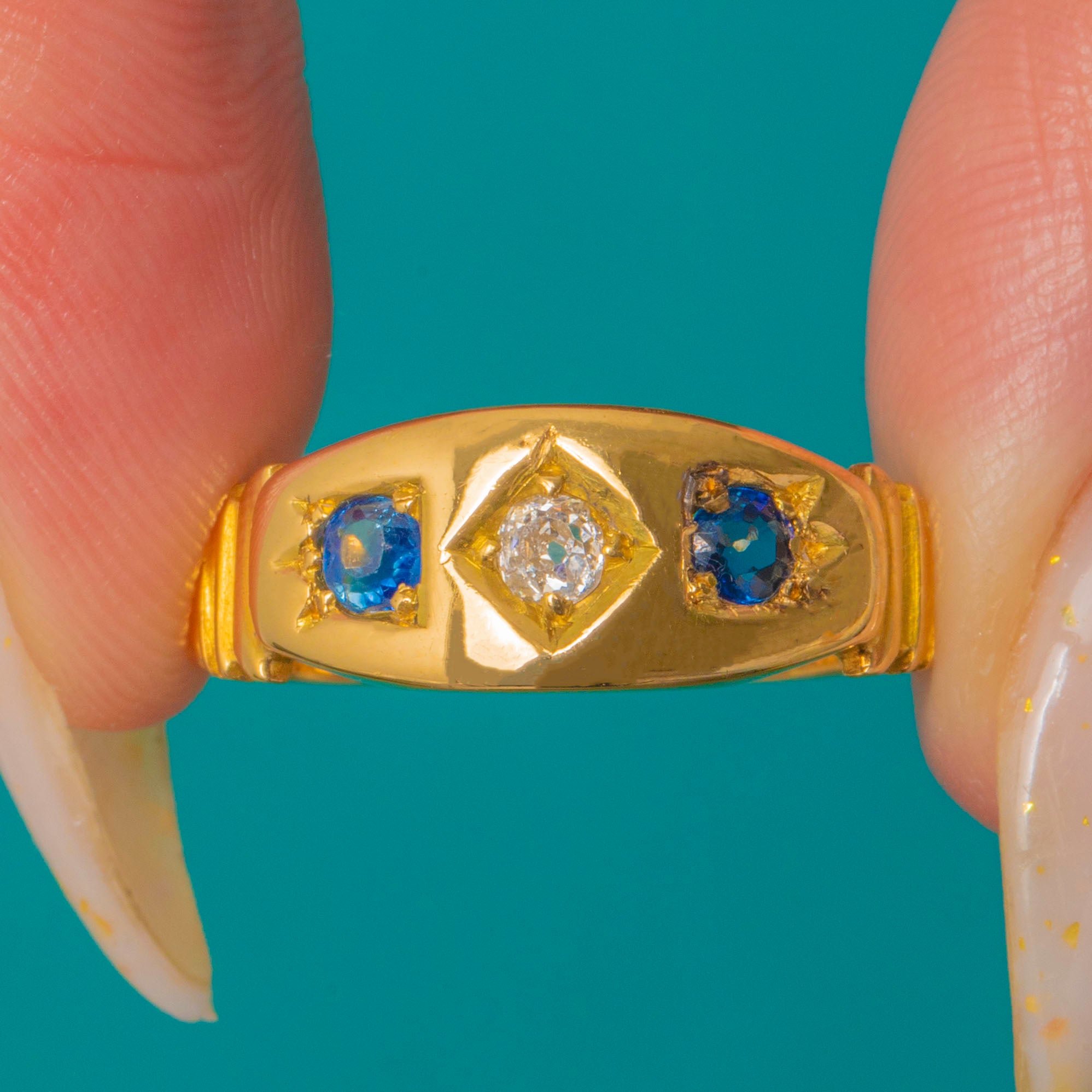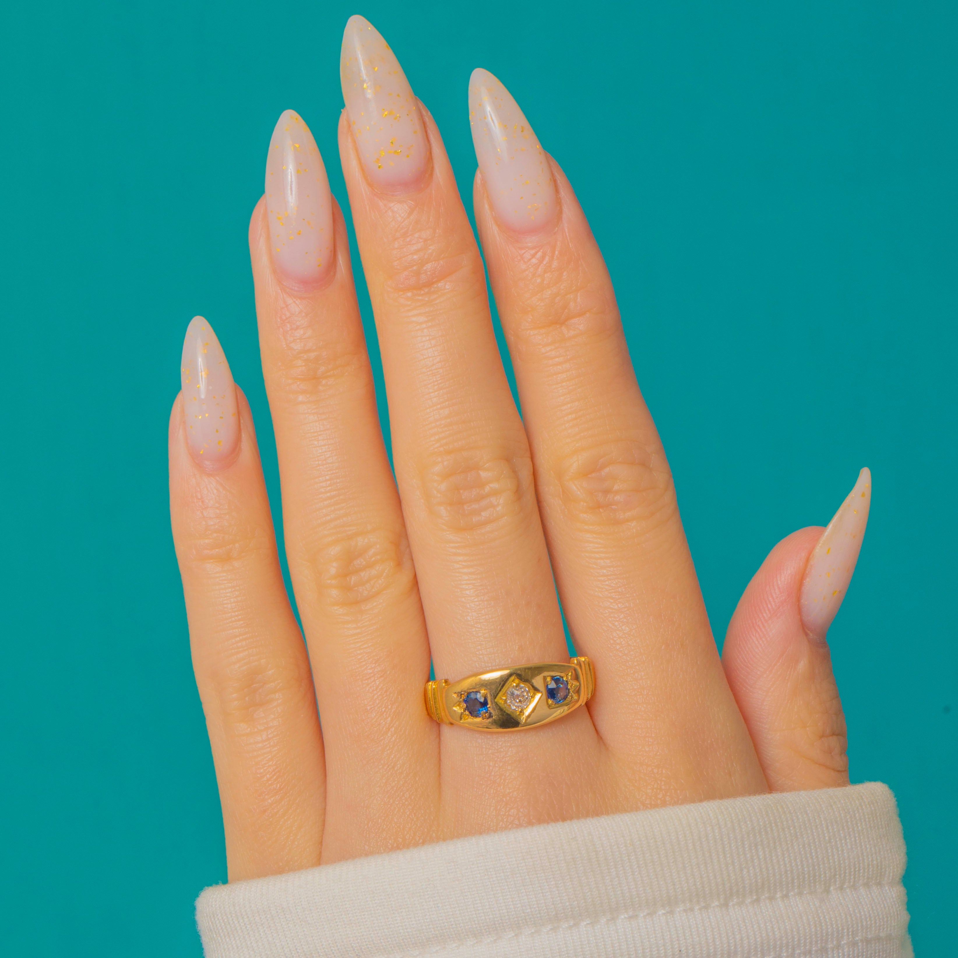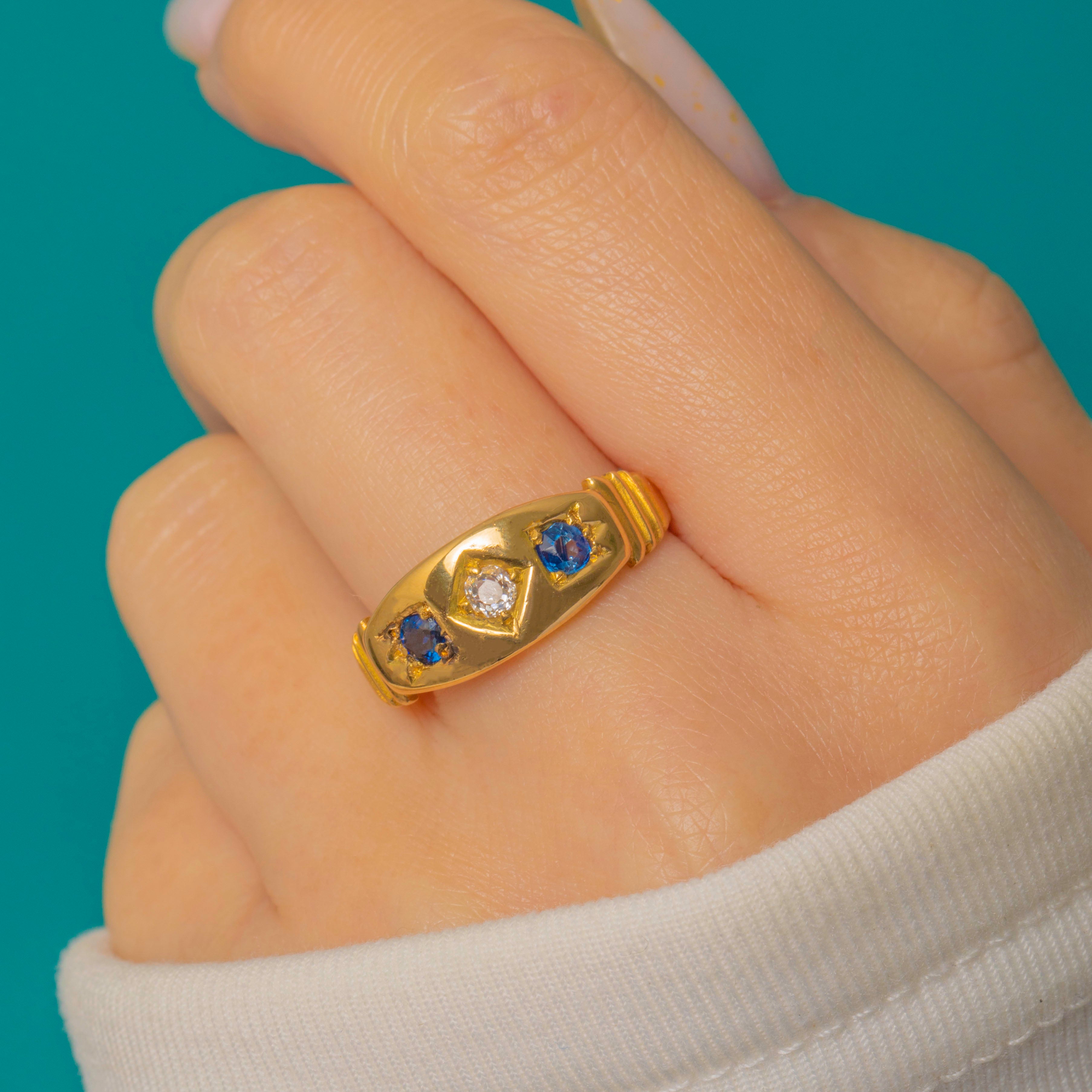 A classic Victorian three-stone gypsy ring in rich 18ct Gold, set with a lively Old Mine Cut Diamond flanked by two vivid Natural Sapphires. The low-profile, smooth gypsy setting offers effortless comfort while the trio of gems brings a refined pop of blue and antique sparkle.