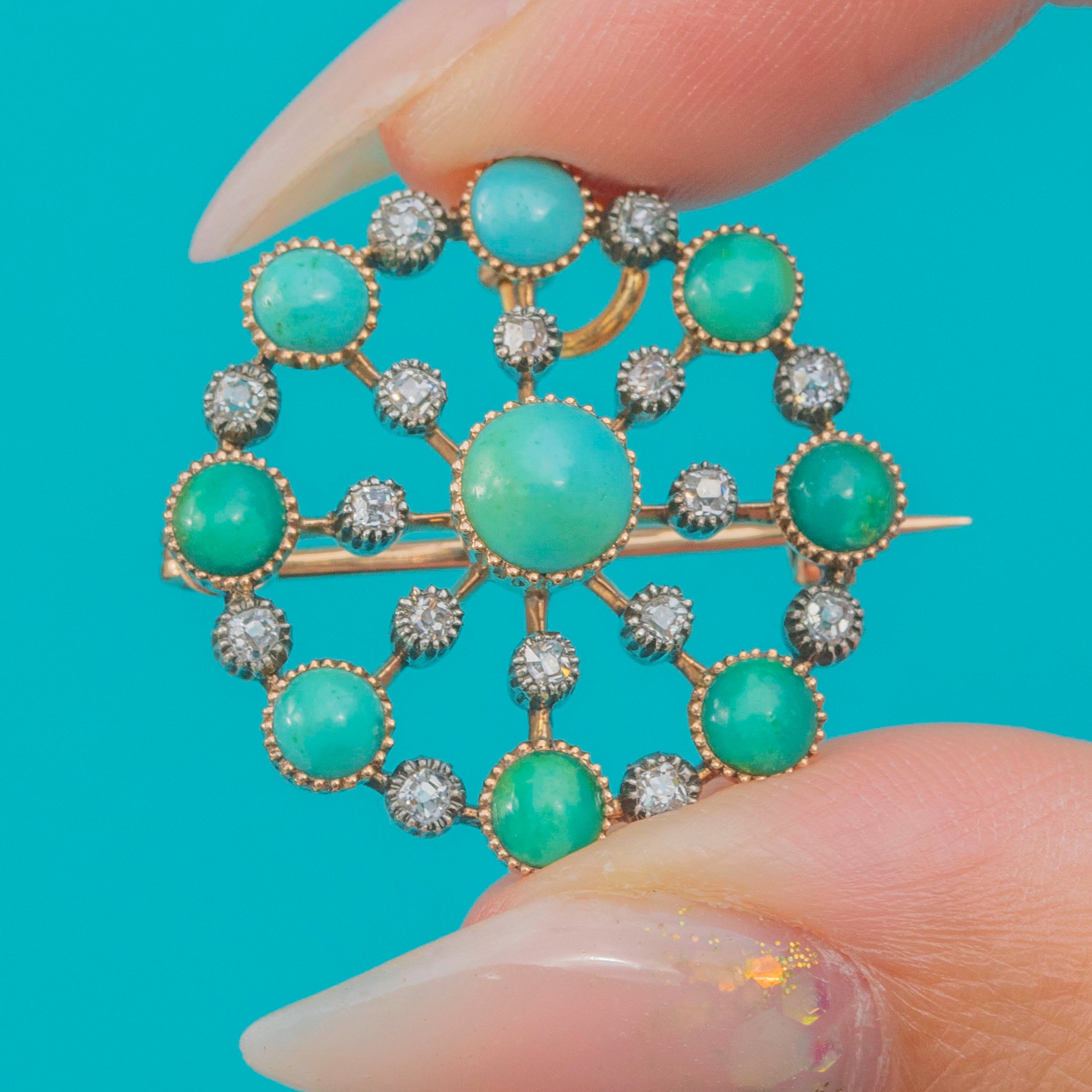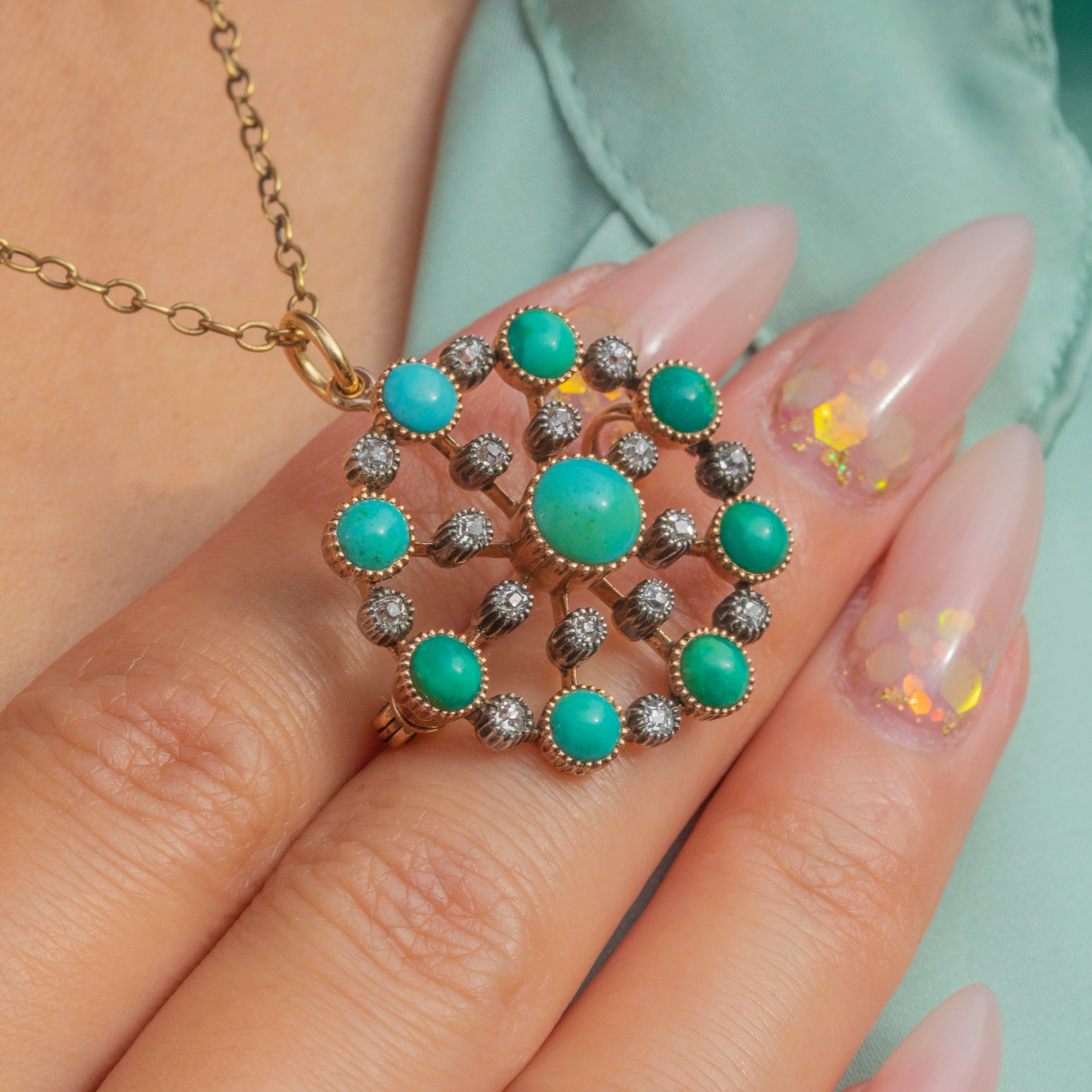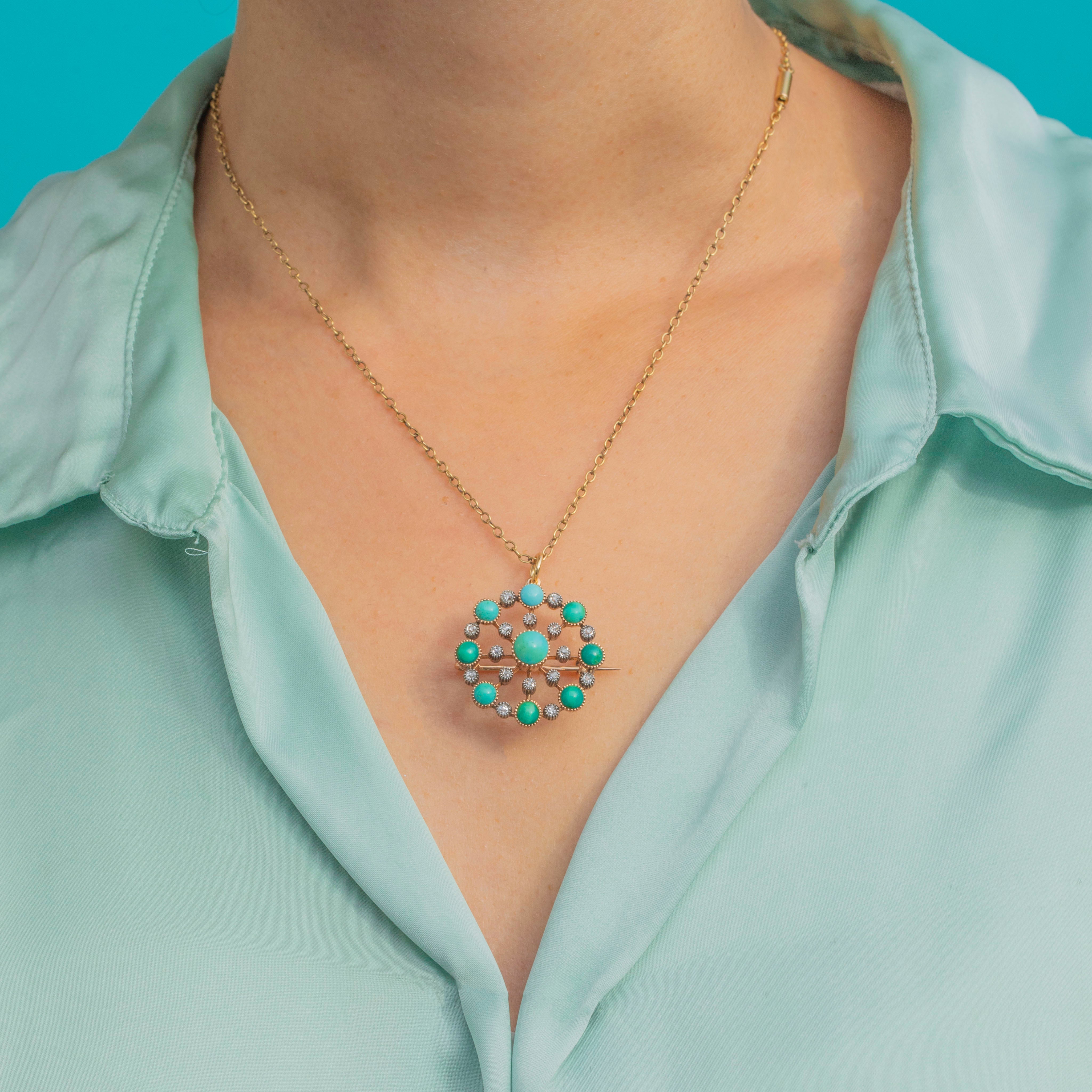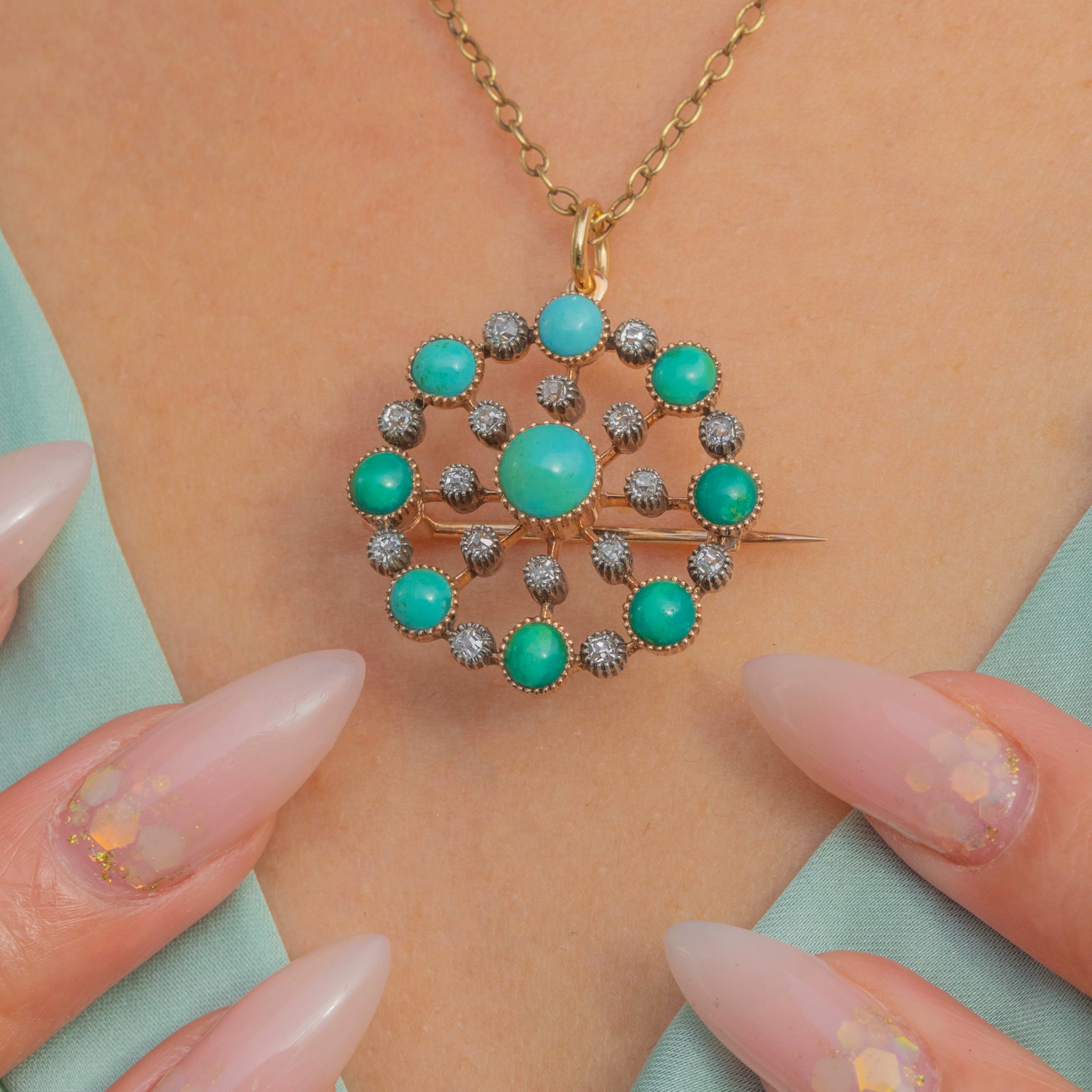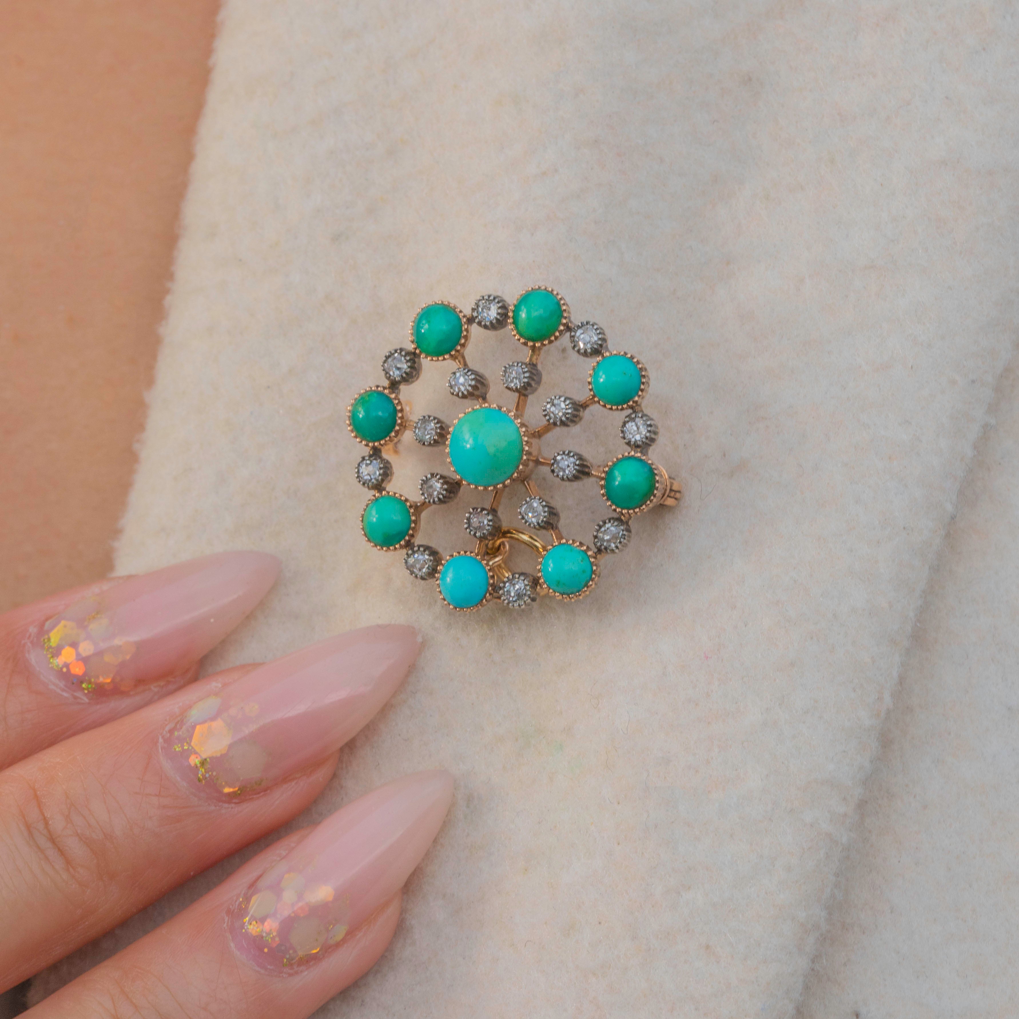 A stunning Victorian jewel crafted in rich 18ct Gold, designed as a circular pendant or brooch. The piece is set with vivid Turquoise cabochons in varying sizes, interspersed with 0.50cts of sparkling old-cut Diamonds in millegrain collets for a delicate lace-like effect. The craftsmanship and striking colour contrast make this jewel a true statement of Victorian elegance.