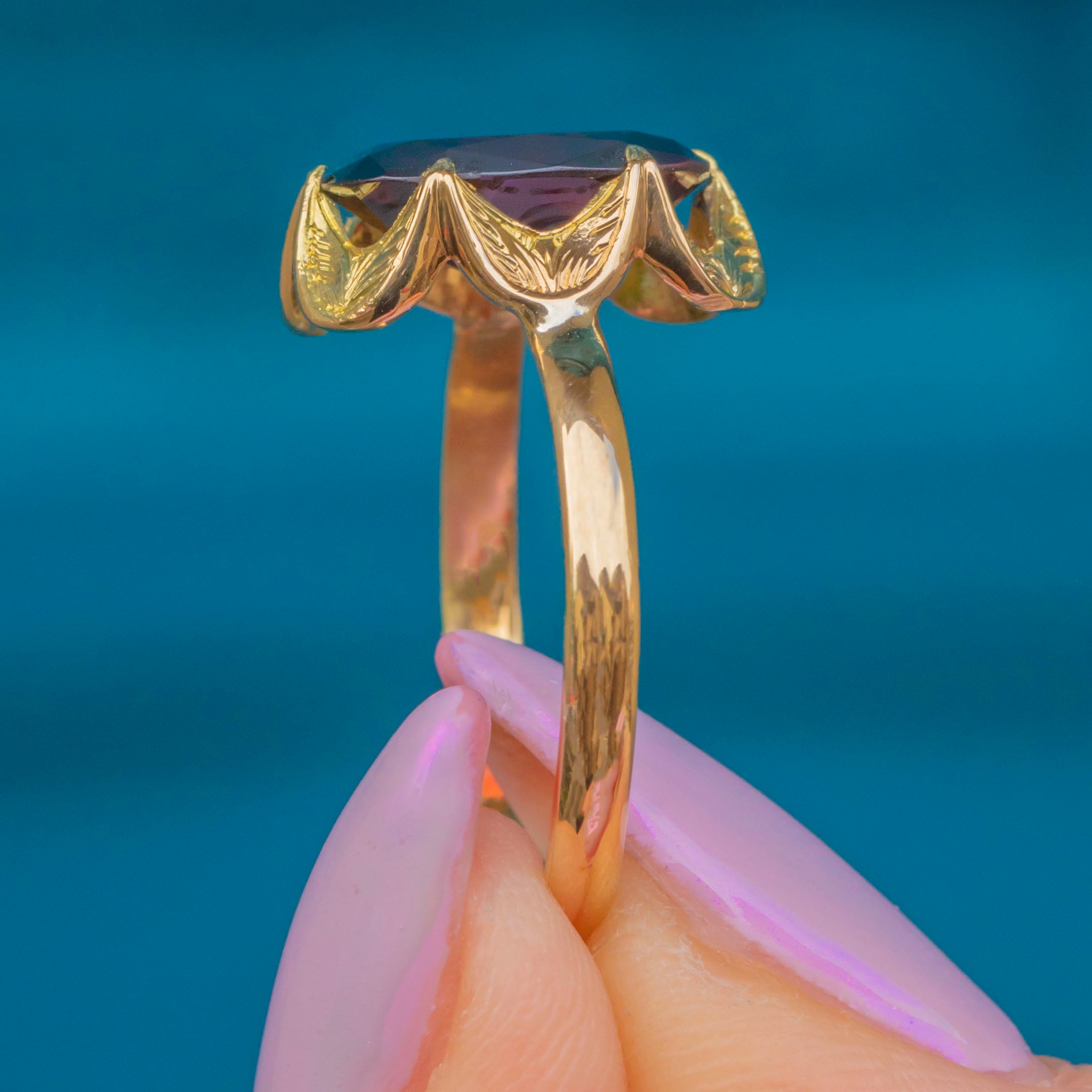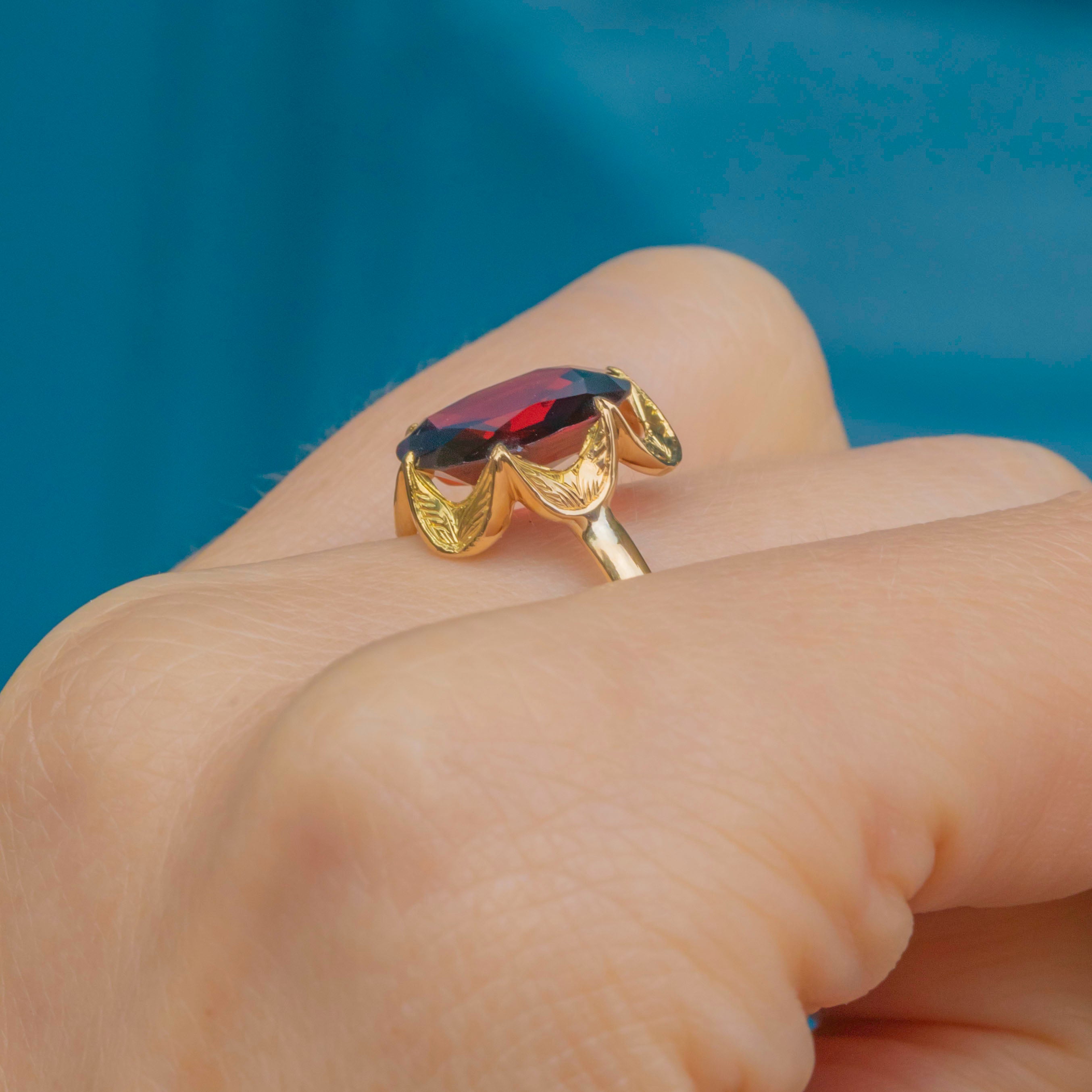 This striking Victorian ring showcases a richly coloured 6.00ct Garnet, glowing with deep wine-red tones that contrast beautifully against its buttery 18ct Gold setting. The gemstone is held within an ornate buttercup-style mount, its softly scalloped petals lending a romantic and feminine silhouette.
