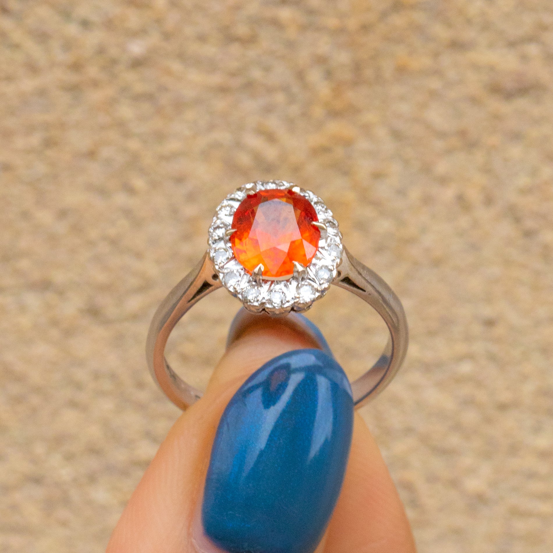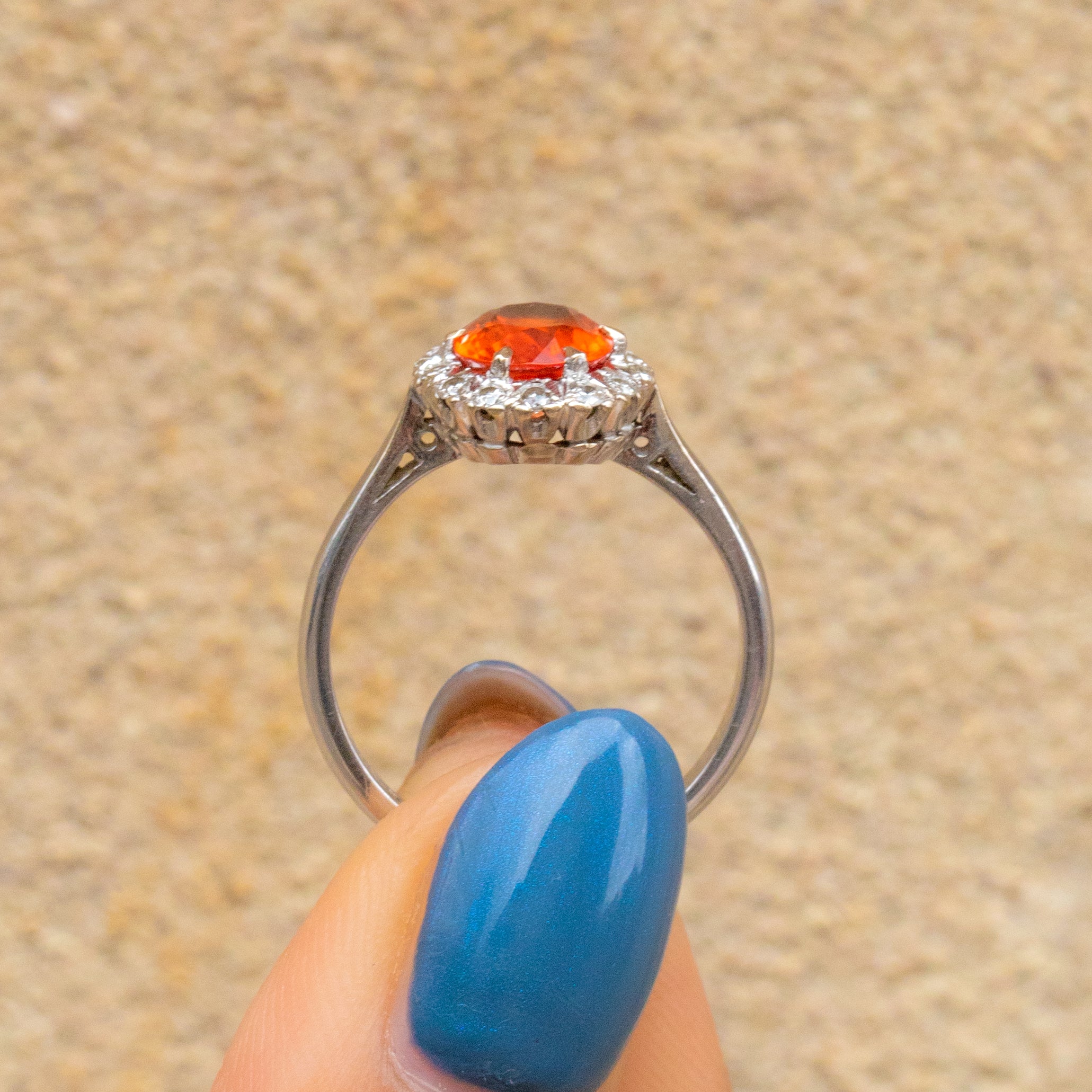 EXCELLENT. This 18ct White Gold Fire Opal Diamond cluster ring is in excellent condition. The Opal is vivid with a crisp set of facets and the Diamonds are bright, all of the gemstones are securely set and free from any signs of wear. The band has retained its form well and is robust, promising you many more years of wear and enjoyment!