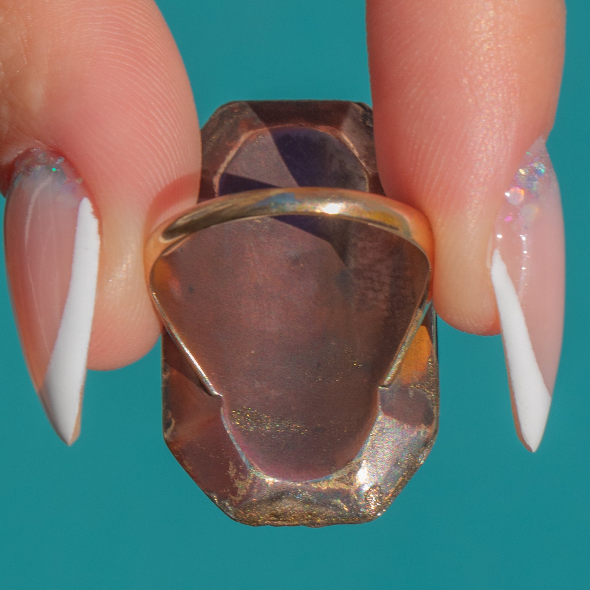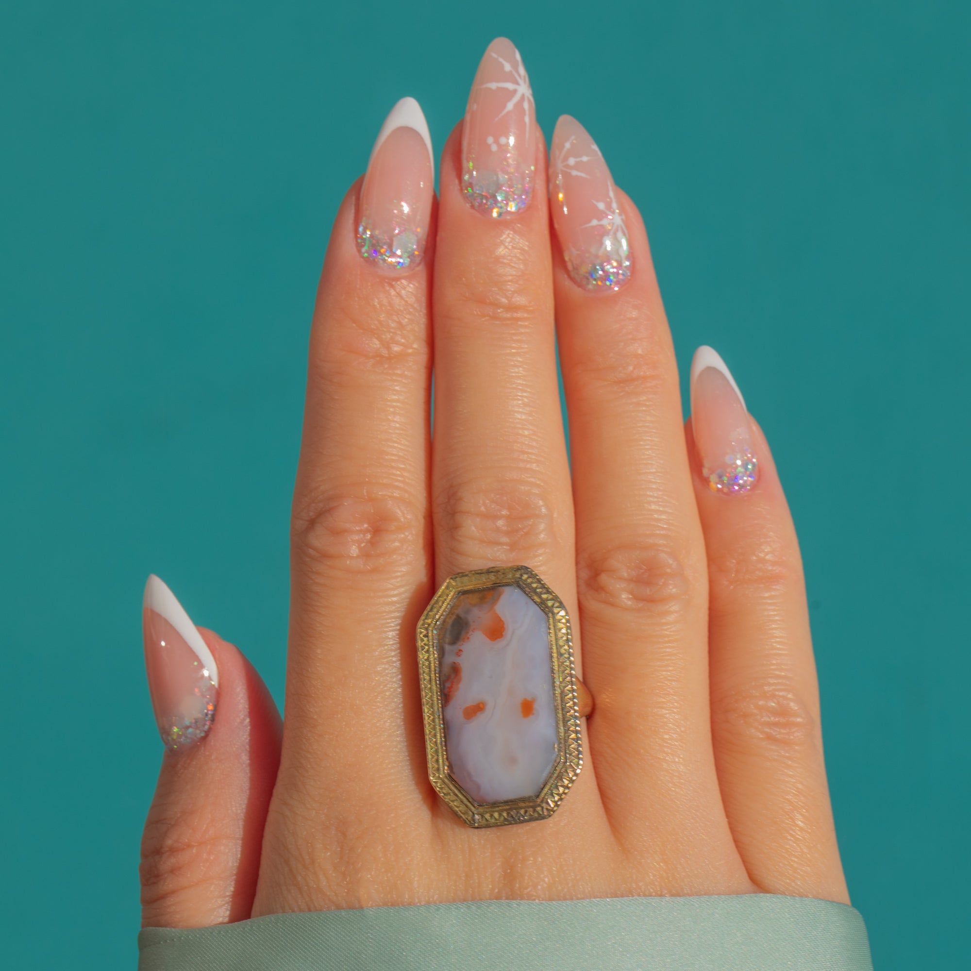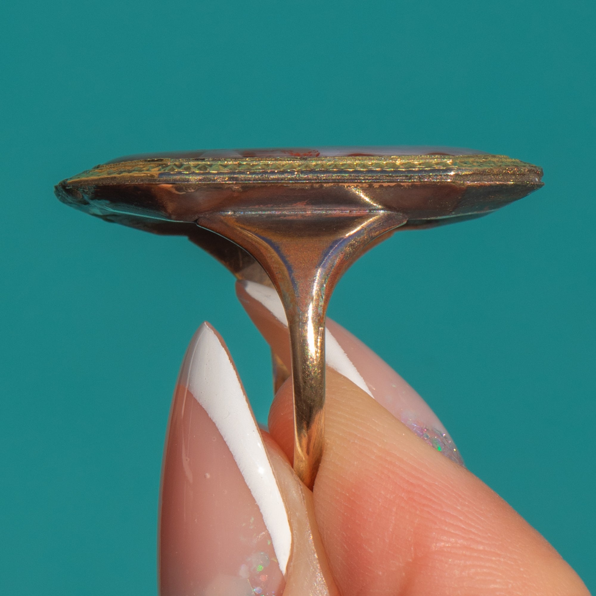 This rare French Georgian Agate ring is a lavish piece from the 18th century, with all the drama and romance you’d hope for from the Georgian era. The elongated rectangular panel frames a beautiful natural Agate, swirling with soft lilac-grey tones and fiery orange inclusions that look like little flames drifting through mist.