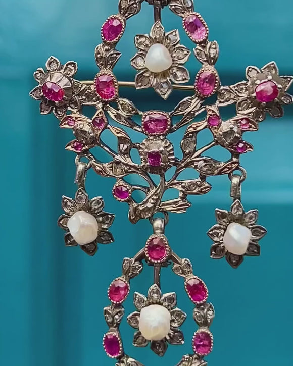 EXCELLENT. This 18th century Georgian Iberian Ruby Diamond Pearl pendant is in excellent condition. Given the age of this piece, it's in remarkable condition. The pendant has beautiful subtly pink-toned Rubies, as well as rose-cut Diamonds and Baroque Pearls. The only wear to note is to the back of the piece, where the Silver has worn down throughout its more than 250 year lifespan, exposing the backs of some of the Rubies, but they remain secure. The brooch fitting works perfectly and the bottom drop and detachable pendant function work beautifully together to give you the utmost versatility in wear.