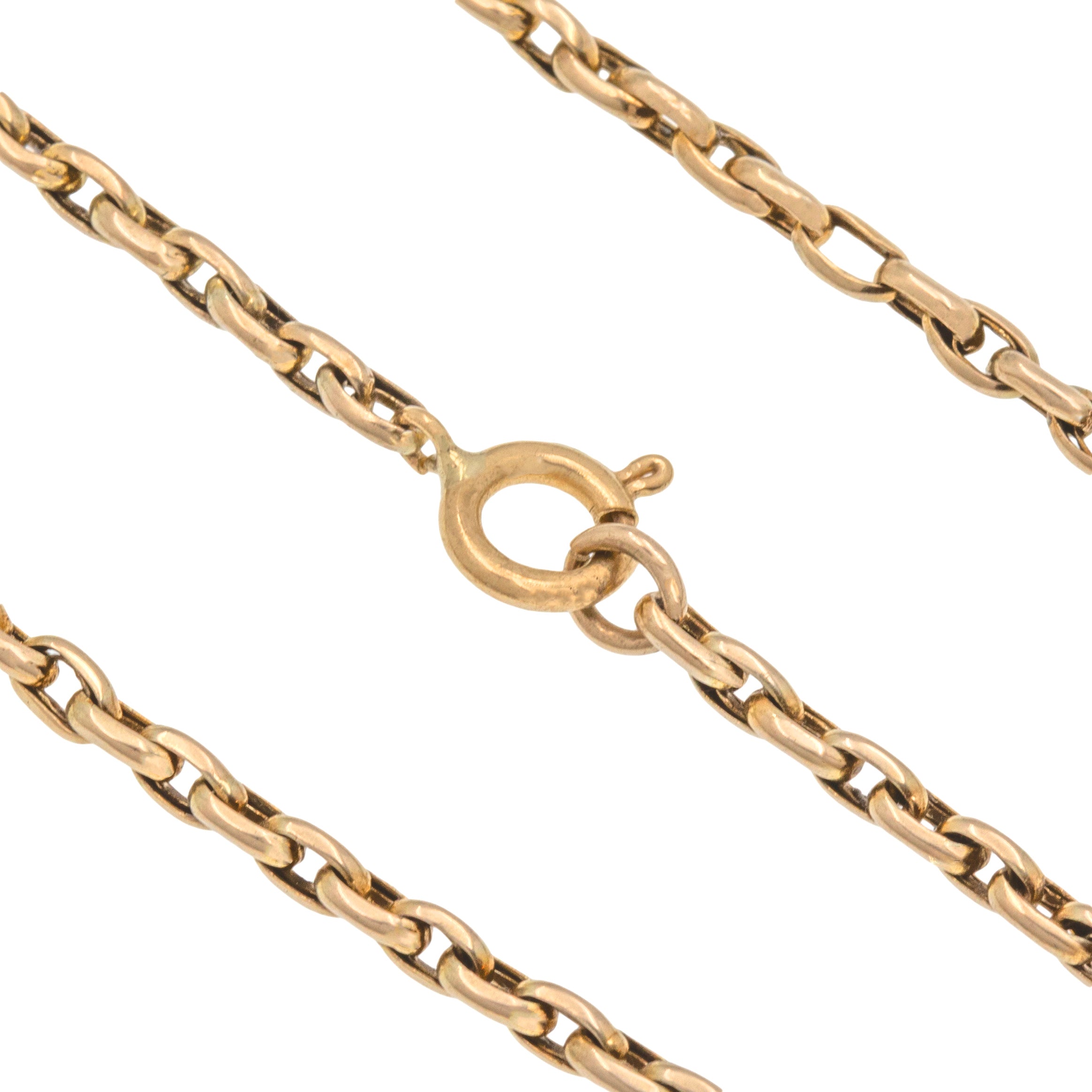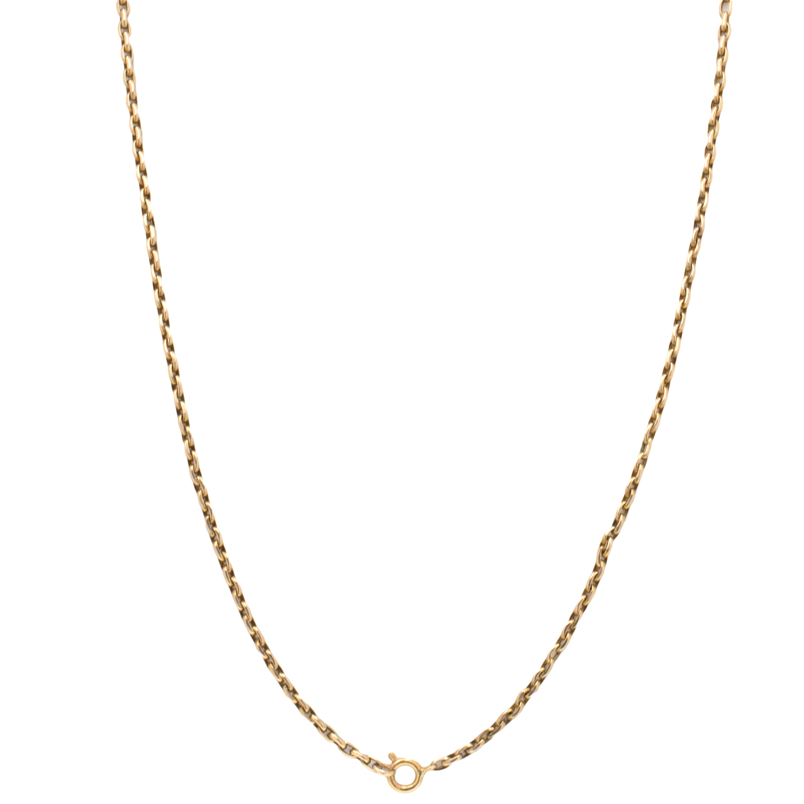 EXCELLENT. This 19" antique 9ct Gold belcher chain is in excellent condition. Her links have maintained great form throughout, with no dings or dents to note. The necklace possess a beautifully glossy finish throughout, and the bolt-ring spring mechanism is in perfect working condition, allowing you a secure affix around your neck. She is truly a dream!