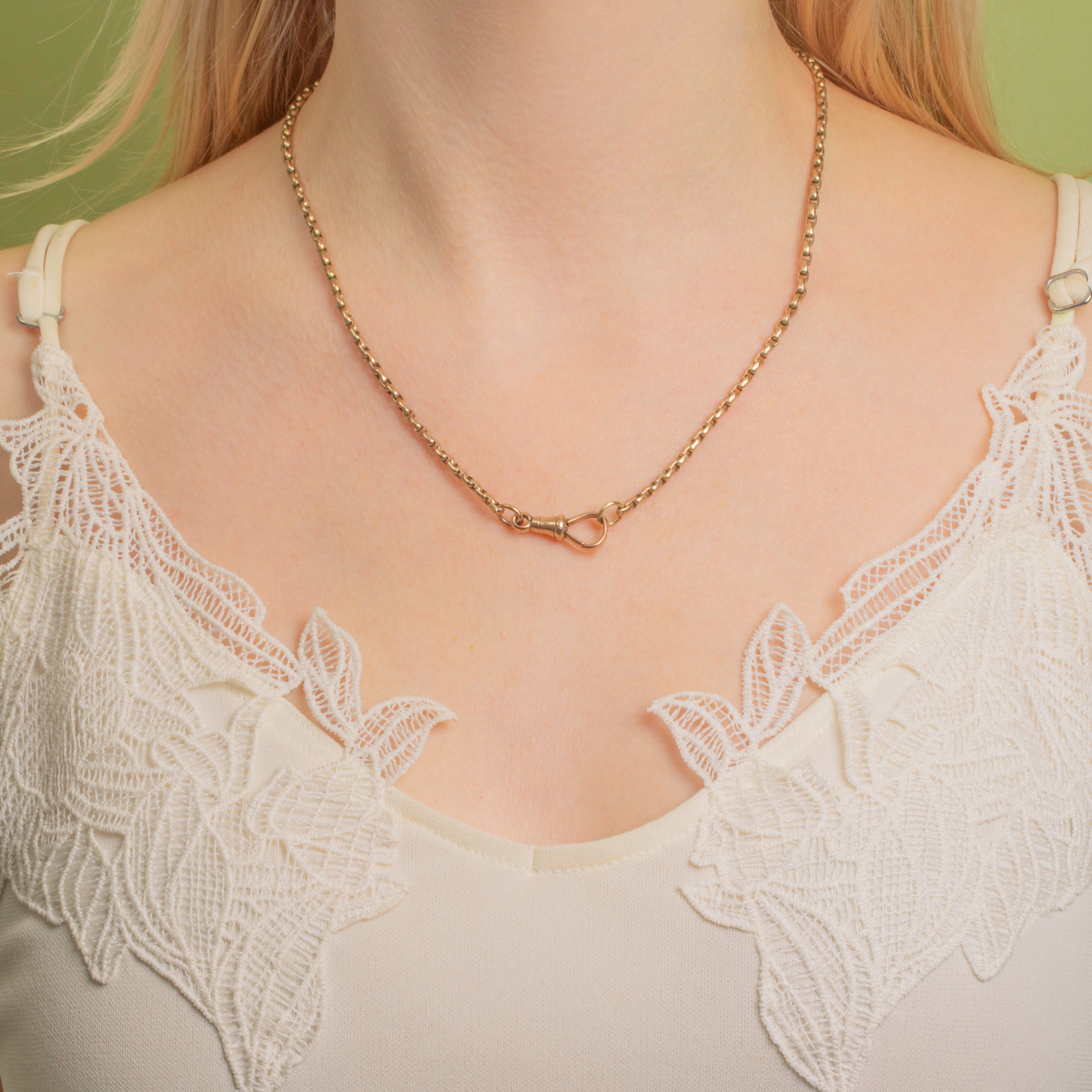 EXCELLENT. With little to report, this 19" antique 9ct Gold belcher chain is in excellent condition! Each link remains secure and her 9ct Gold has a rich buttery hue. The dog clip fastens securely, ensuring confident wear at all times. You'll find yourself reaching for this Victorian Gold chain time and time again.