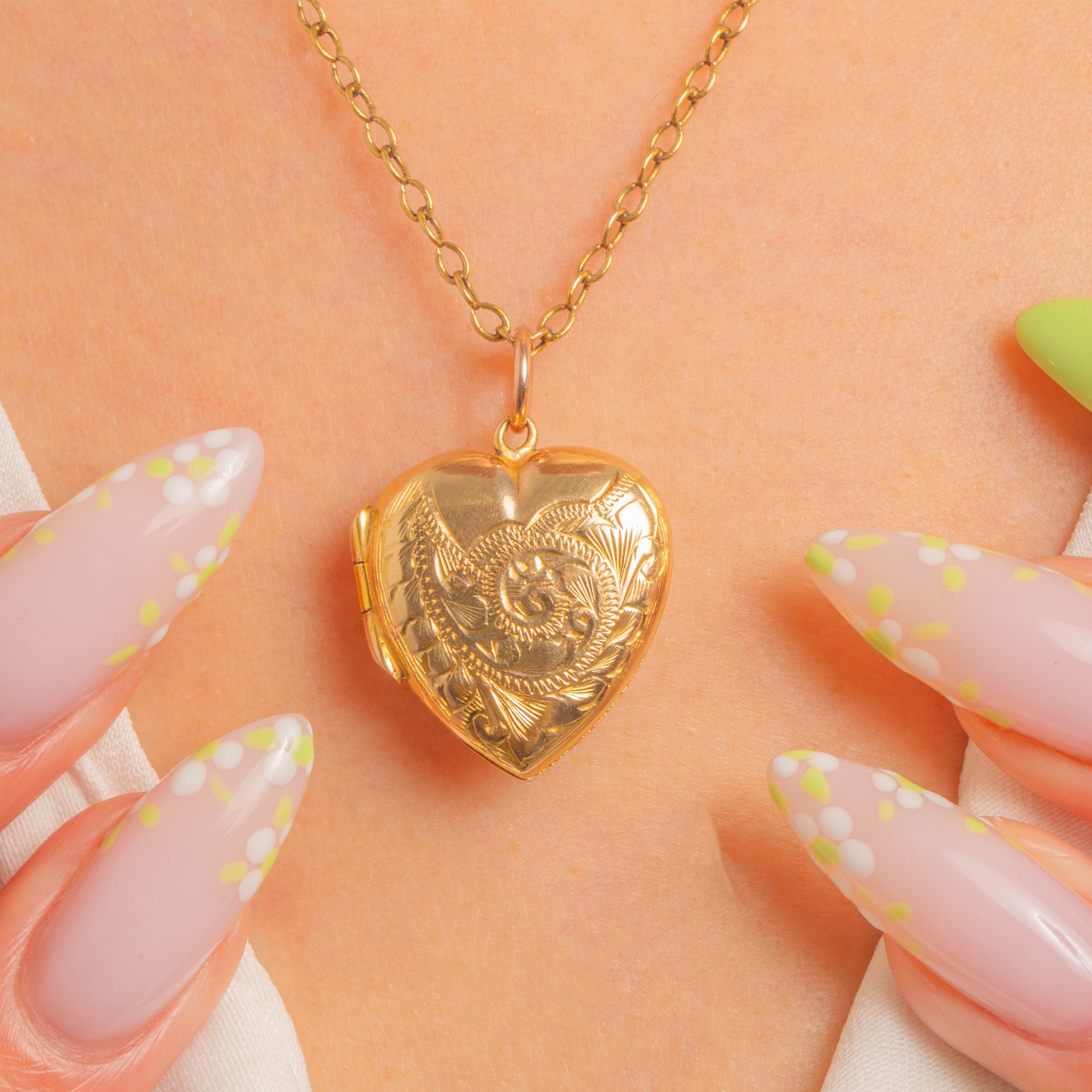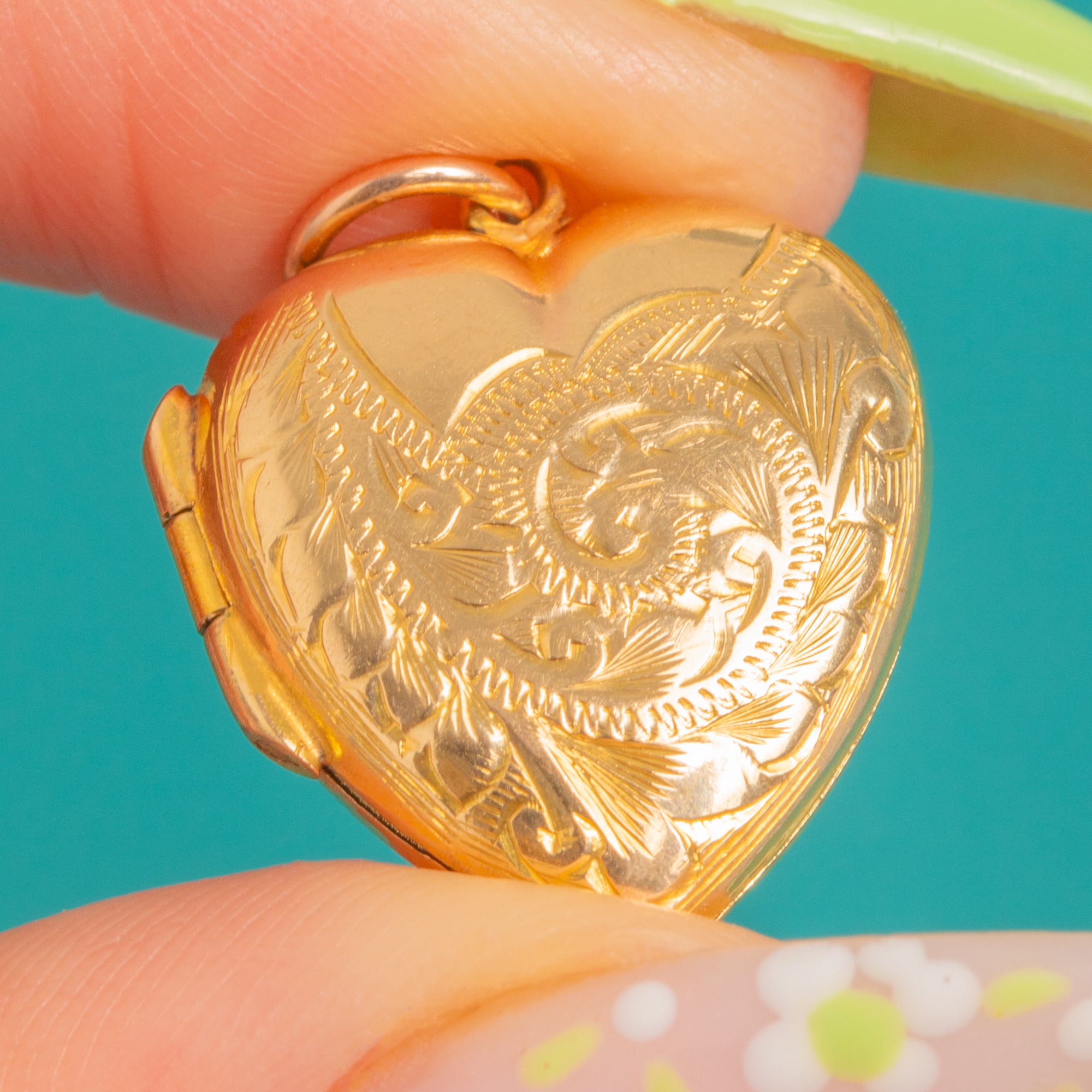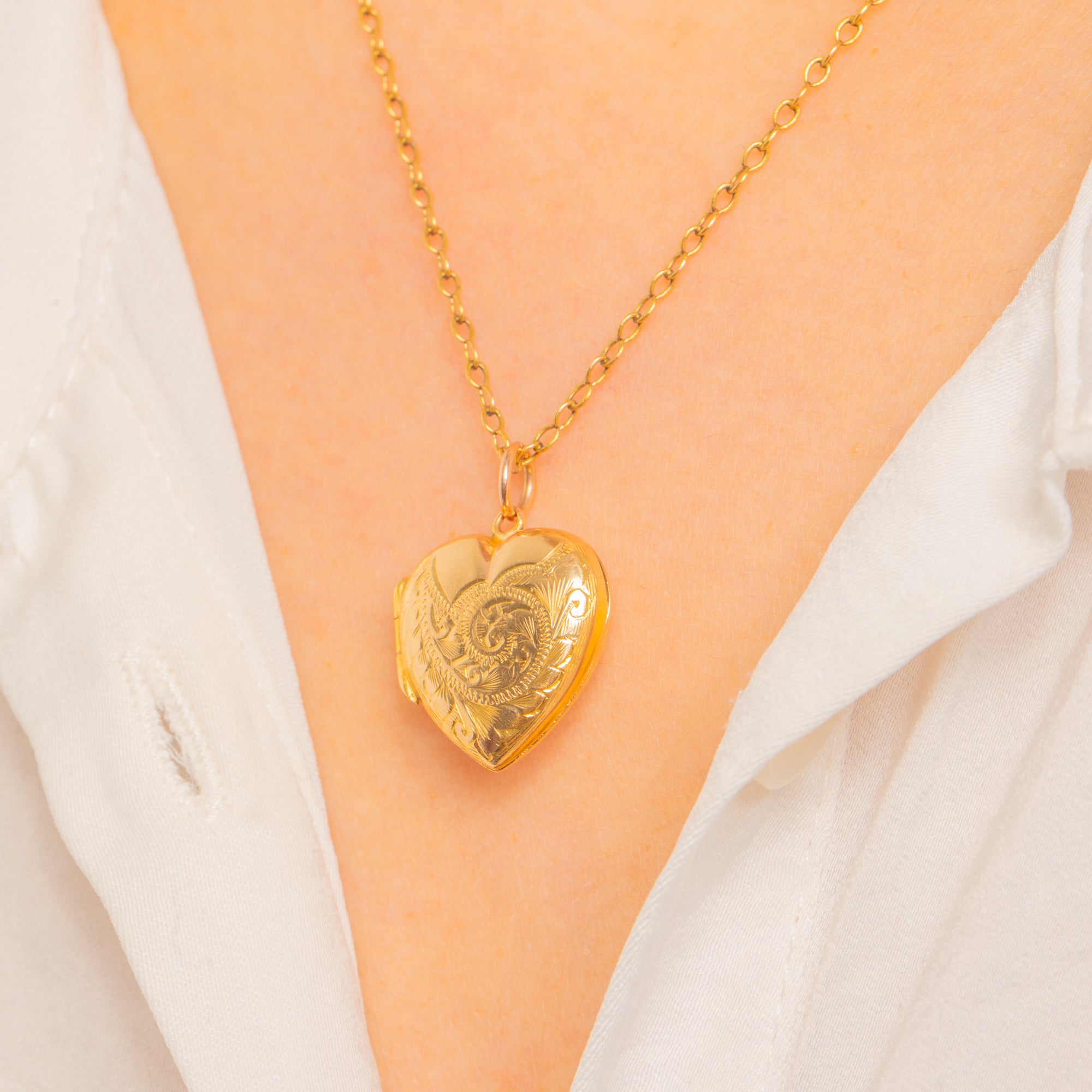 A petite puffy heart locket in 9ct Gold back and front, richly engraved with scrolling foliage and a sweet central rosette. Its softly domed profile and bright polish catch the light beautifully, while the delicate engraving adds an intimate, romantic touch.
