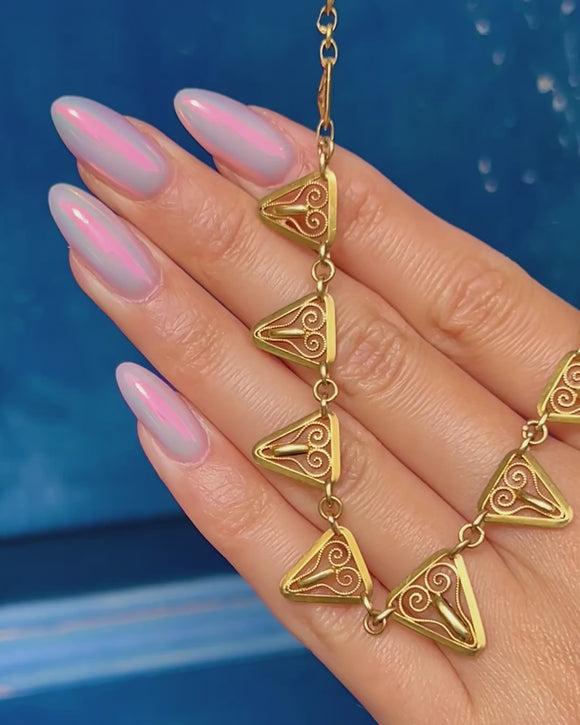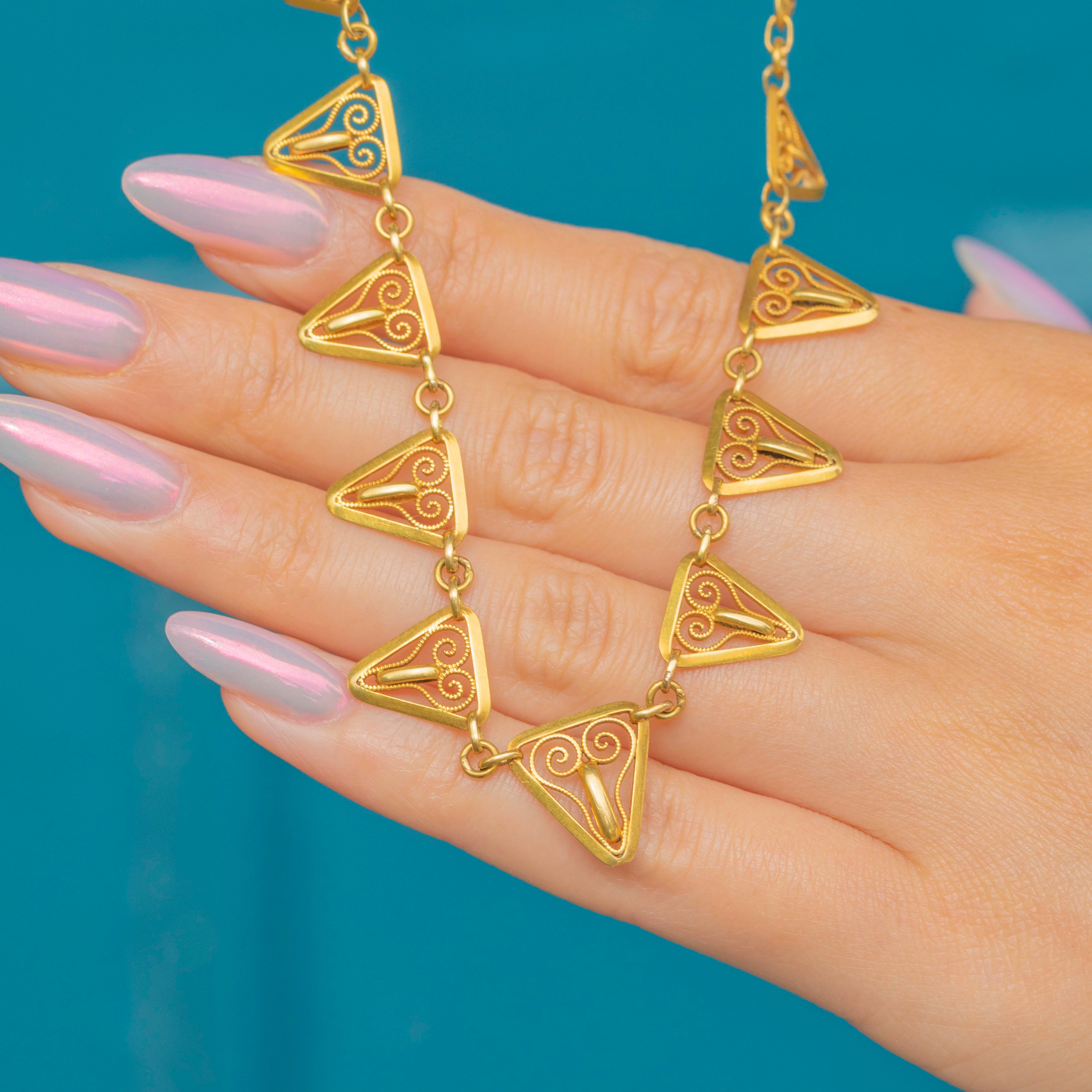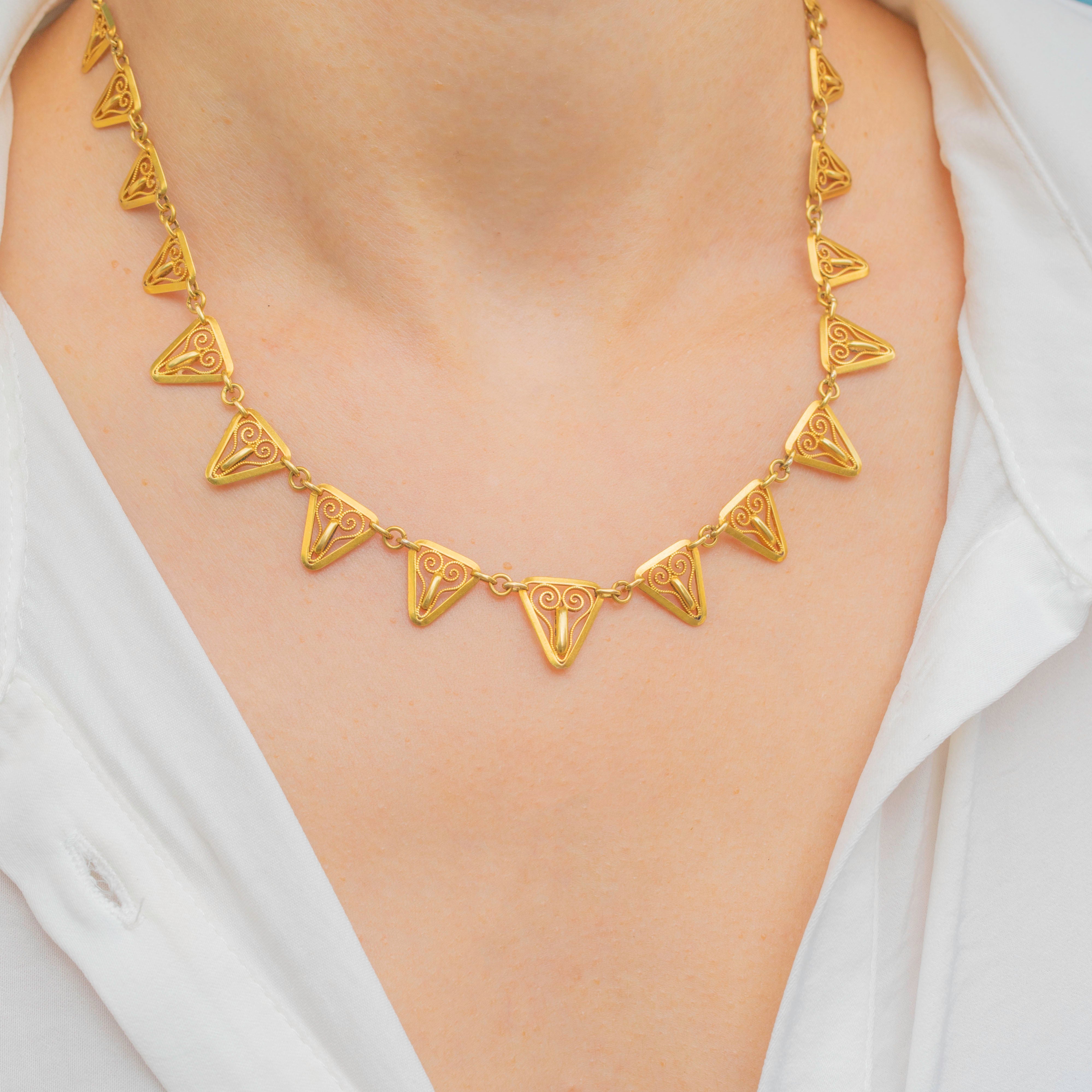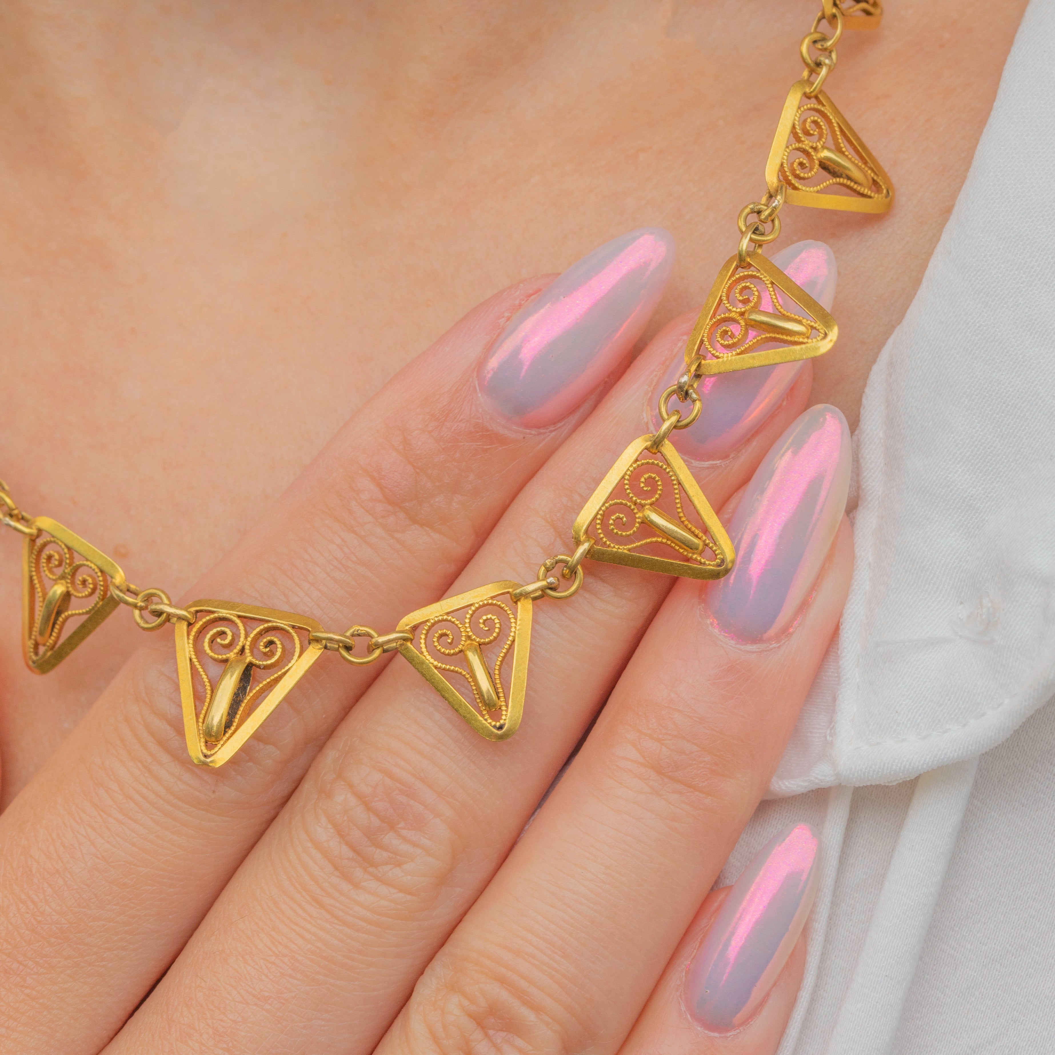 VERY GOOD: This French Art Deco necklace is in very good condition. The fan-shaped links have kept their shape beautifully and are securely connected, with their filigree details remaining intact. The bolt ring, while a tiny bit loose, still closes well, allowing you to wear this antique Gold necklace with confidence.