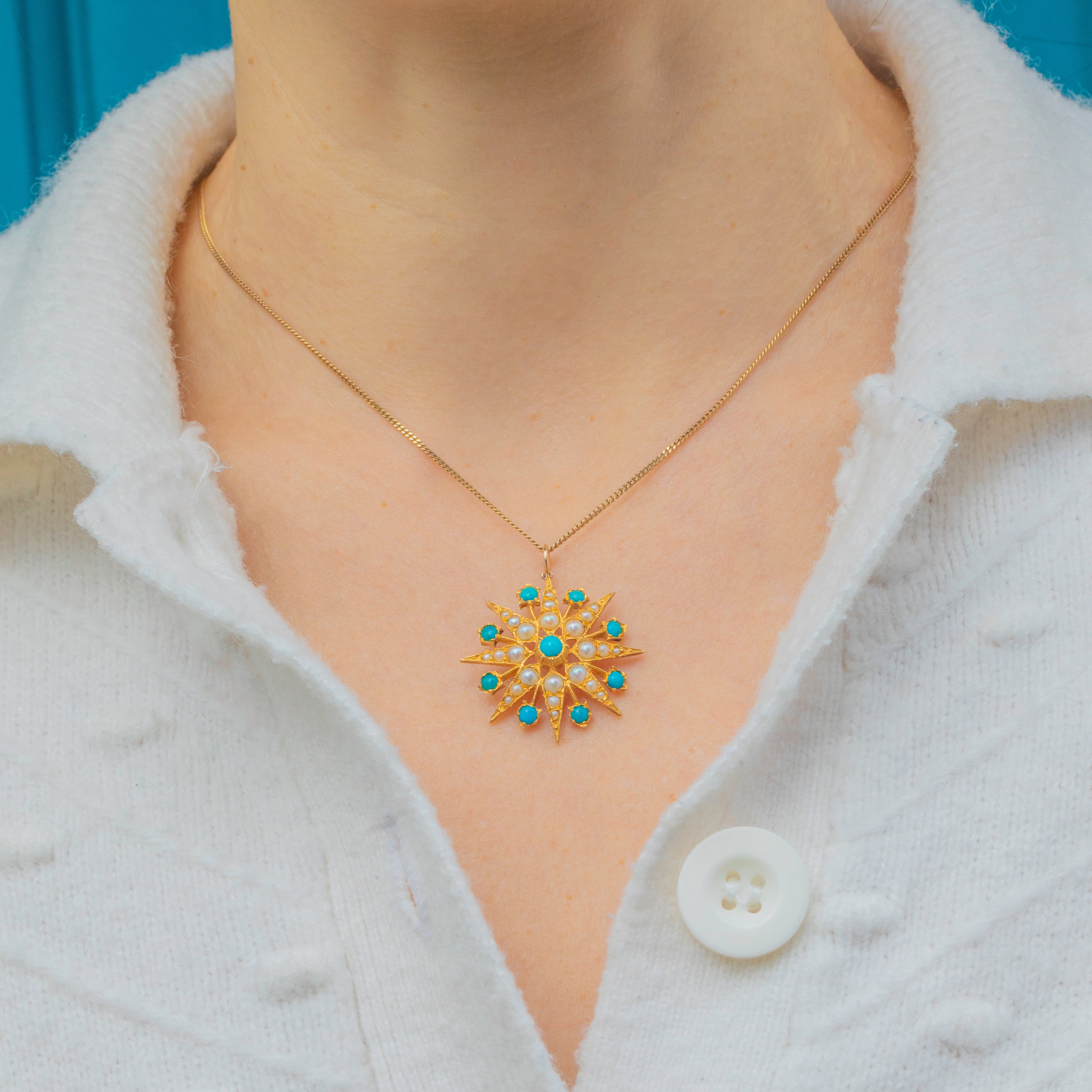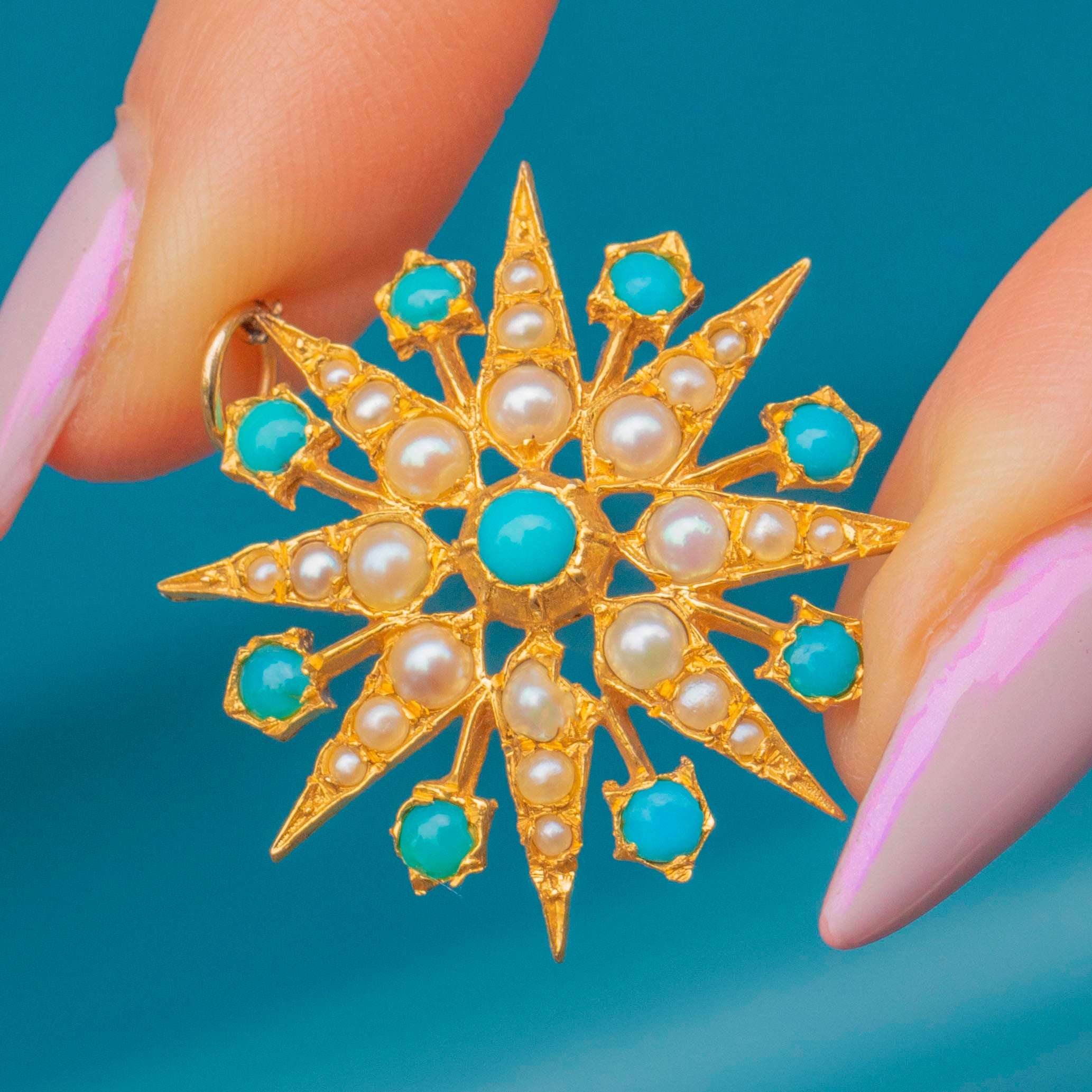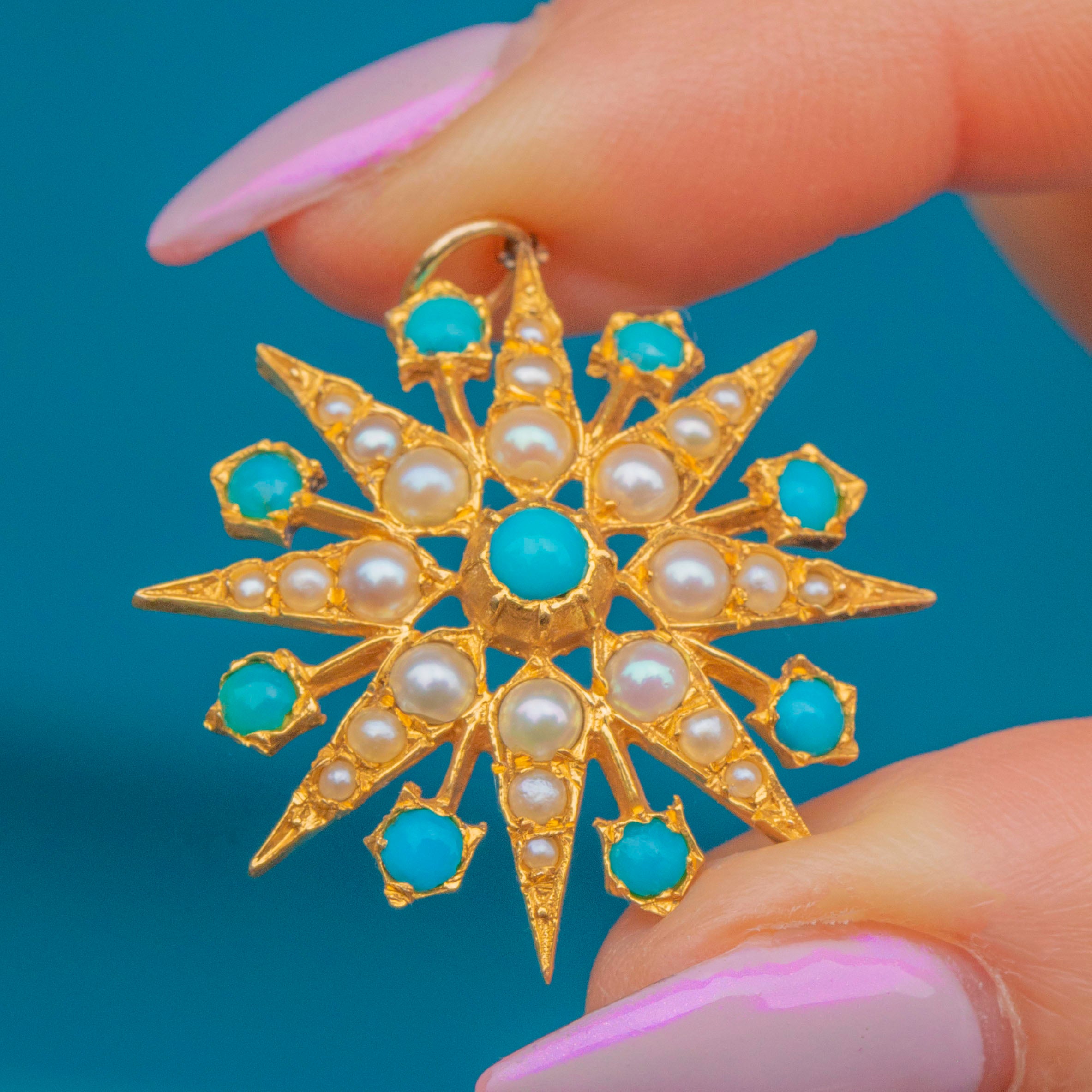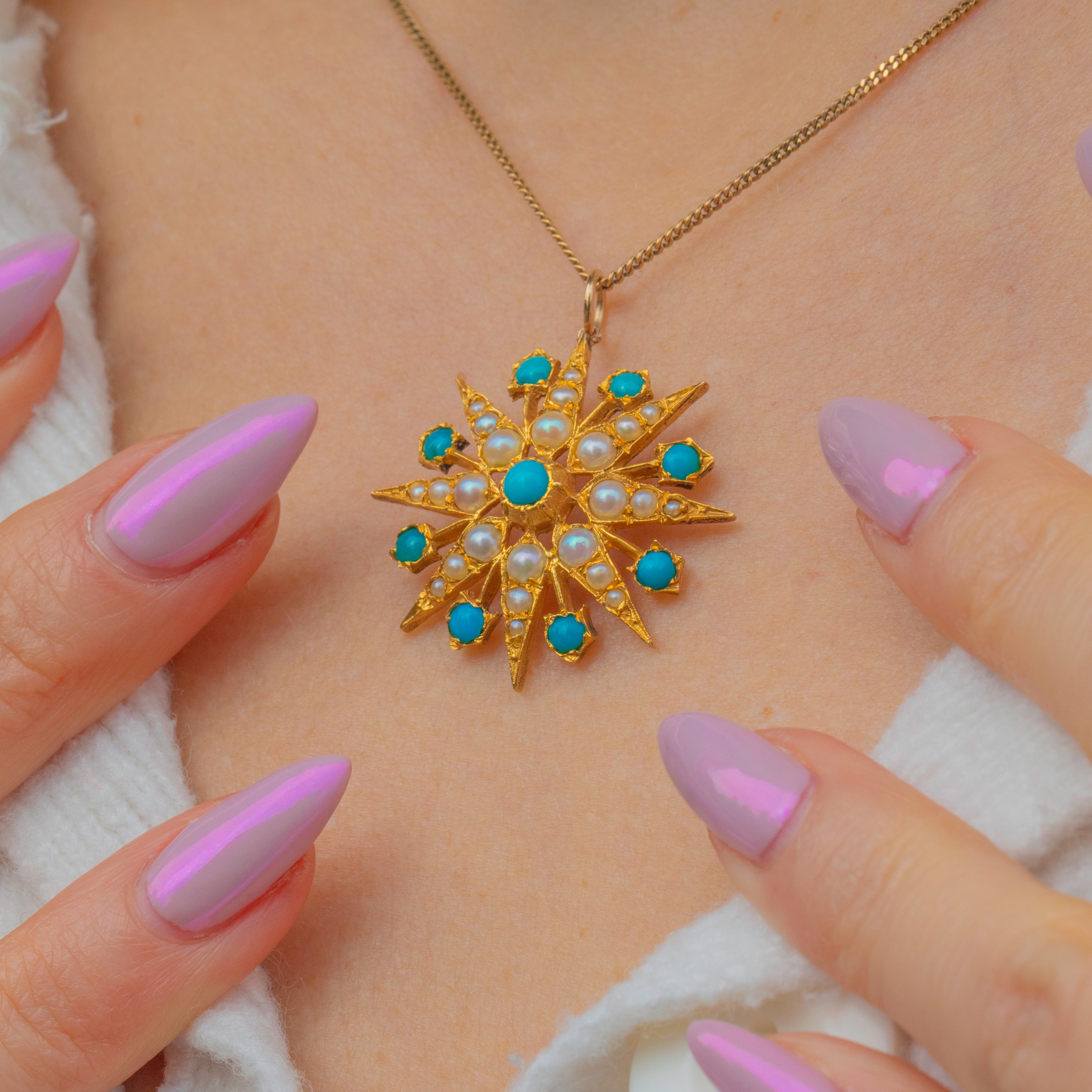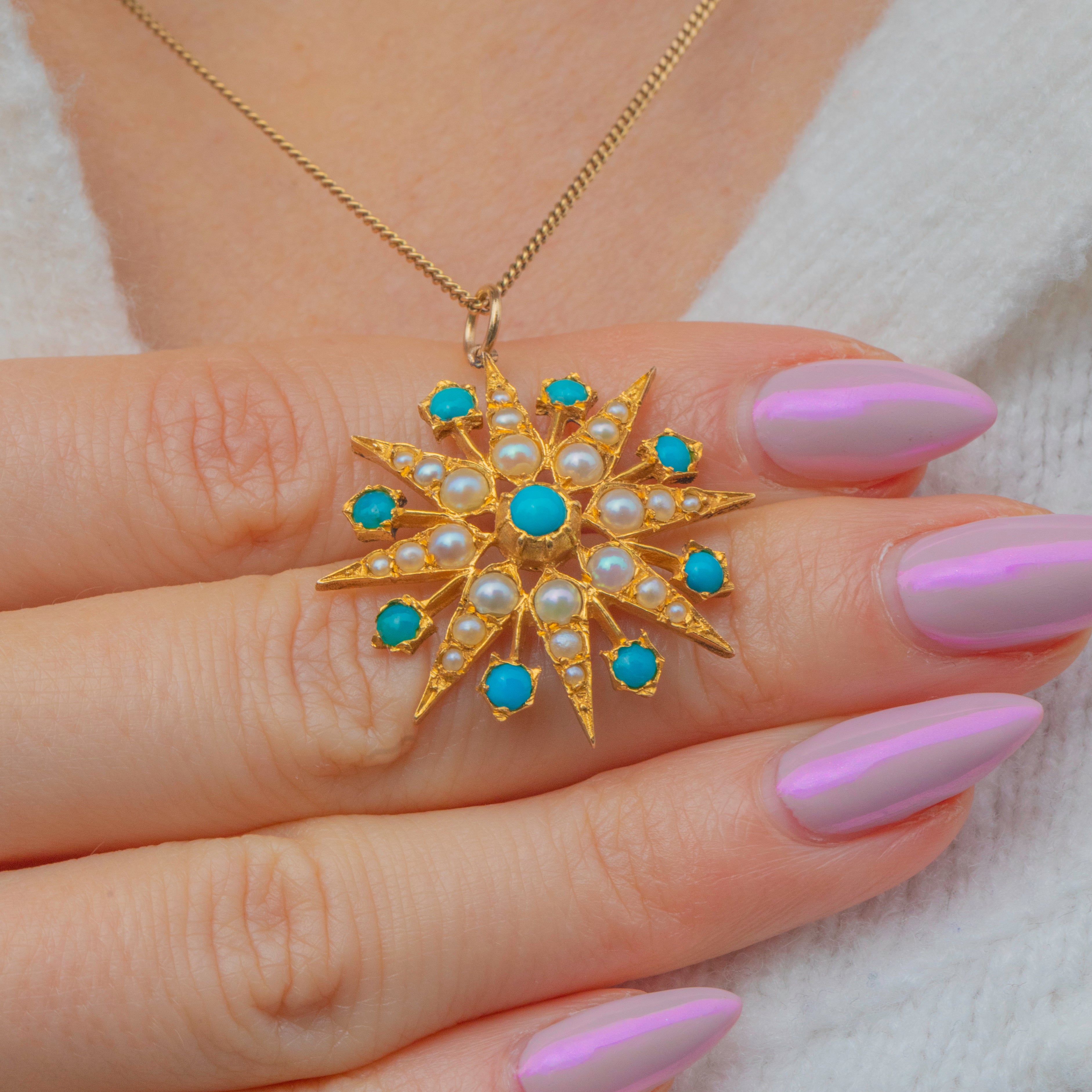 A stunning mid-century 9ct Gold star pendant set with bright Turquoise and lustrous Pearls. The beautiful openwork design radiates with vintage charm, each arm of the star alternating between creamy Pearls and vibrant blue Turquoise cabochons.