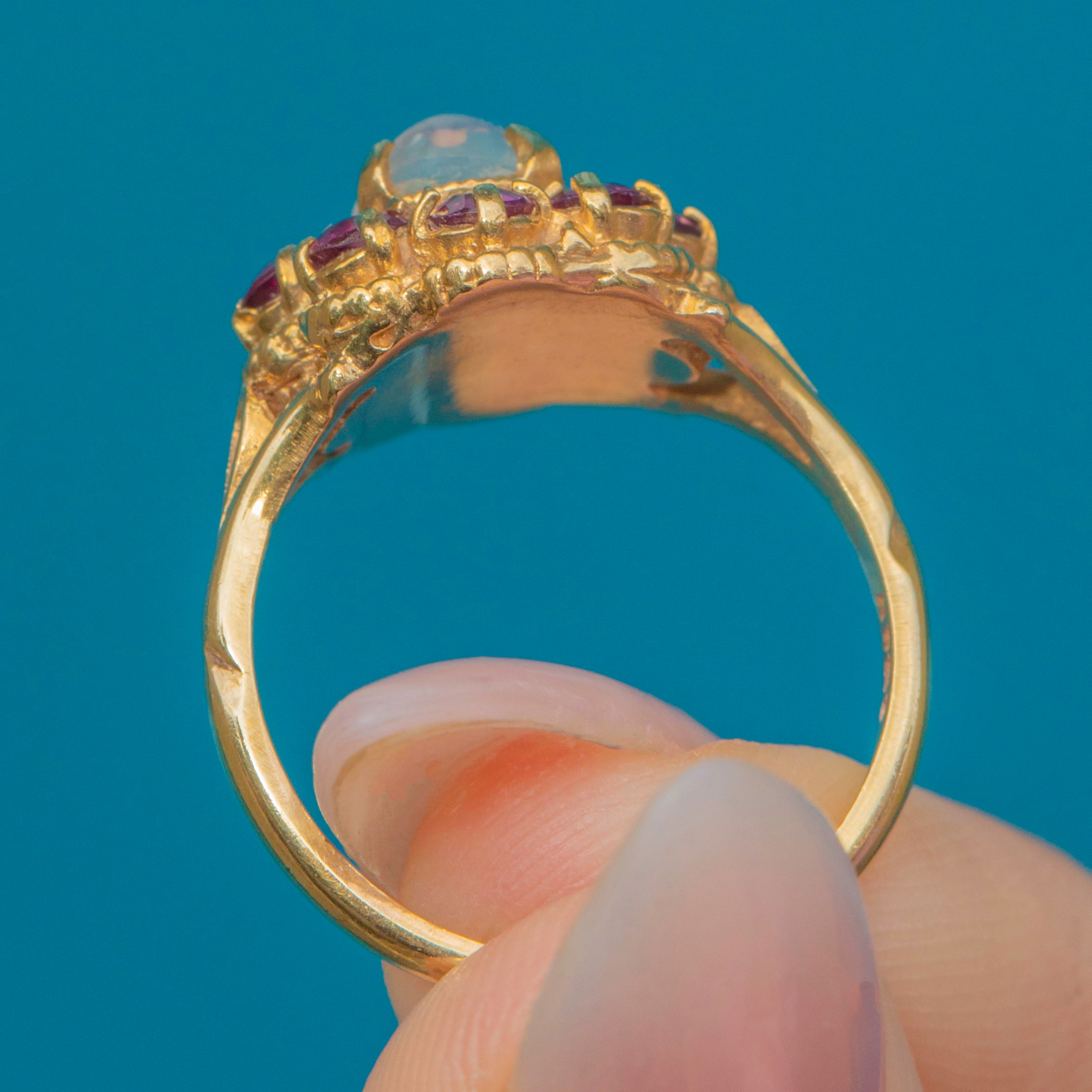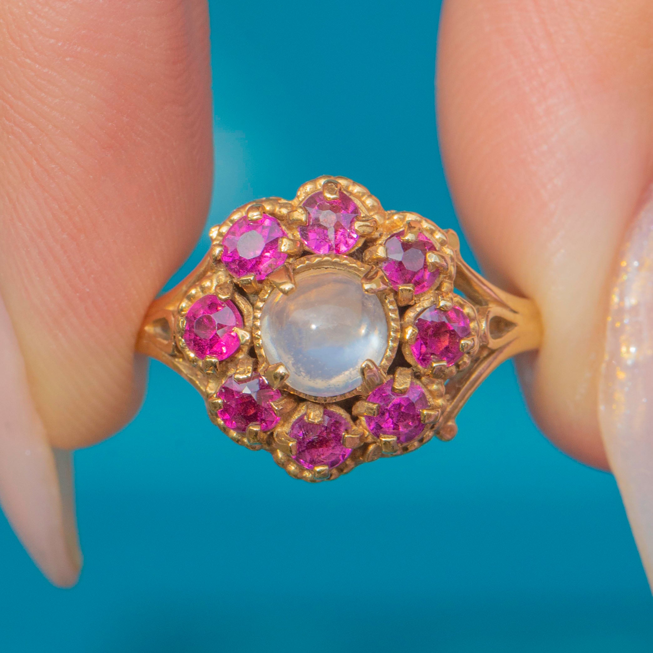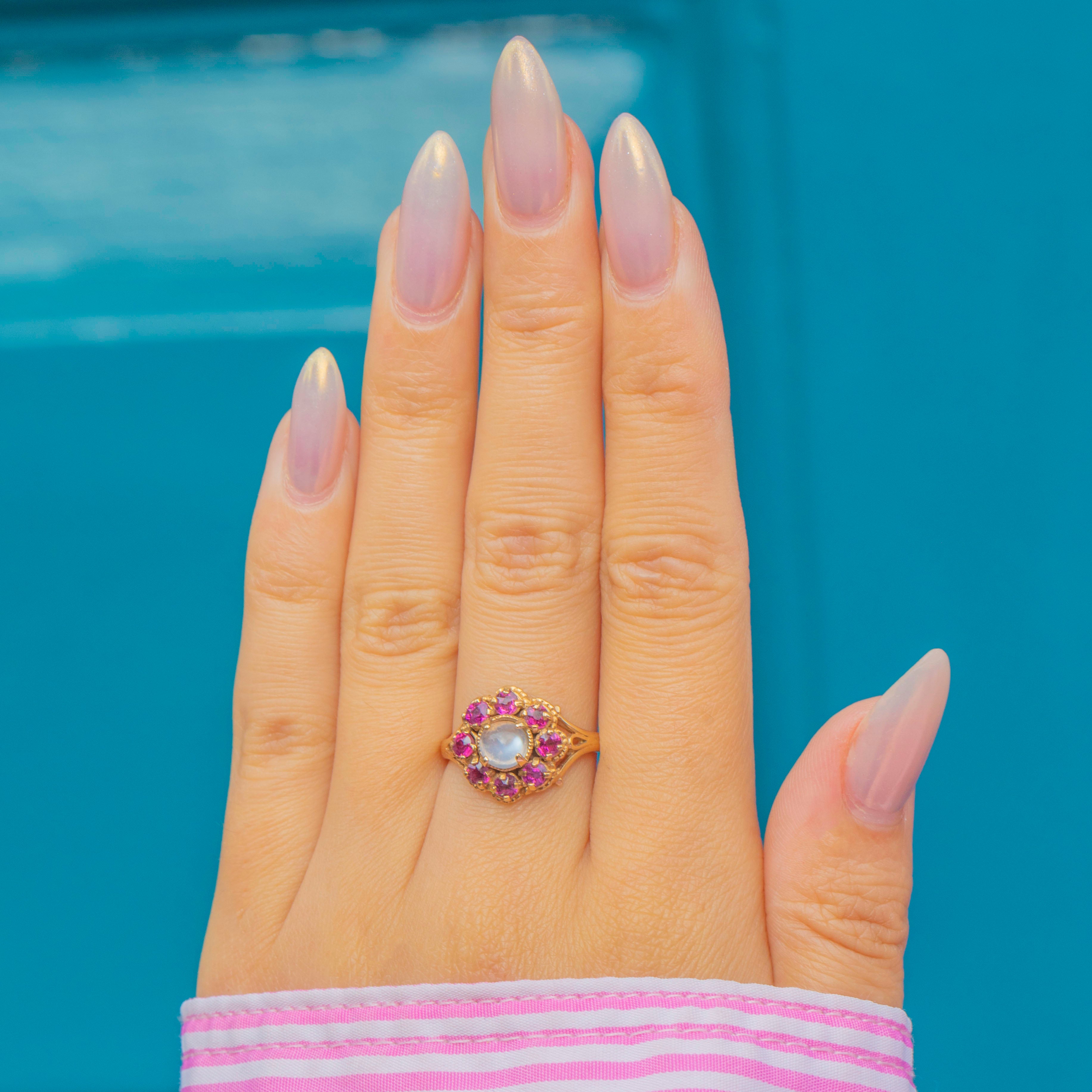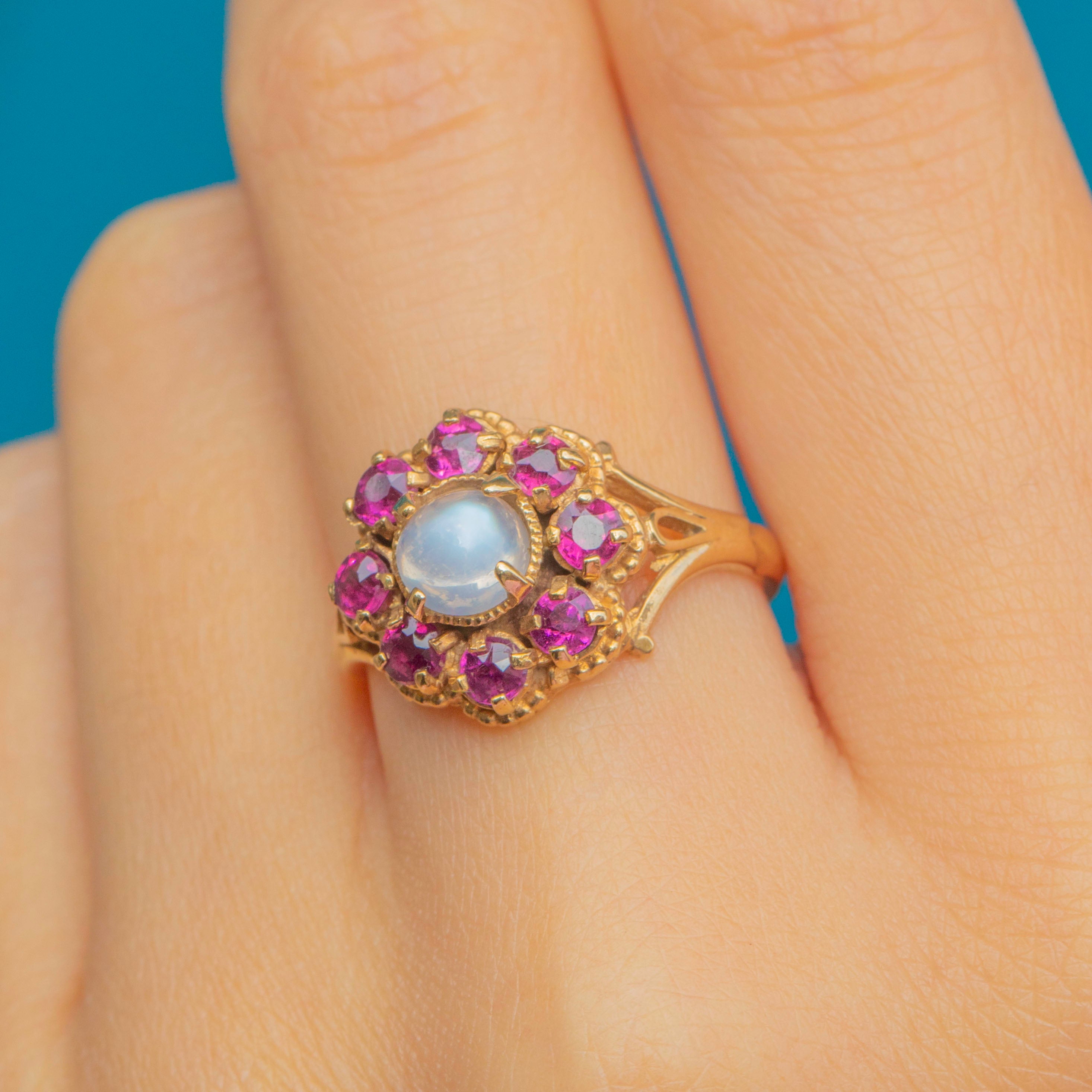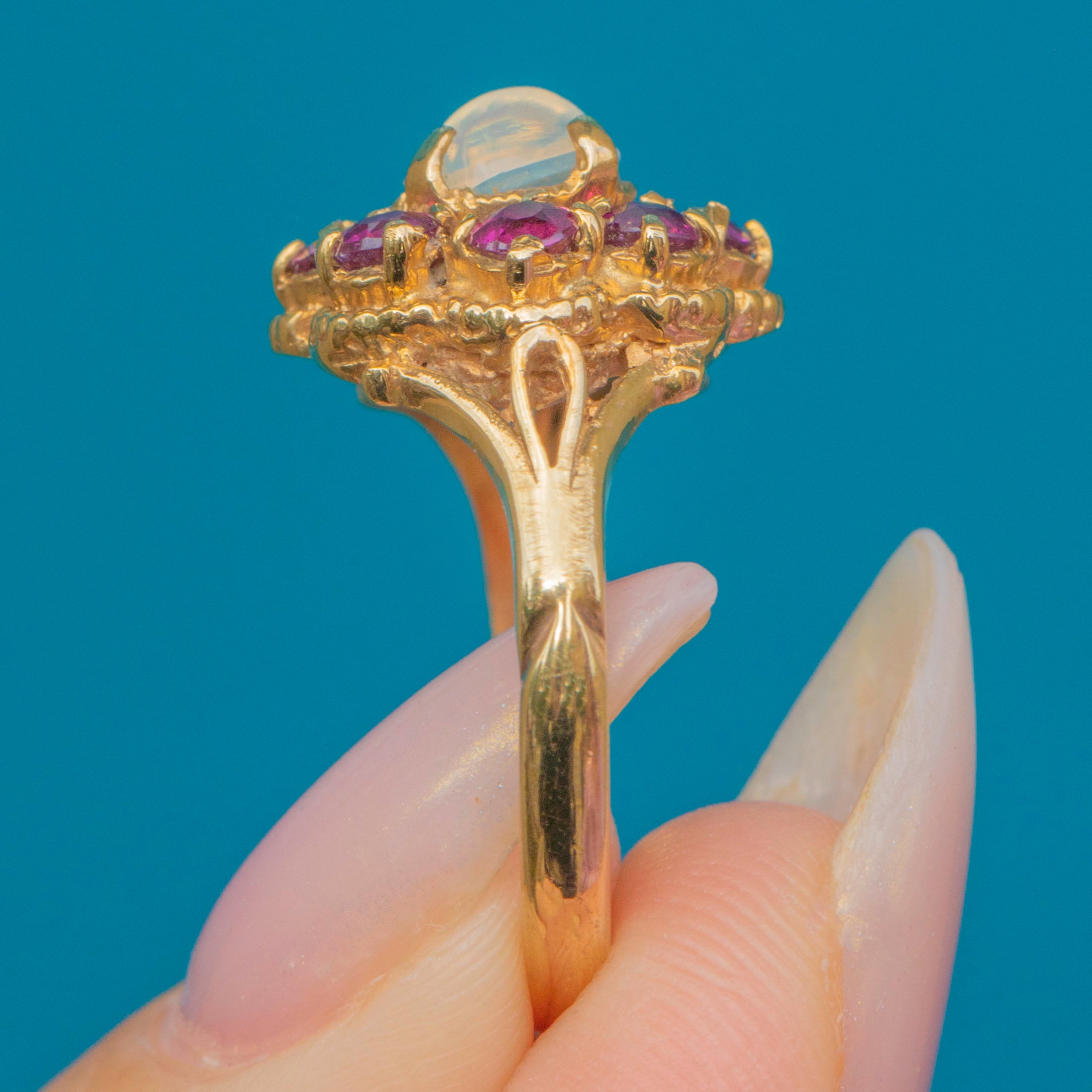 This striking Vintage cluster ring is set with a glowing cabochon Moonstone at its heart, surrounded by a vibrant halo of hot pinkish-purple Garnets. The combination of the ethereal Moonstone and the rich Garnets creates a bold yet romantic contrast, full of personality and charm. The 9ct Gold setting features intricate openwork shoulders, adding a delicate touch to the strong cluster design.