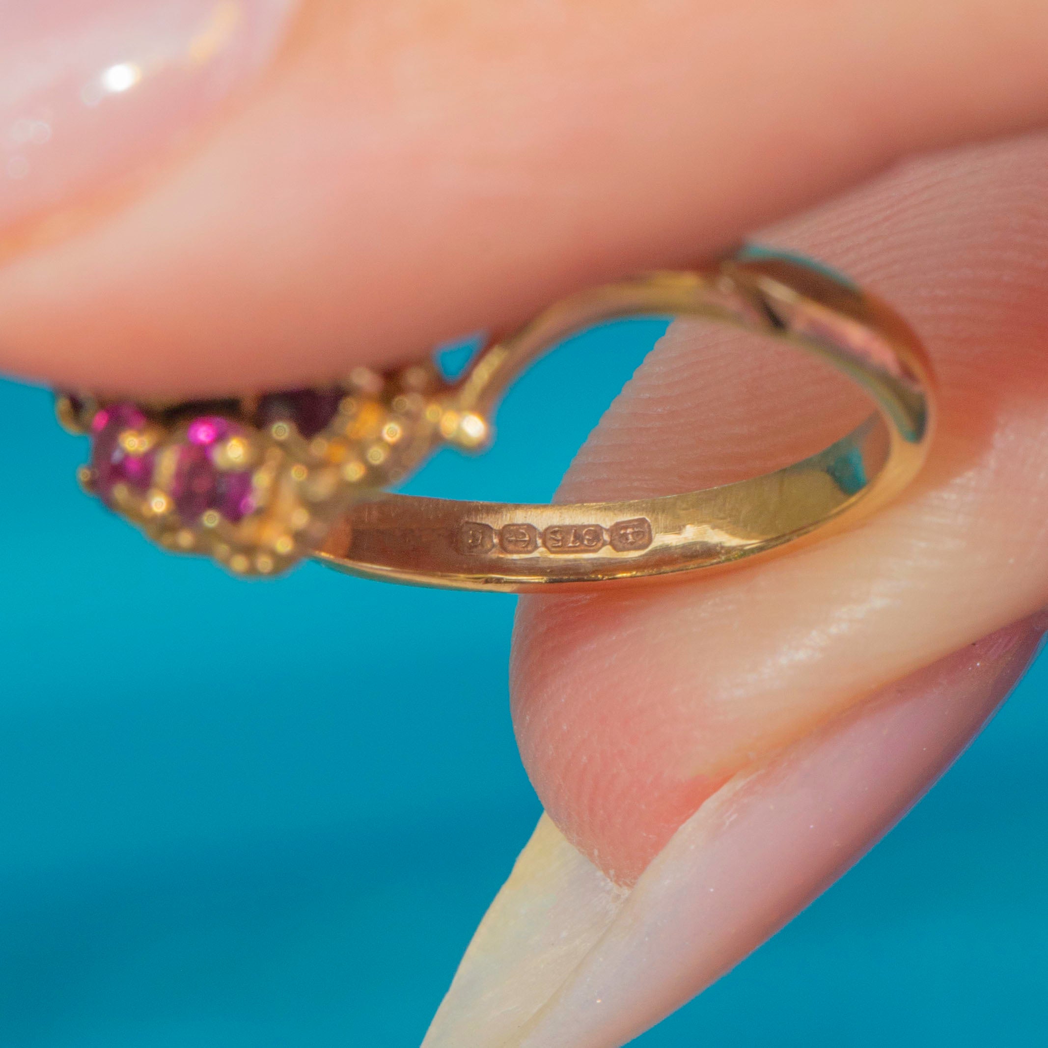 Dated by full English hallmarks to 1976, this ring carries the glamour of the 1970s with its confident colour palette and statement presence, while still being perfectly wearable today.