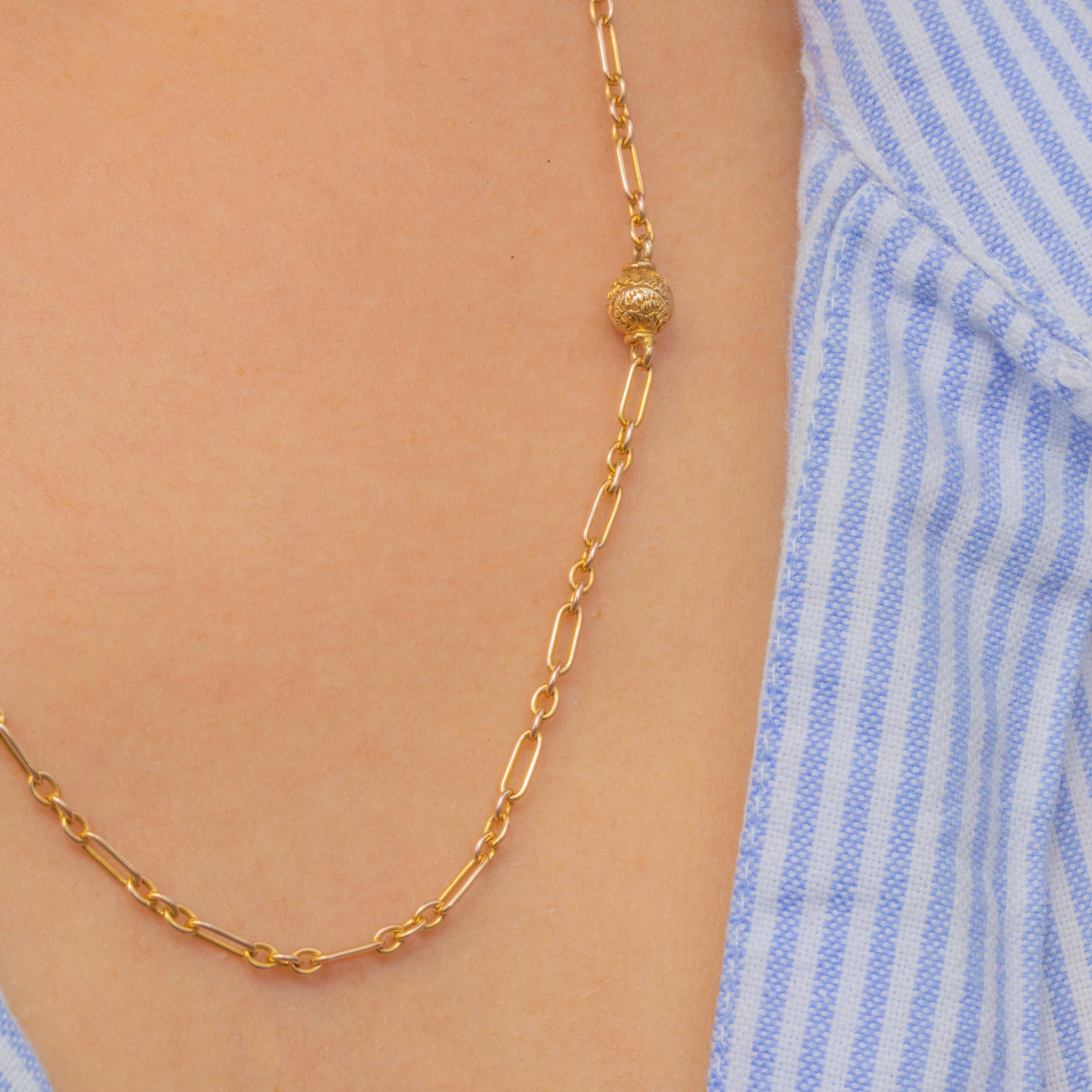 Crafted from glossy 9ct Gold, this Victorian chain features dainty trombone links stationed by ornately engraved orbs, adding a lovely texture.