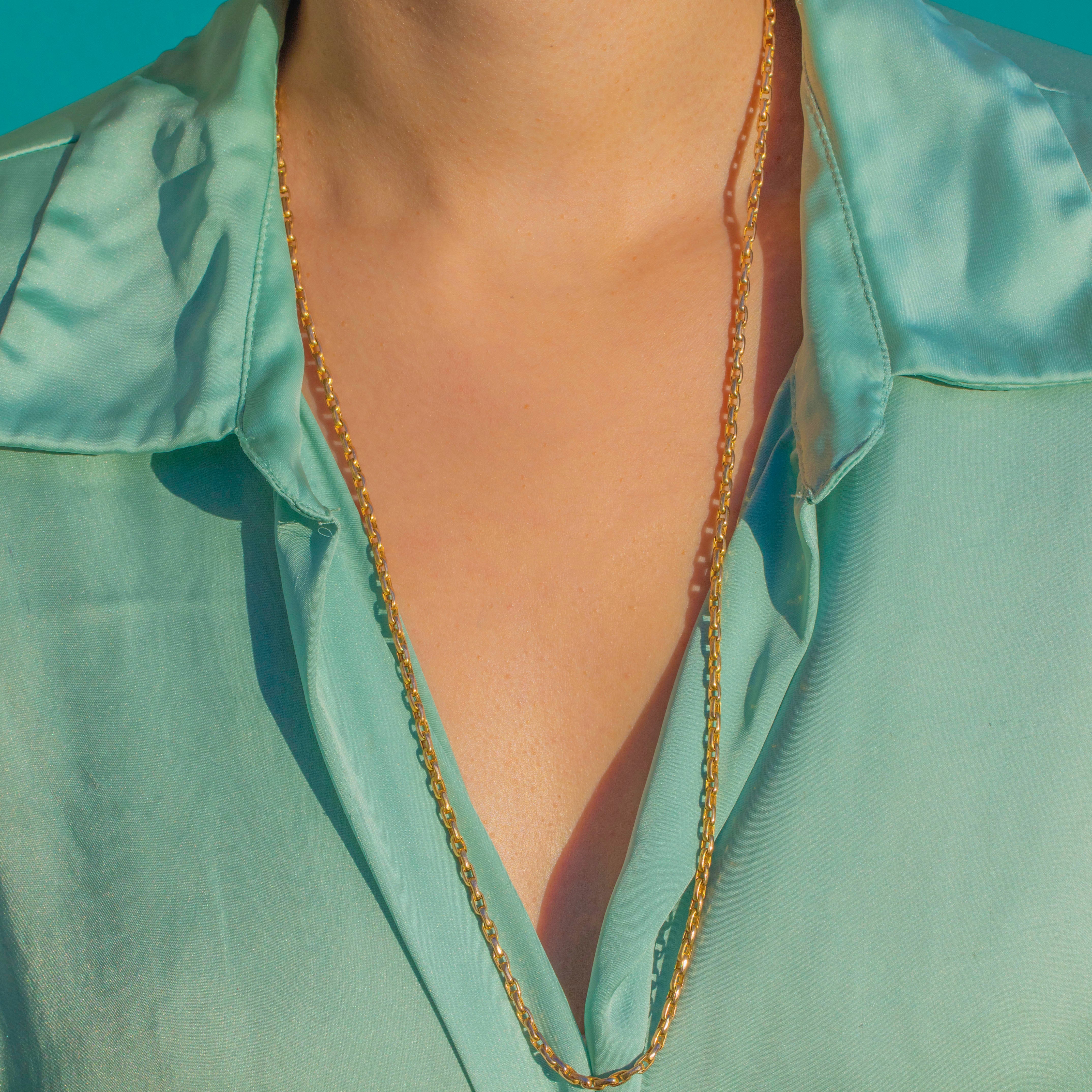 An elegant Edwardian staple, this 9ct Gold belcher chain is the perfect everyday staple. The softly faceted links catch the light beautifully and have a fluid drape. Its warm, lustrous finish pairs effortlessly with everything from a crisp white shirt to evening silk.