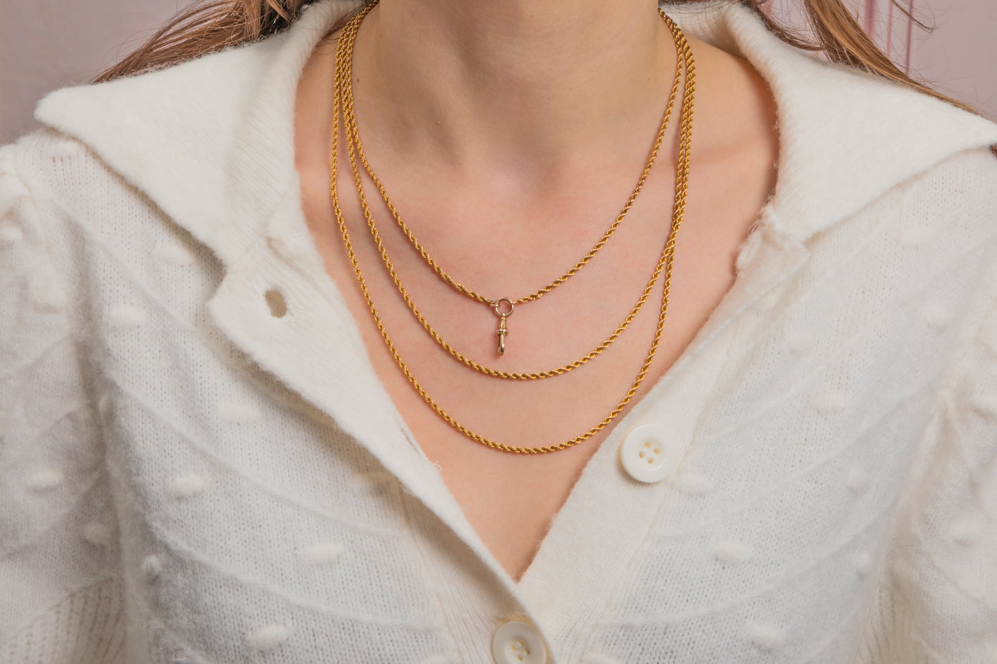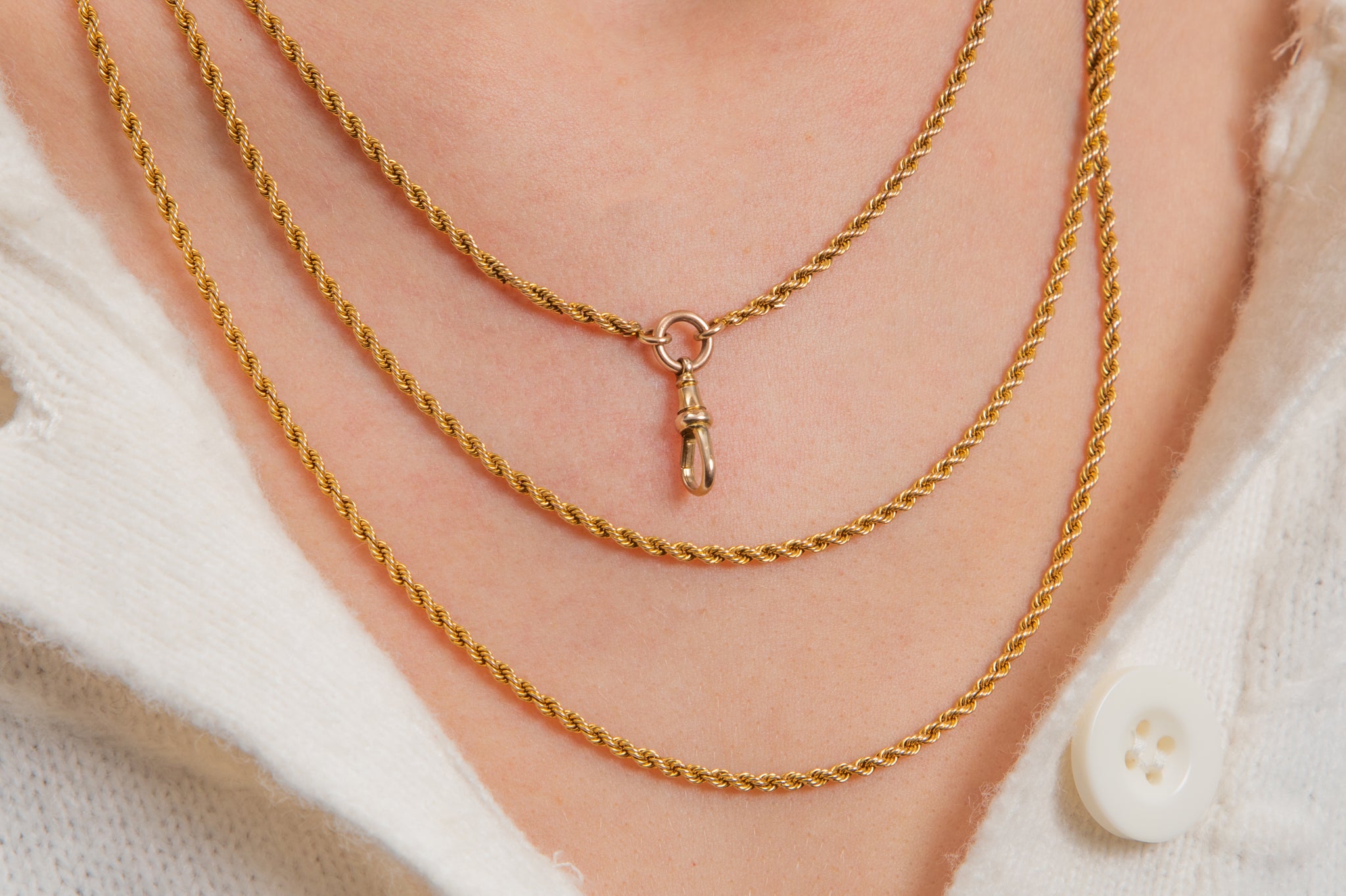 This 58.5" Victorian 9ct Gold longuard rope chain is a sensational piece of antique jewellery! Complete with a solid 9ct Gold antique dog clip, there are endless ways to style this Victorian Gold chain. Whether you choose to create a layered look by wrapping her around multiple times or even use her dog clip to attend to all your charm holding needs, this rope chain will look splendorous!