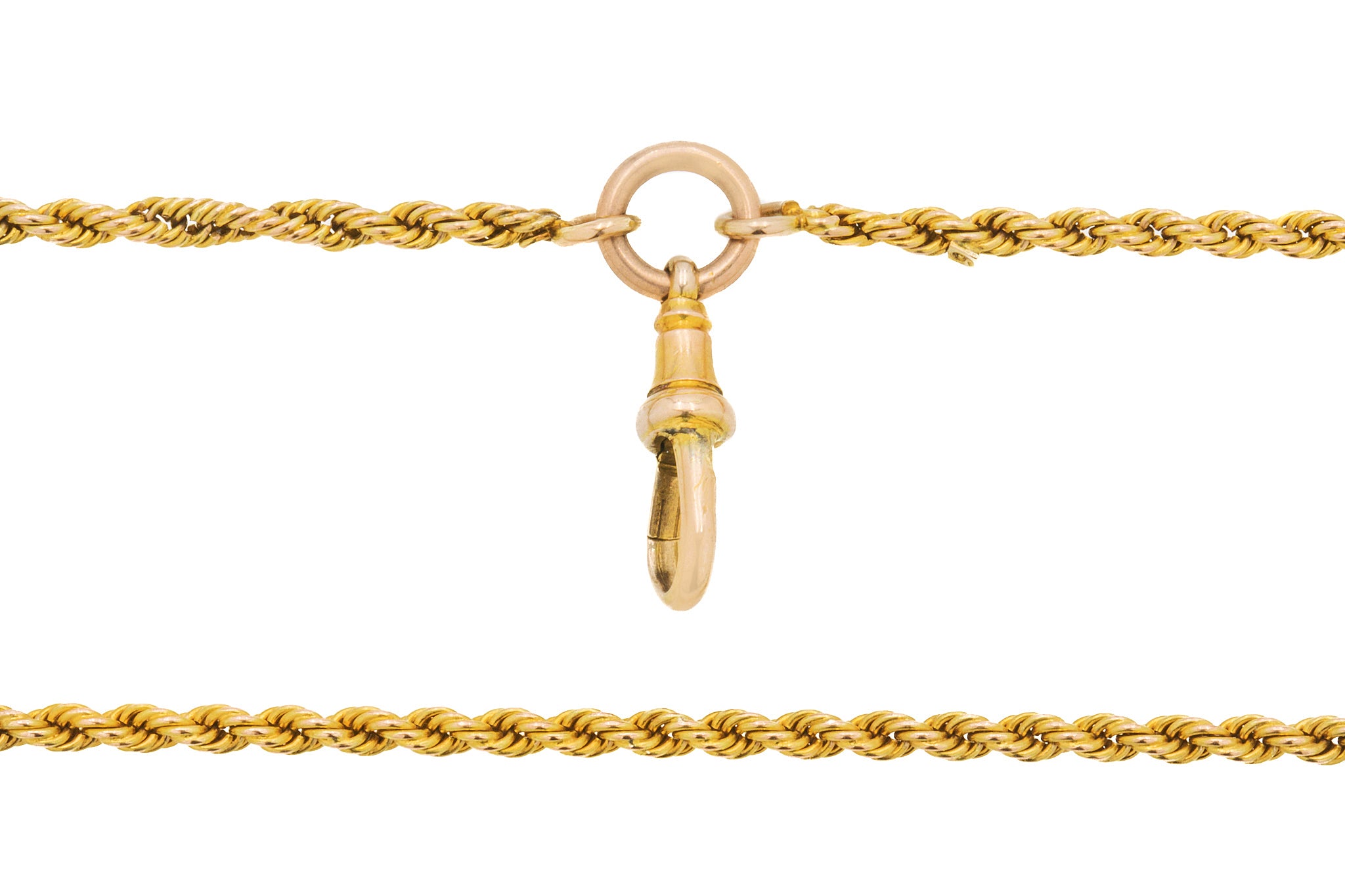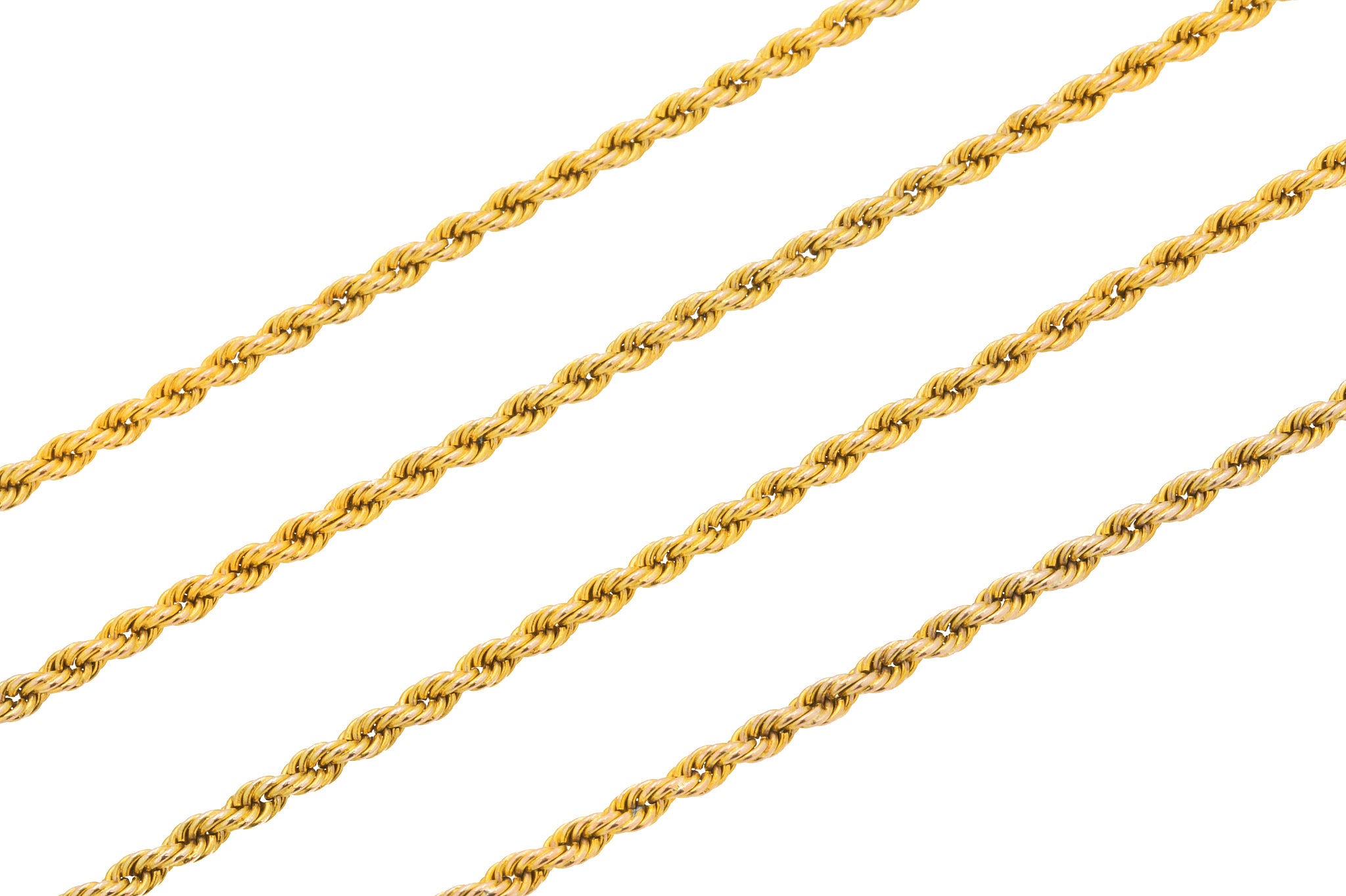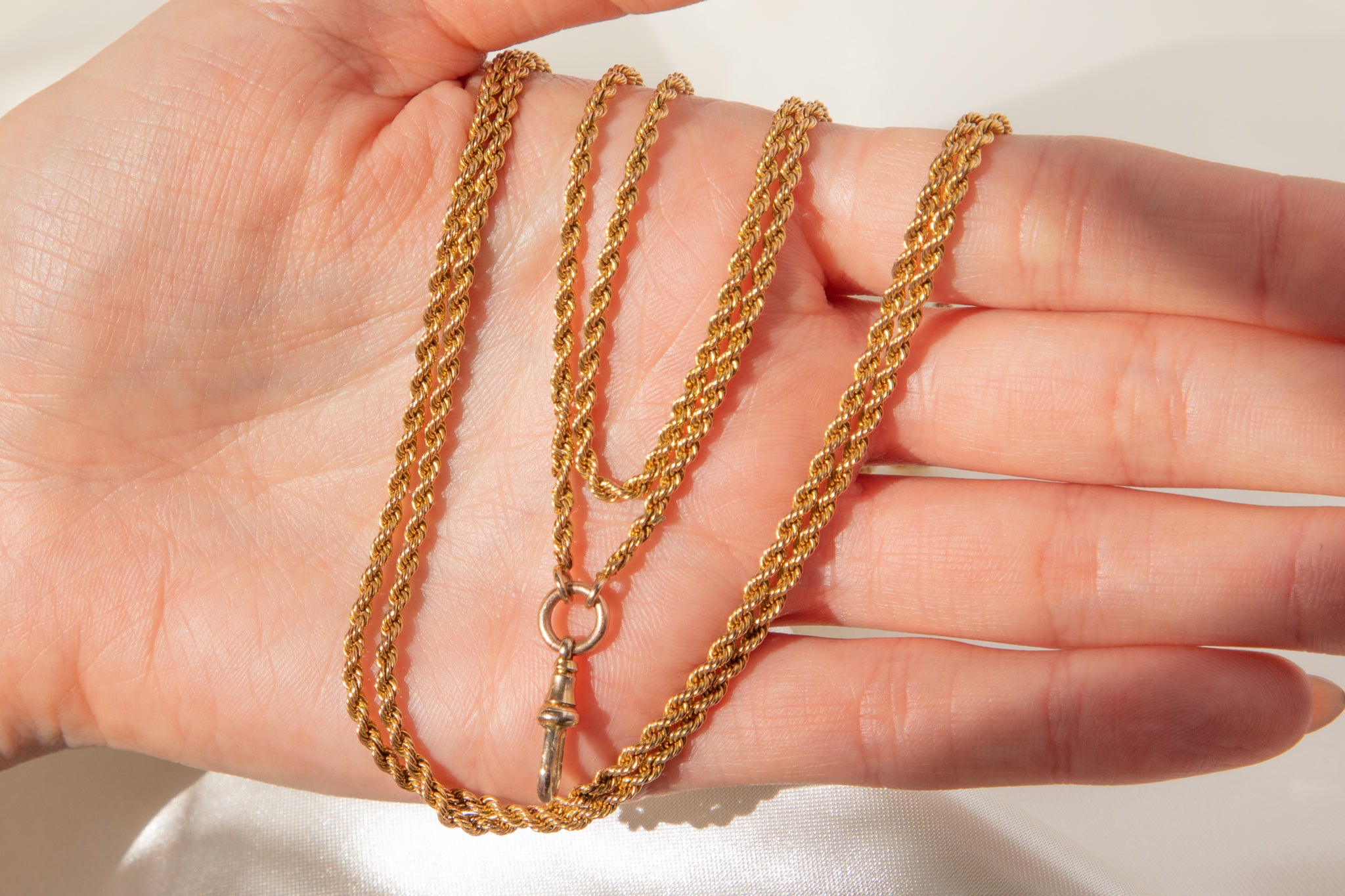 EXCELLENT: This Victorian 9ct Gold longuard rope chain is in mint condition throughout! The rope chain is beautifully interwoven and her smooth touch means she glides through your fingers with ease. With her incredibly bright hue, she is a testament to its perfect preservation. An antique we think you will wear on every occasion!