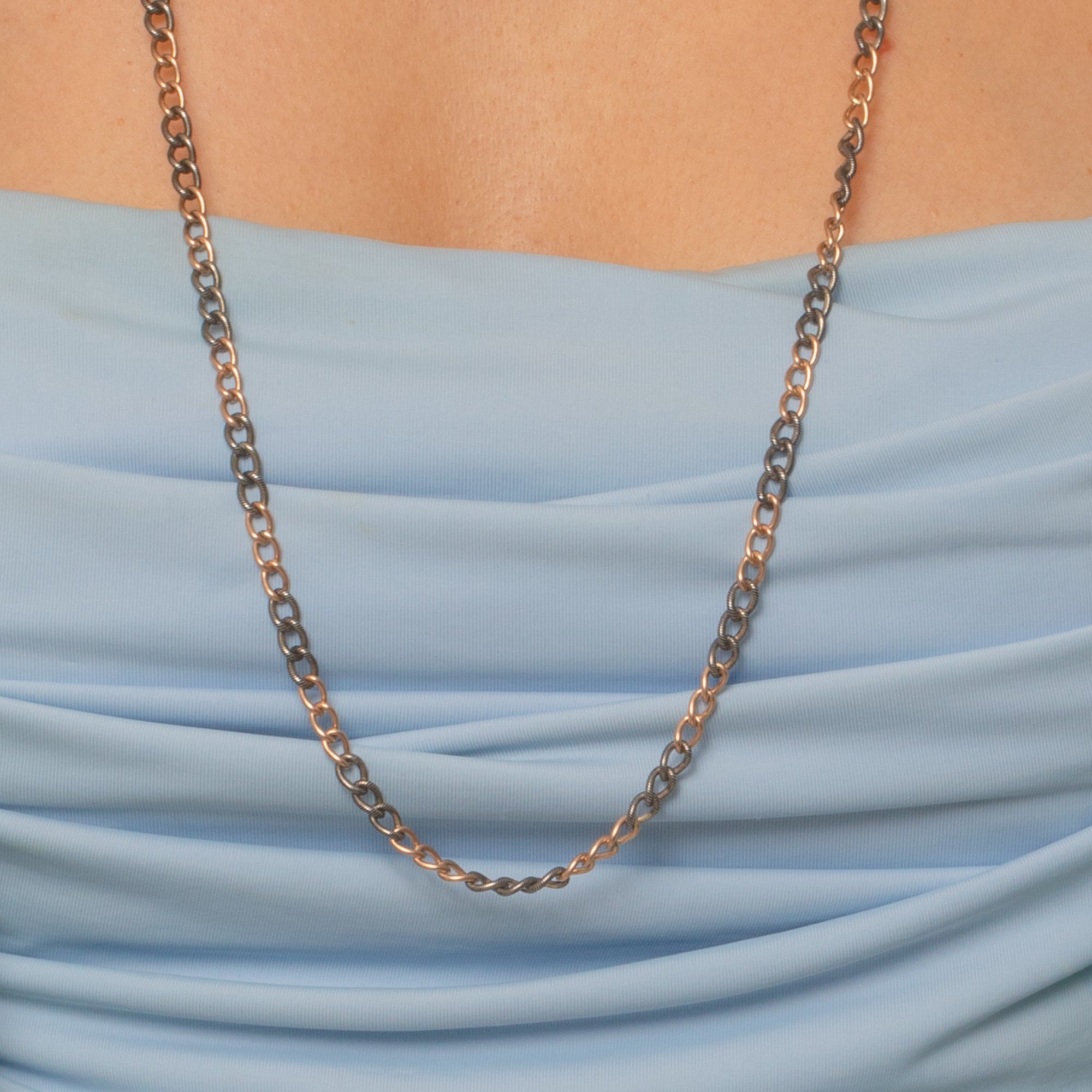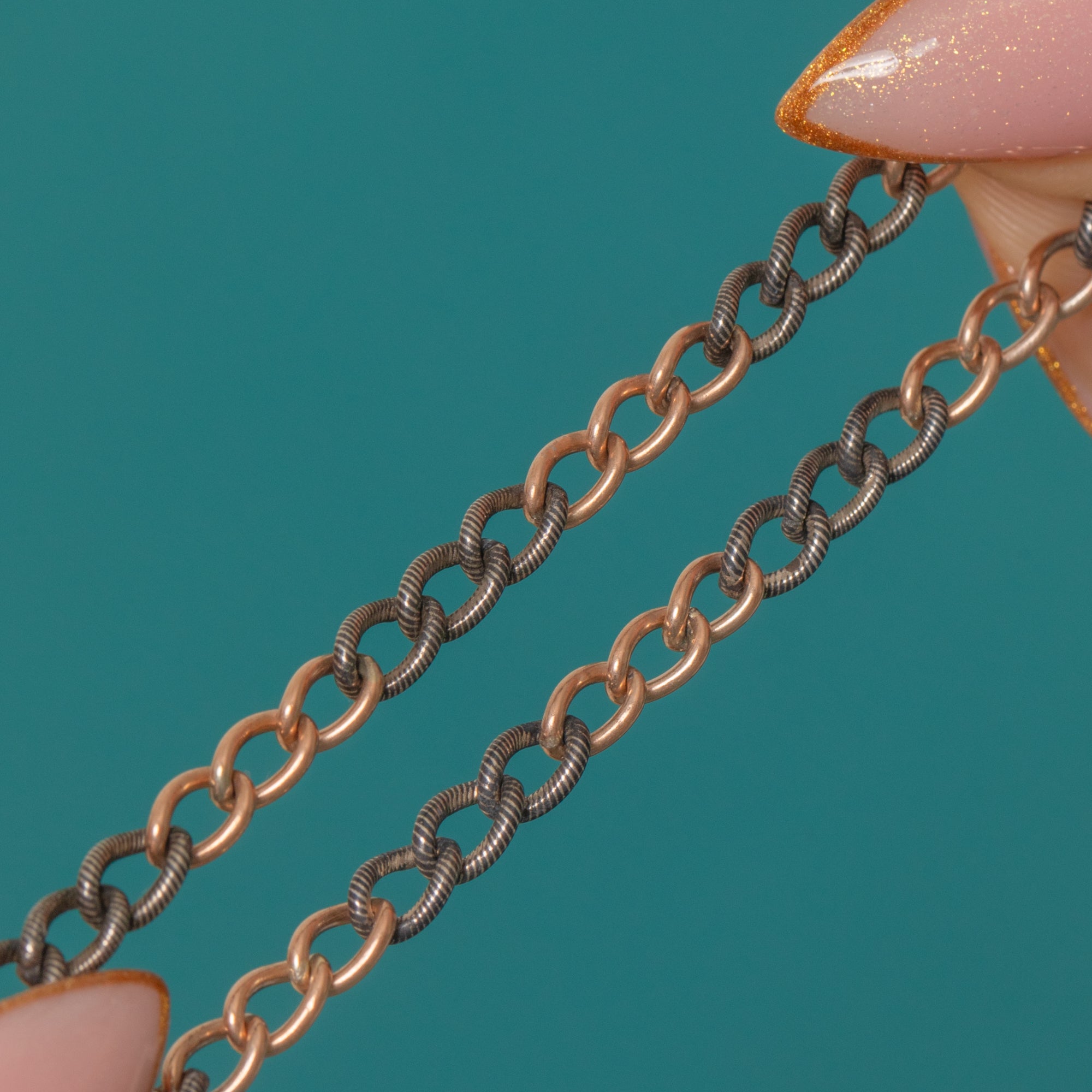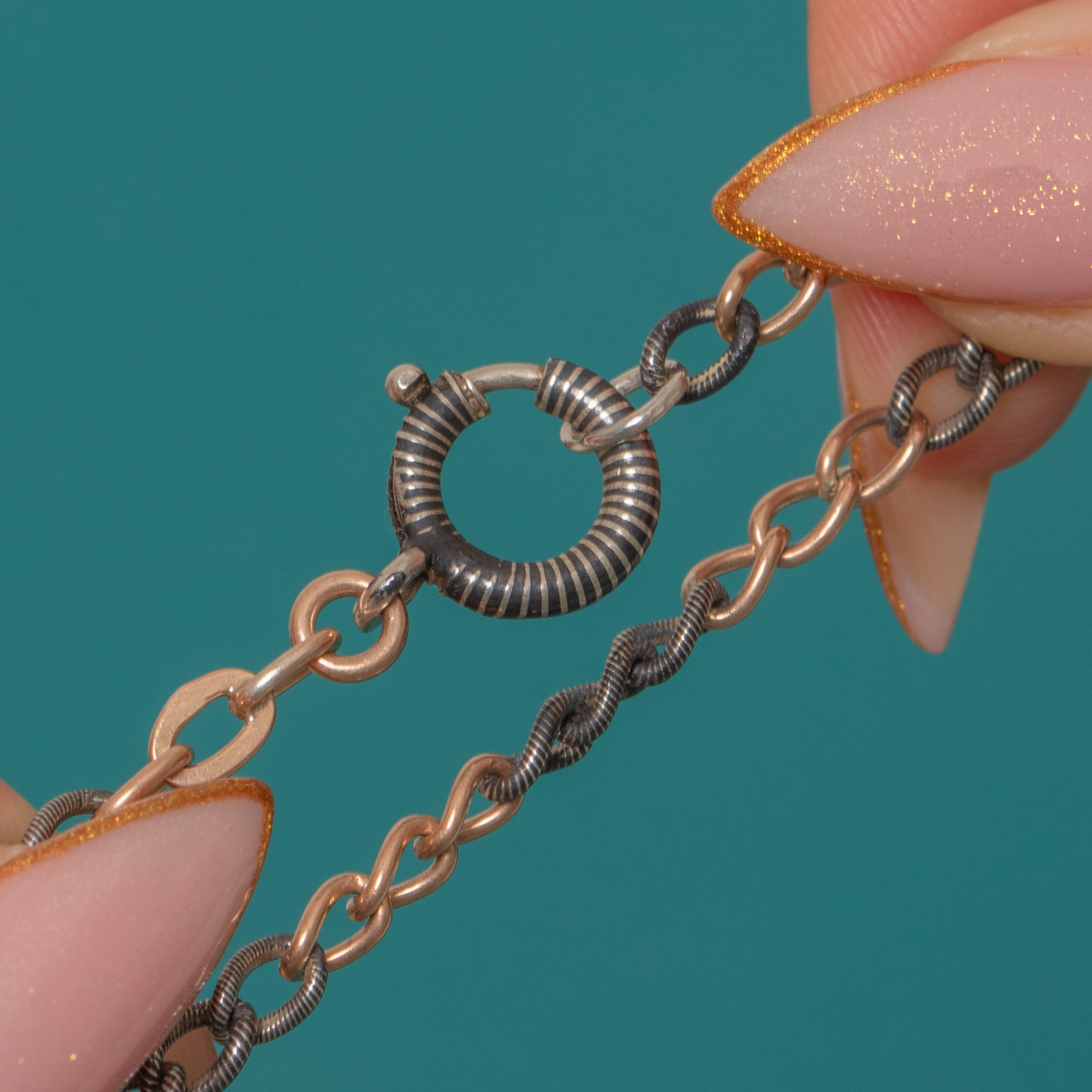 This striking Victorian Niello chain is a beautiful example of 19th-century European craftsmanship. Made from 900 Silver with alternating Niello Enamel and Rose Gold-plated links, it features a distinctive striped bolt-ring clasp, ideal for attaching charms or pendants. The contrasting tones of dark Niello and warm Rose Gold create a wonderful two-tone effect that’s both elegant and unique.