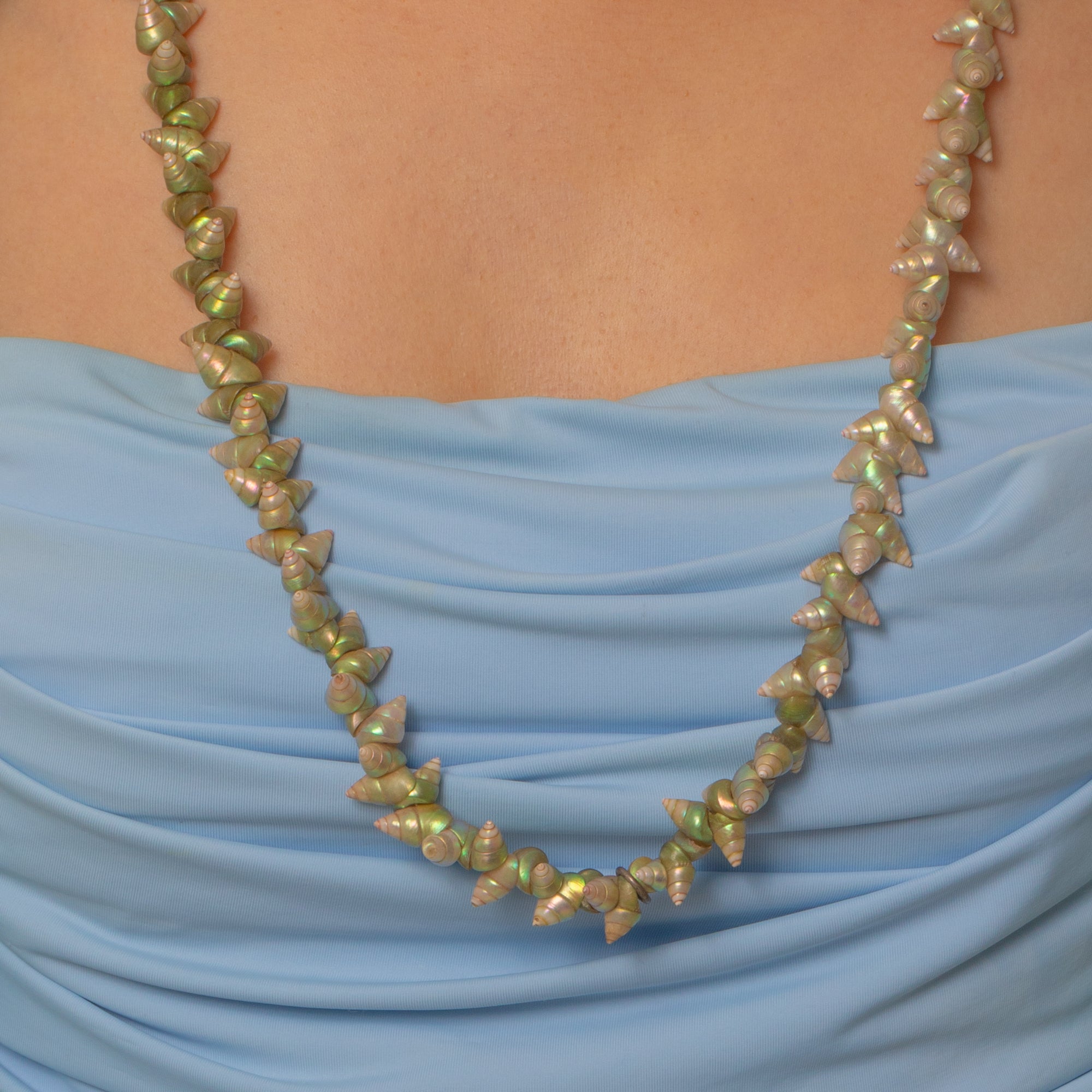 This exquisite Victorian necklace is strung with luminous green Tasmanian Marineer shells, a rare and highly sought-after material prized in the 19th century for its captivating iridescence. Each shell glows with soft golden-green and pink overtones, reflecting light beautifully as it moves.
