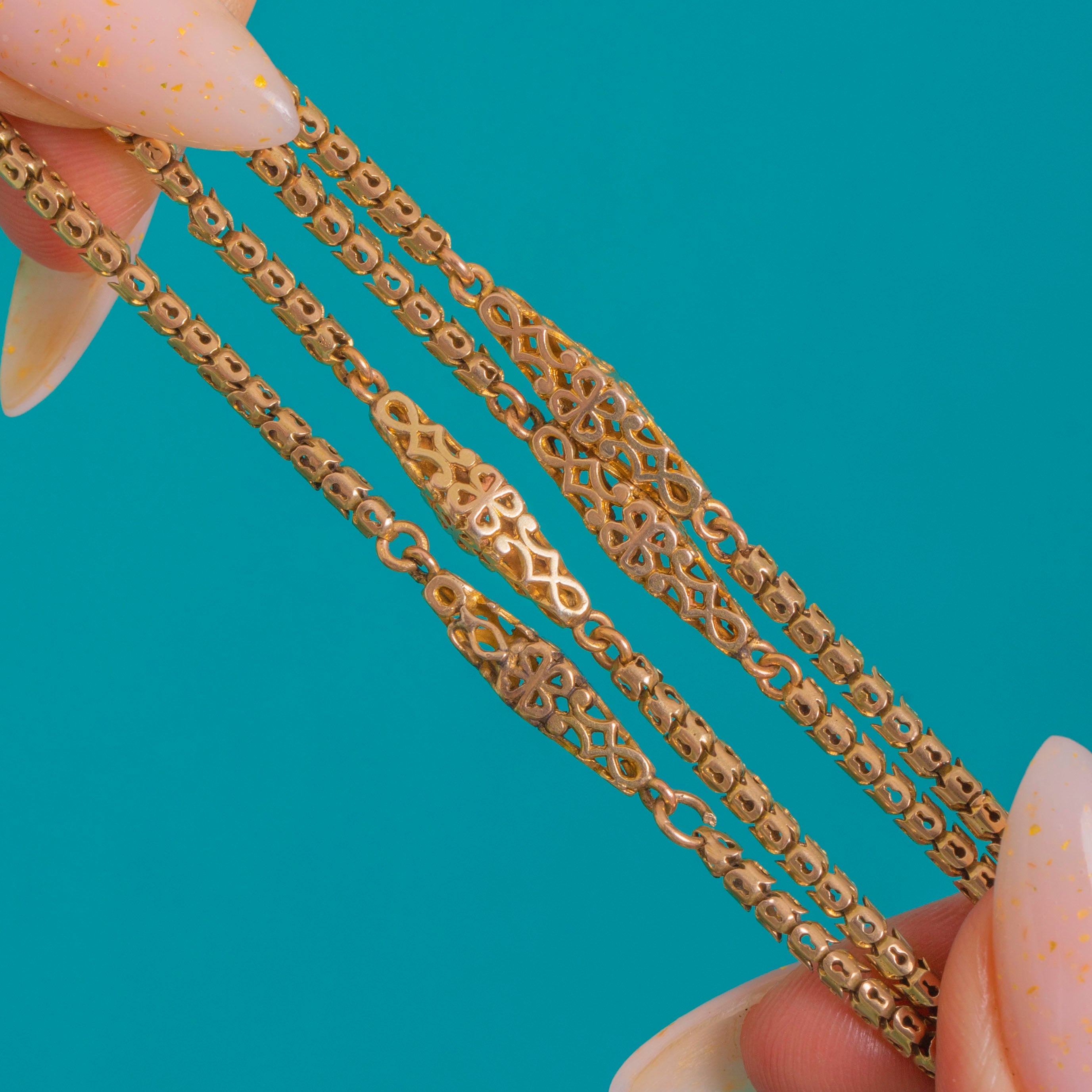 Captivating in its delicacy yet wonderfully wearable, this Victorian 9ct Gold longuard chain is composed of pierced fancy links punctuated by elongated navette openwork stations. The airy lattice and scrollwork give it a refined, decorative rhythm, while the warm glow of 9ct Gold brings a softly luminous finish.
