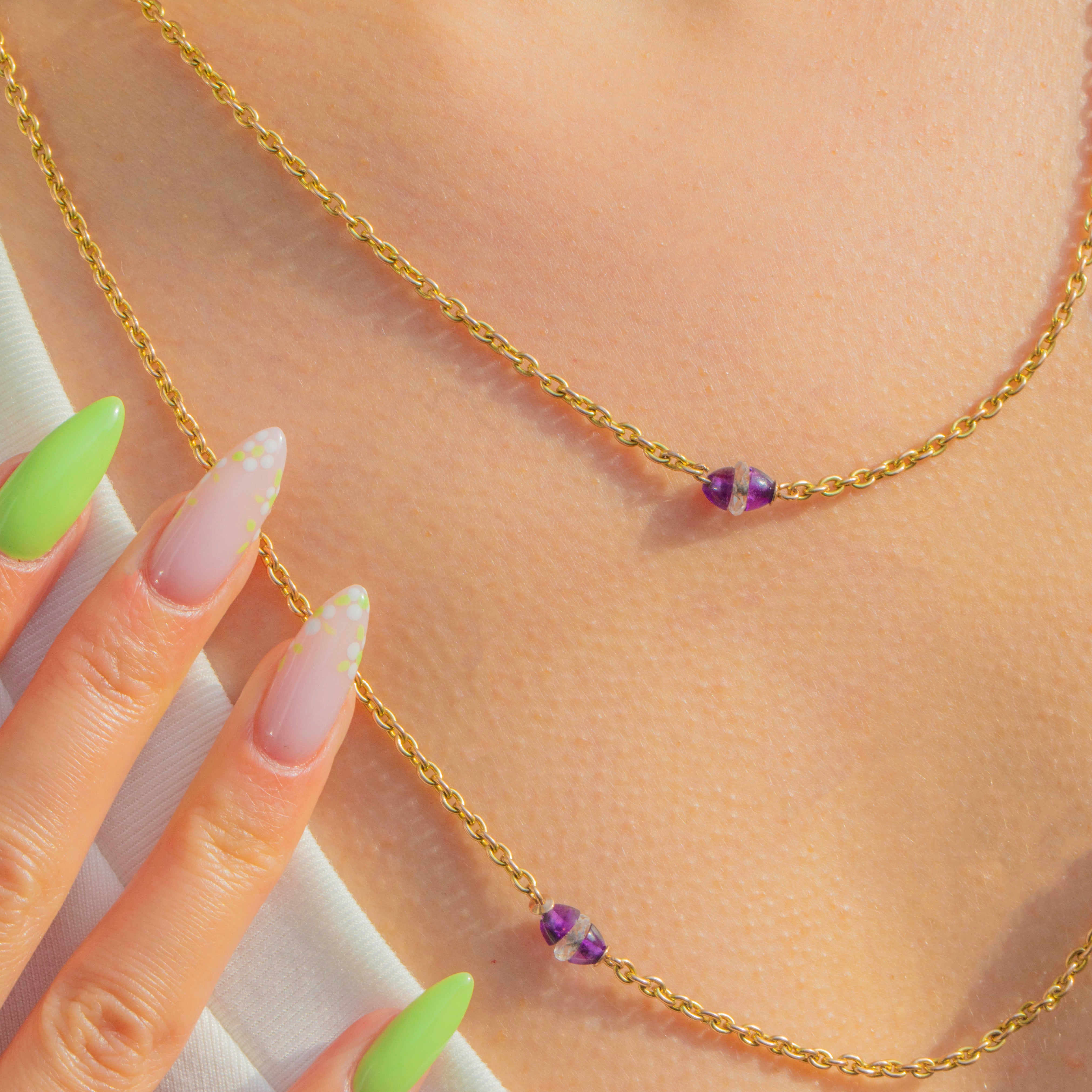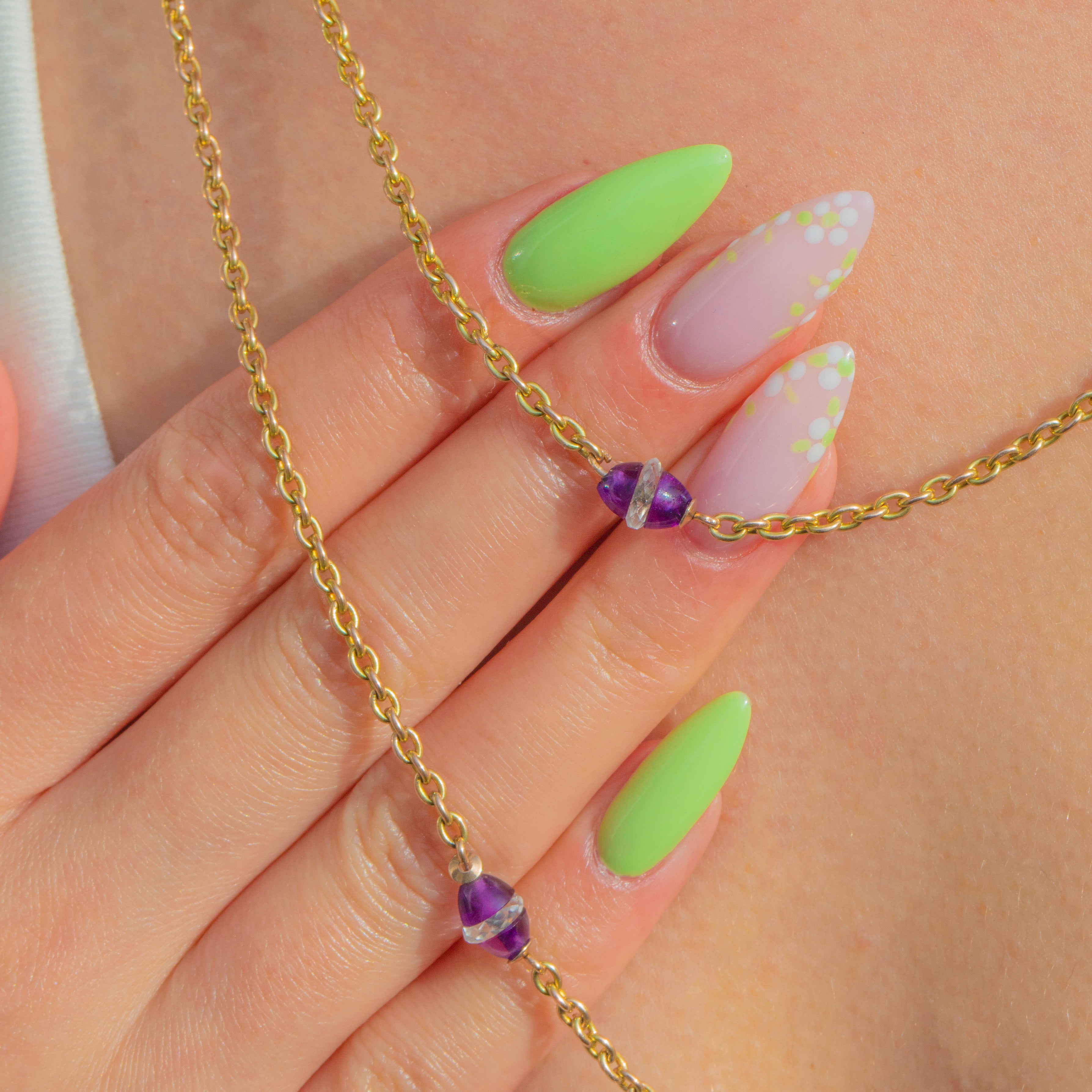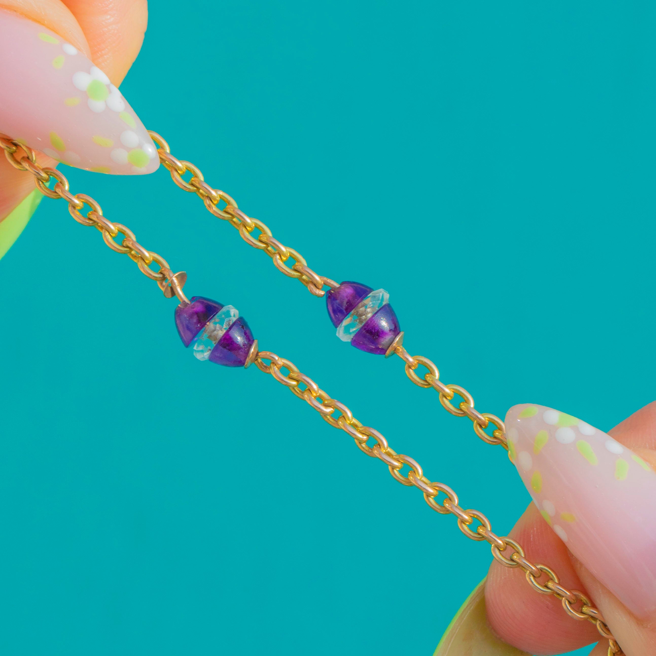 A sublime Art Deco station chain in 9ct Gold, set with natural Amethyst and faceted Rock Crystal terminals. The oval belcher links glow with a rich yellow hue and gentle time-worn patina, while the gemmy purple Amethysts and icy Rock Crystal catch the light beautifully with each movement.