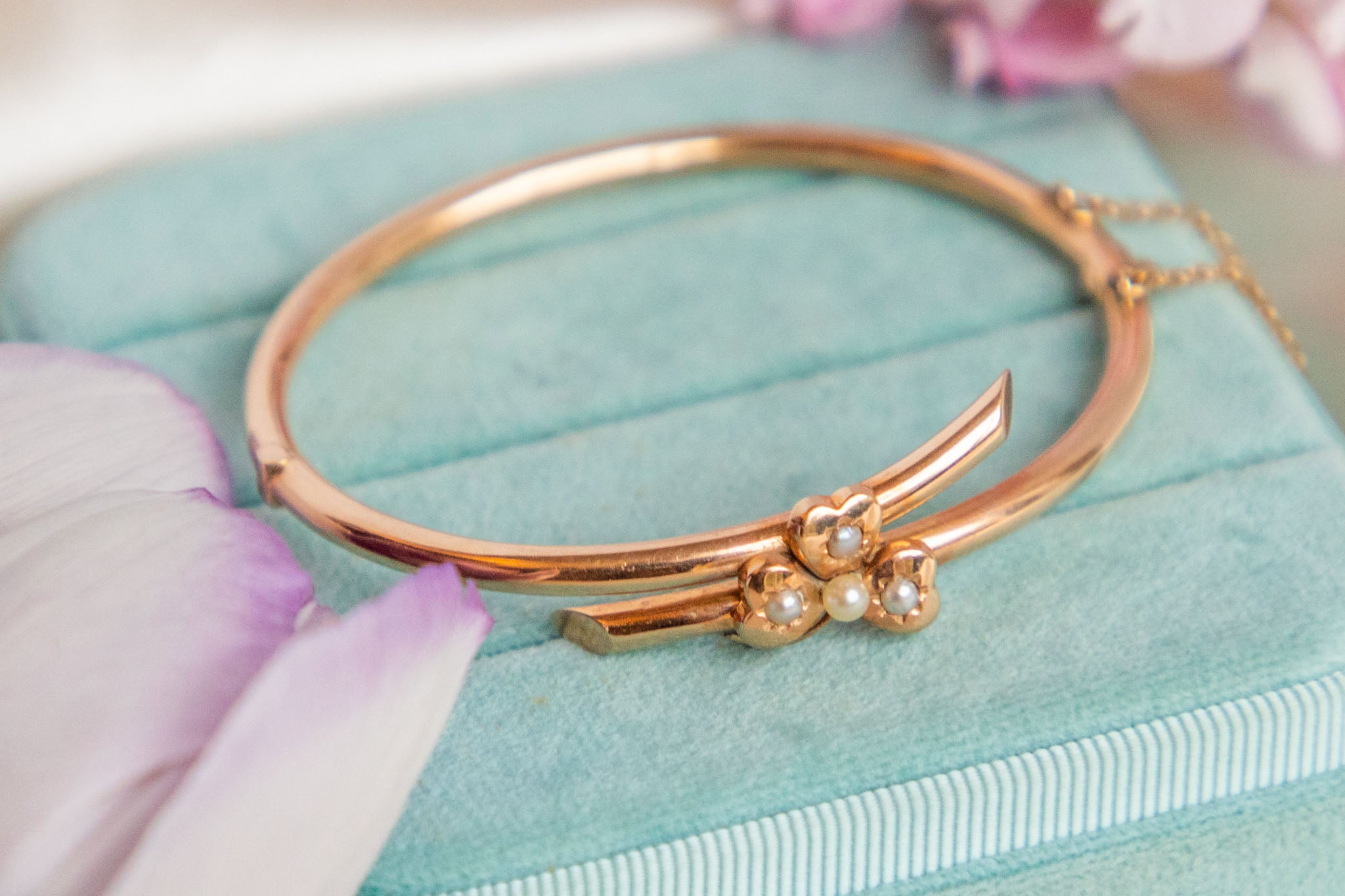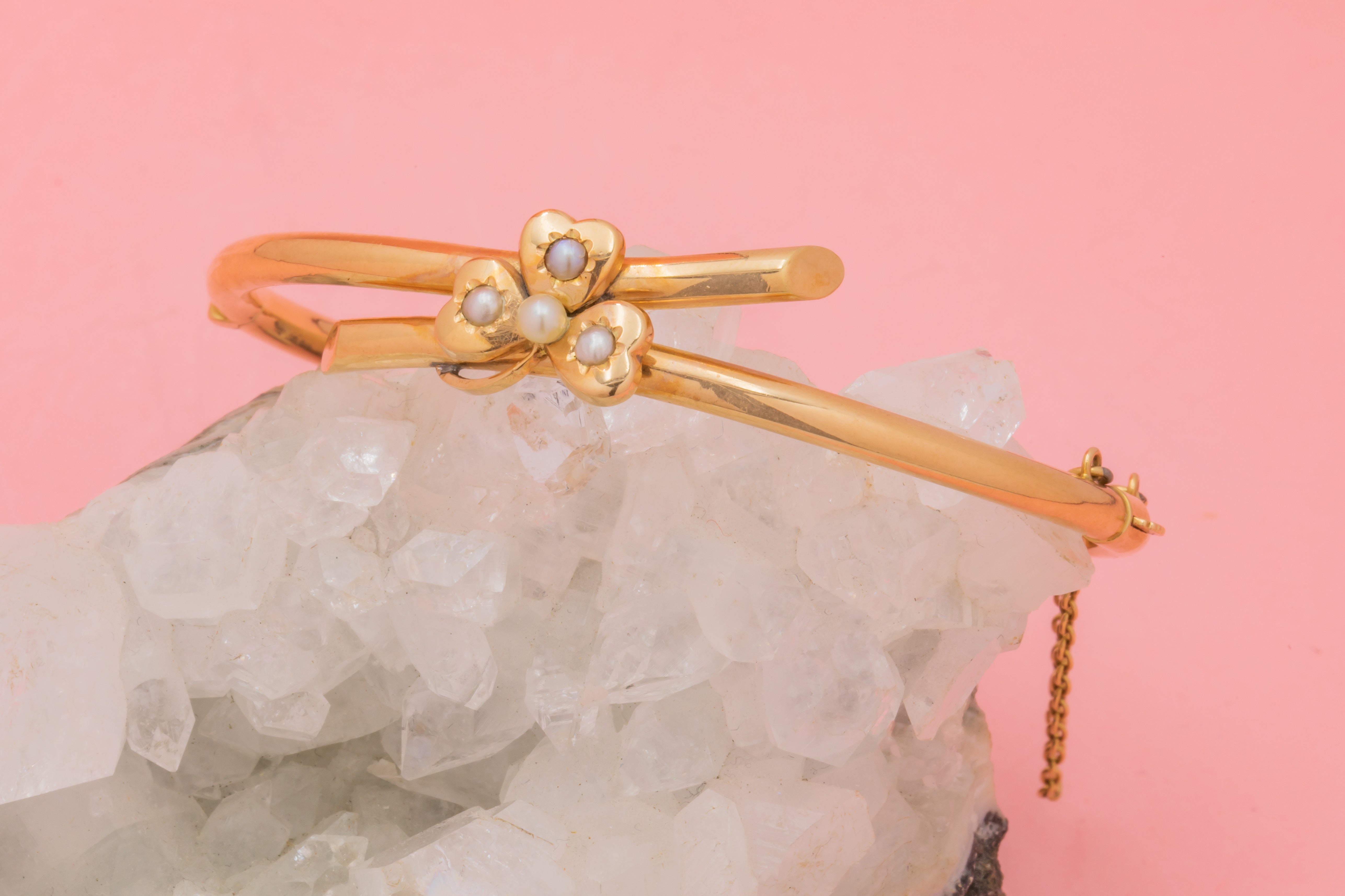VERY GOOD. This 6.5" antique 15ct Gold Pearl shamrock bangle is in very good condition. Her 15ct Gold has a gorgeous gloss throughout, with no wear to note. The bangle has a solid structure and her hinge is in perfect working order, allowing you to put her on and take her off with ease. The Pearls do have some subtle wear to the nacre, but they still have an admirable iridescence and are secure within their settings. Due to Pearls being a softer stone, it is important to avoid contact with water or humid conditions and we would not advise this piece for everyday wear. With her clasp shutting with a satisfying 'click', and complete with an added safety chain, you can wear this Victorian Gold bangle with the utmost confidence!