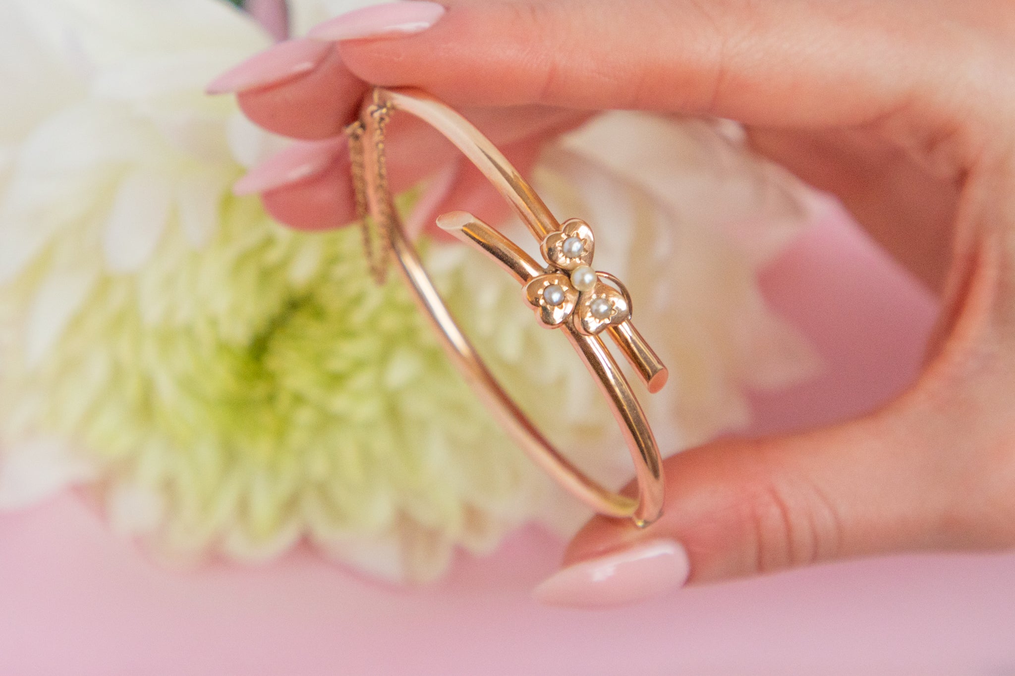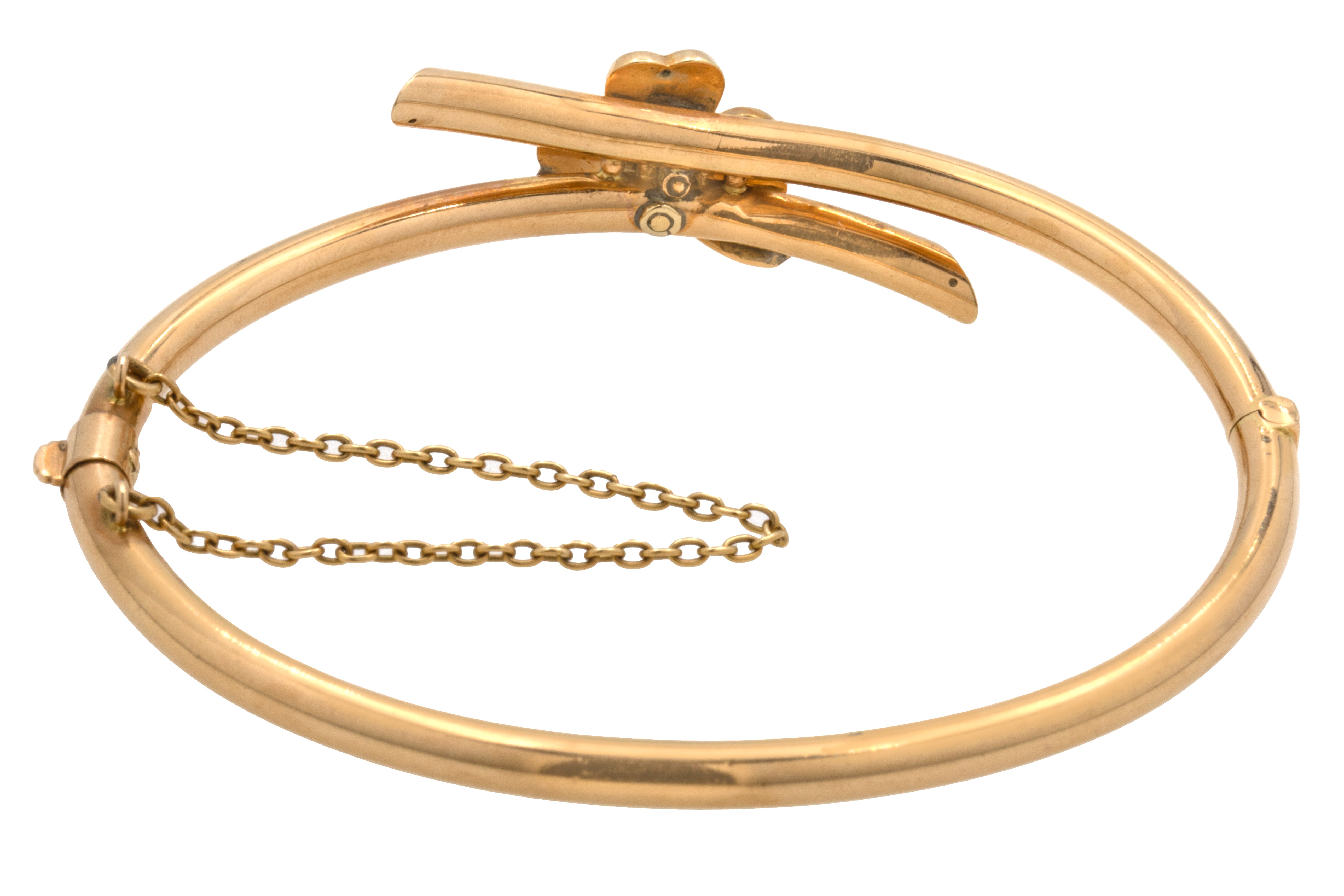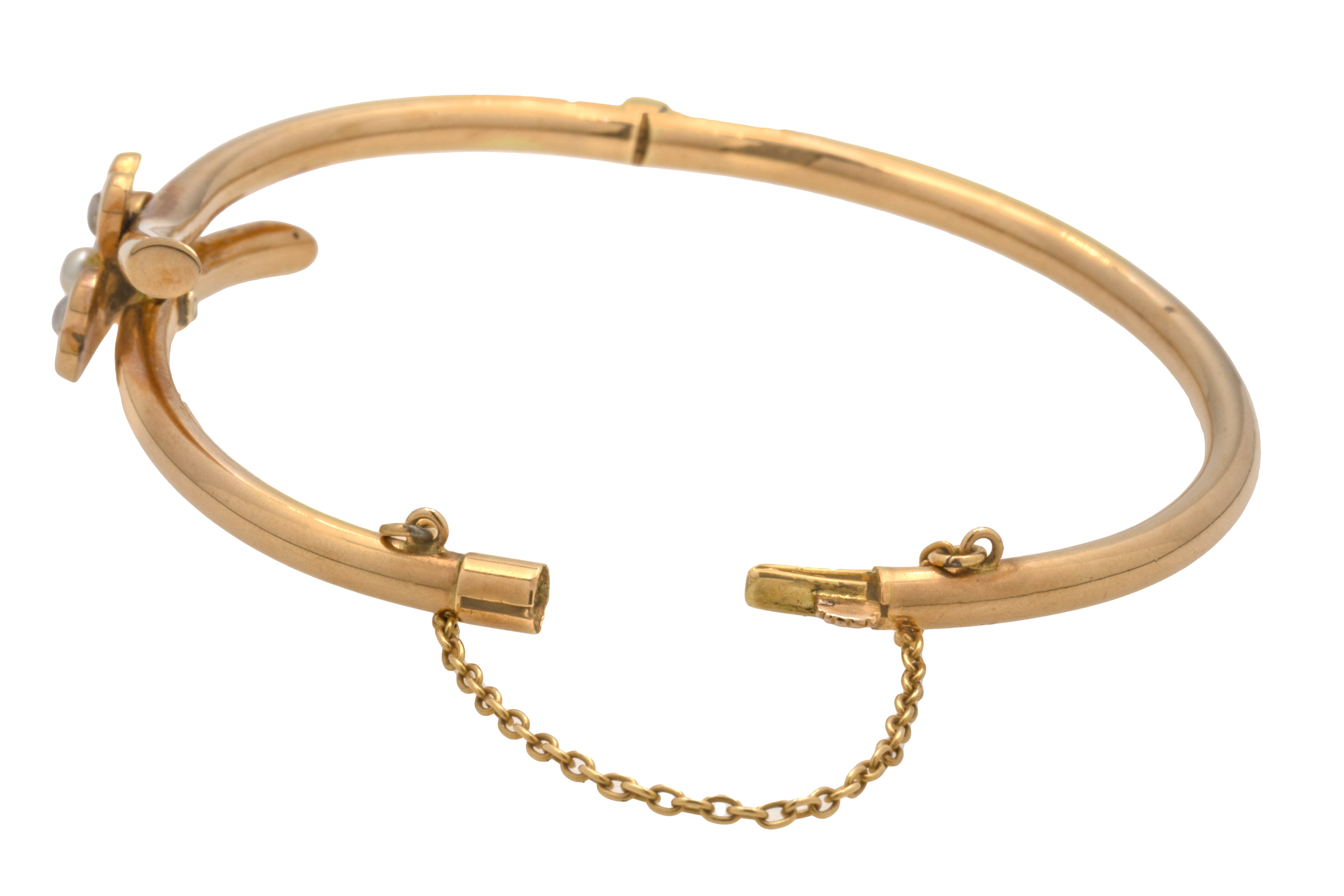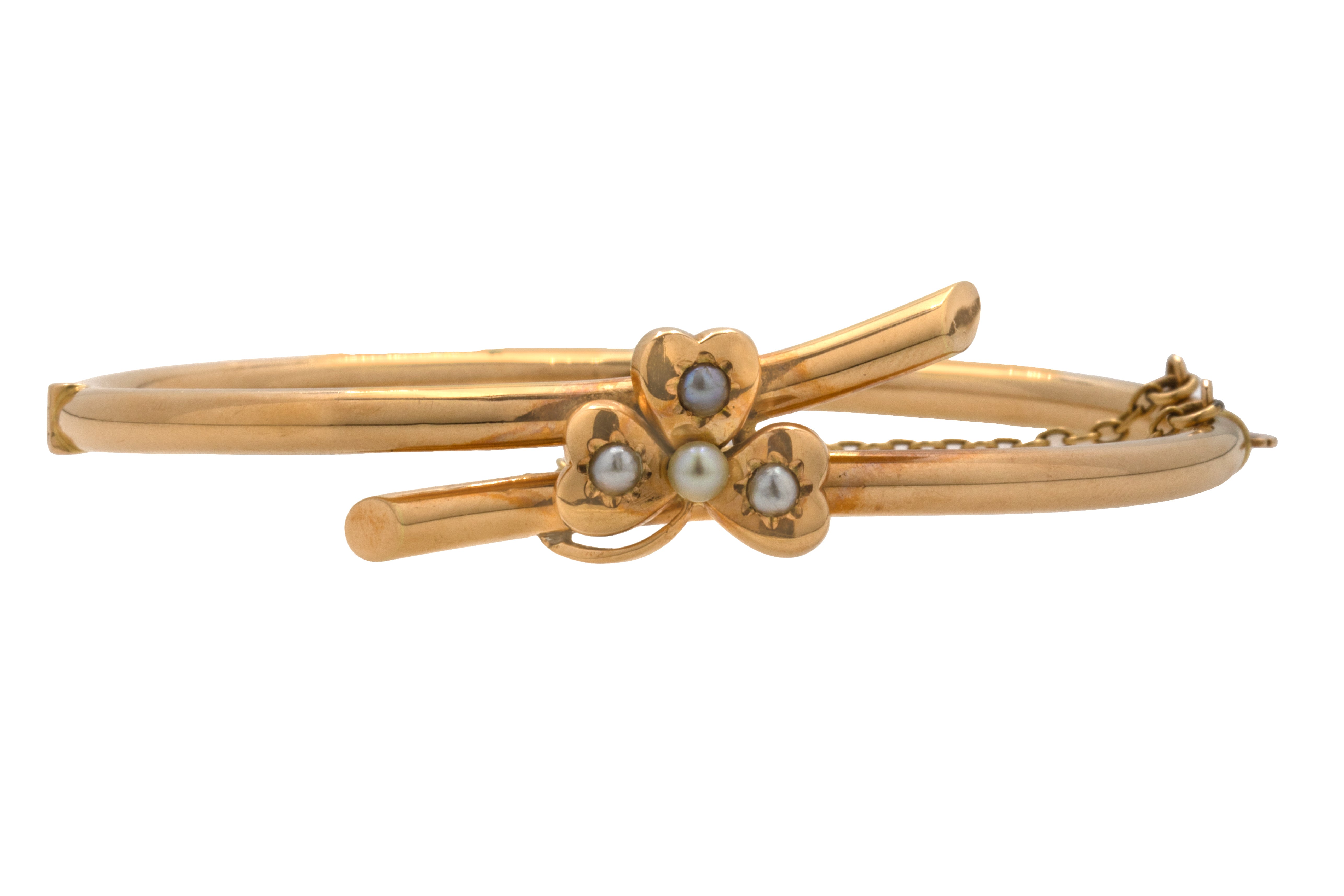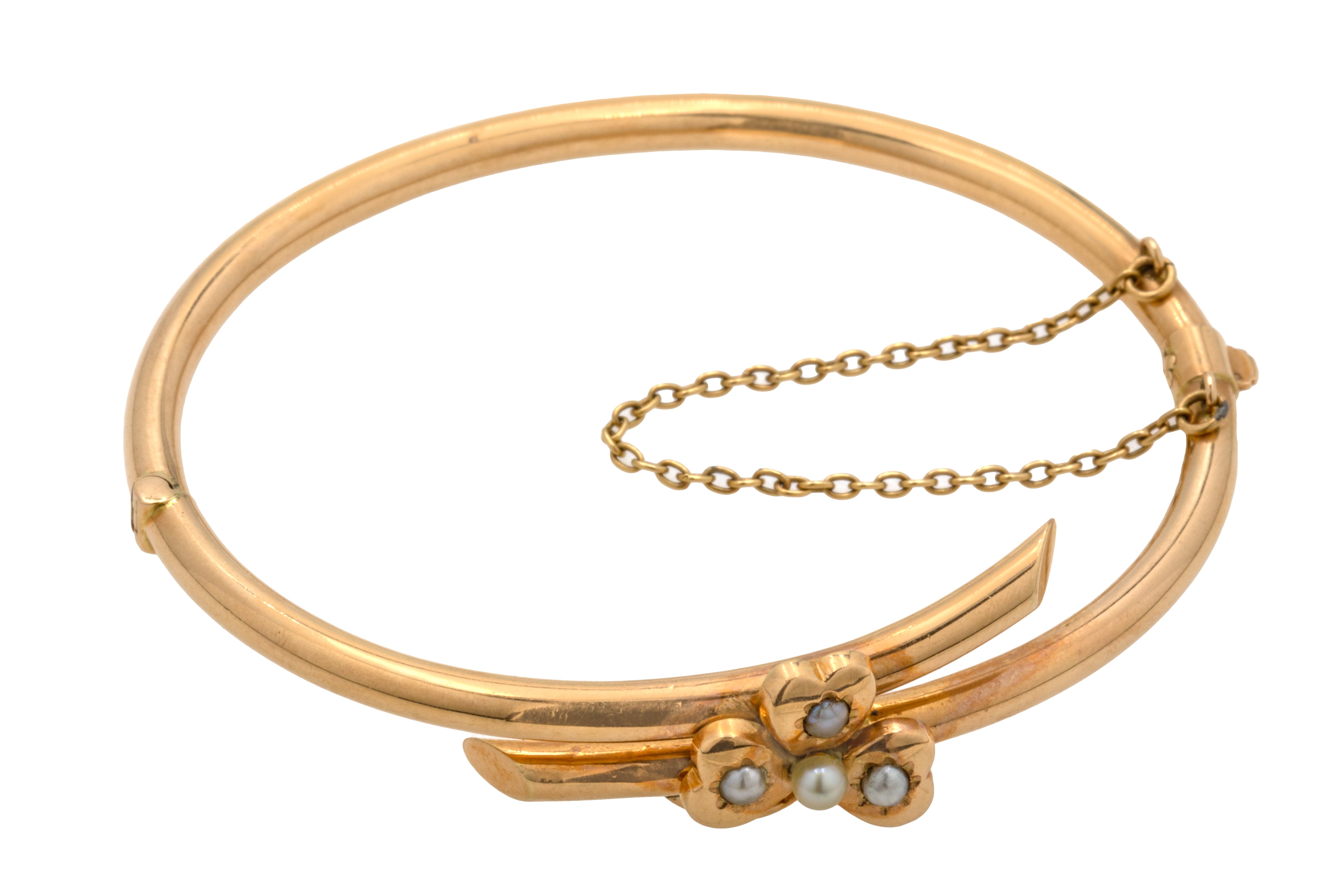 6.5" Antique 15ct Gold Pearl Shamrock Bangle, 8.5g