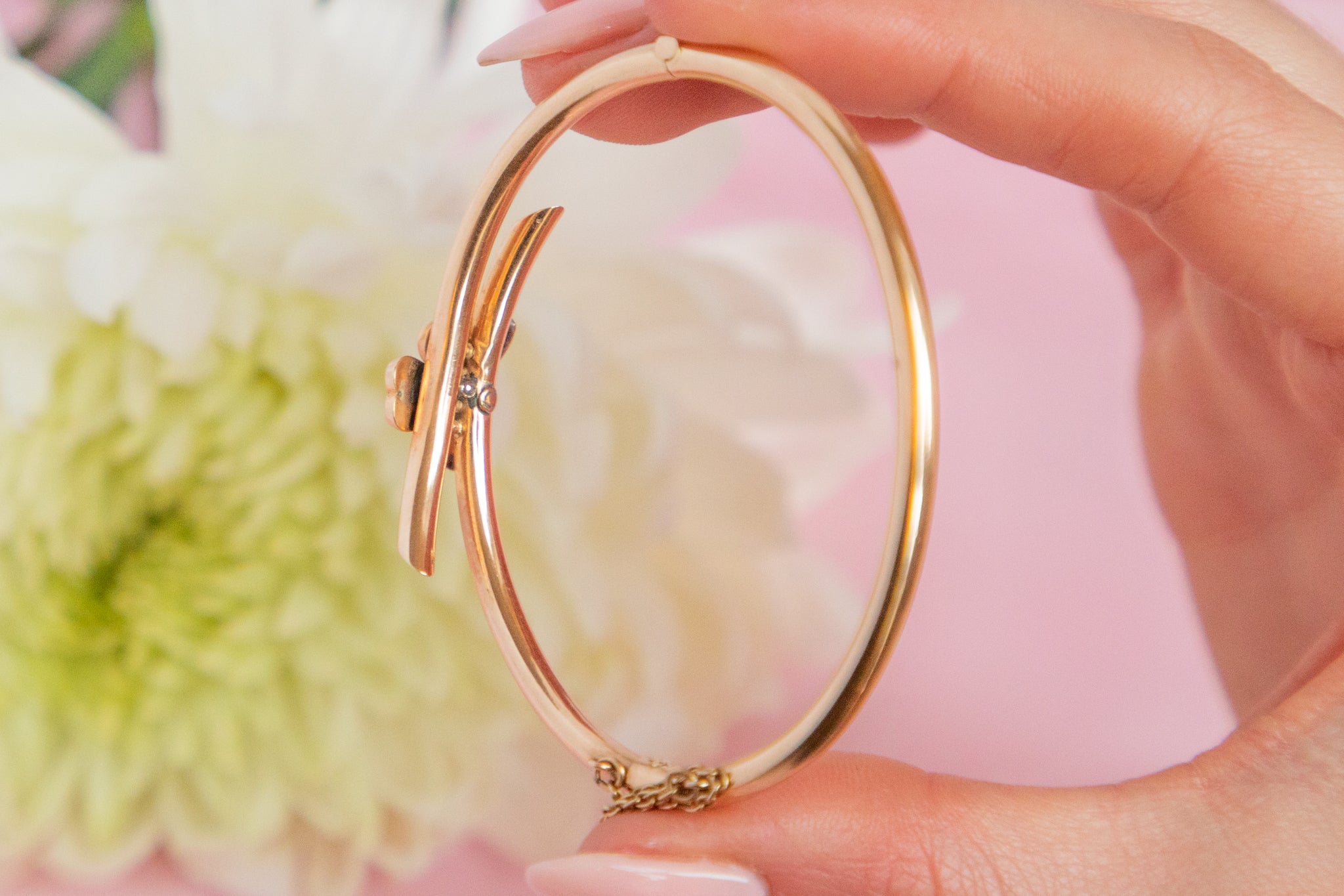 Feast your eyes on this 6.5" antique 15ct Gold Pearl shamrock bangle! Crafted from sumptuous 15ct Gold, her slender band wraps effortlessly around your wrist, tied up with a shamrock motif to finish. Nestled into each leaf lies a shimmering champagne Pearl adding an extra layer of splendour that you just can't resist!