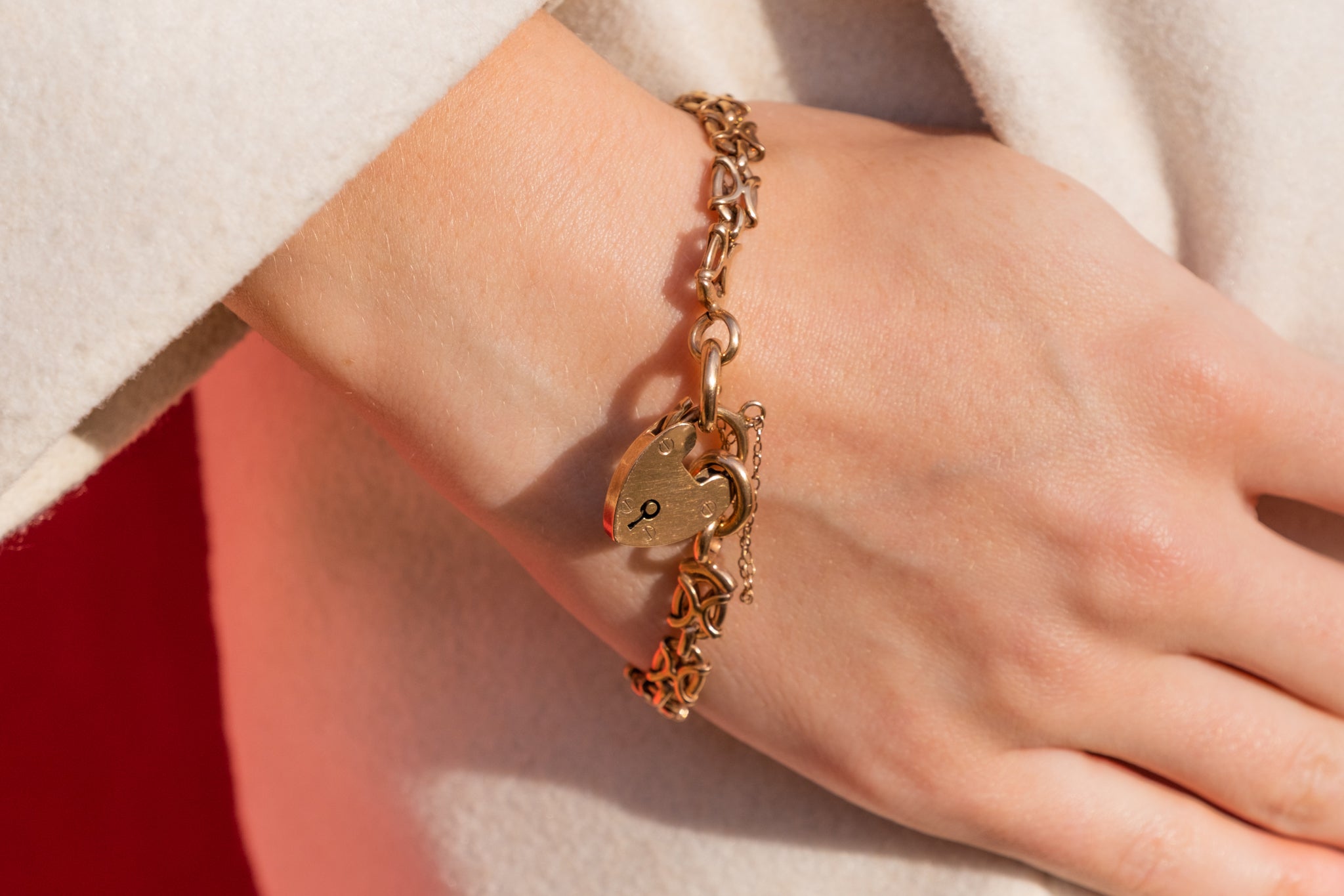 This Victorian Gold bracelet seals with a heart padlock, and historically only one's lover would have the key to open the heart upon their return from a travel afar - how romantic! We love the way this piece looks against the skin and is sure to look fabulous as part of a wrist stack.