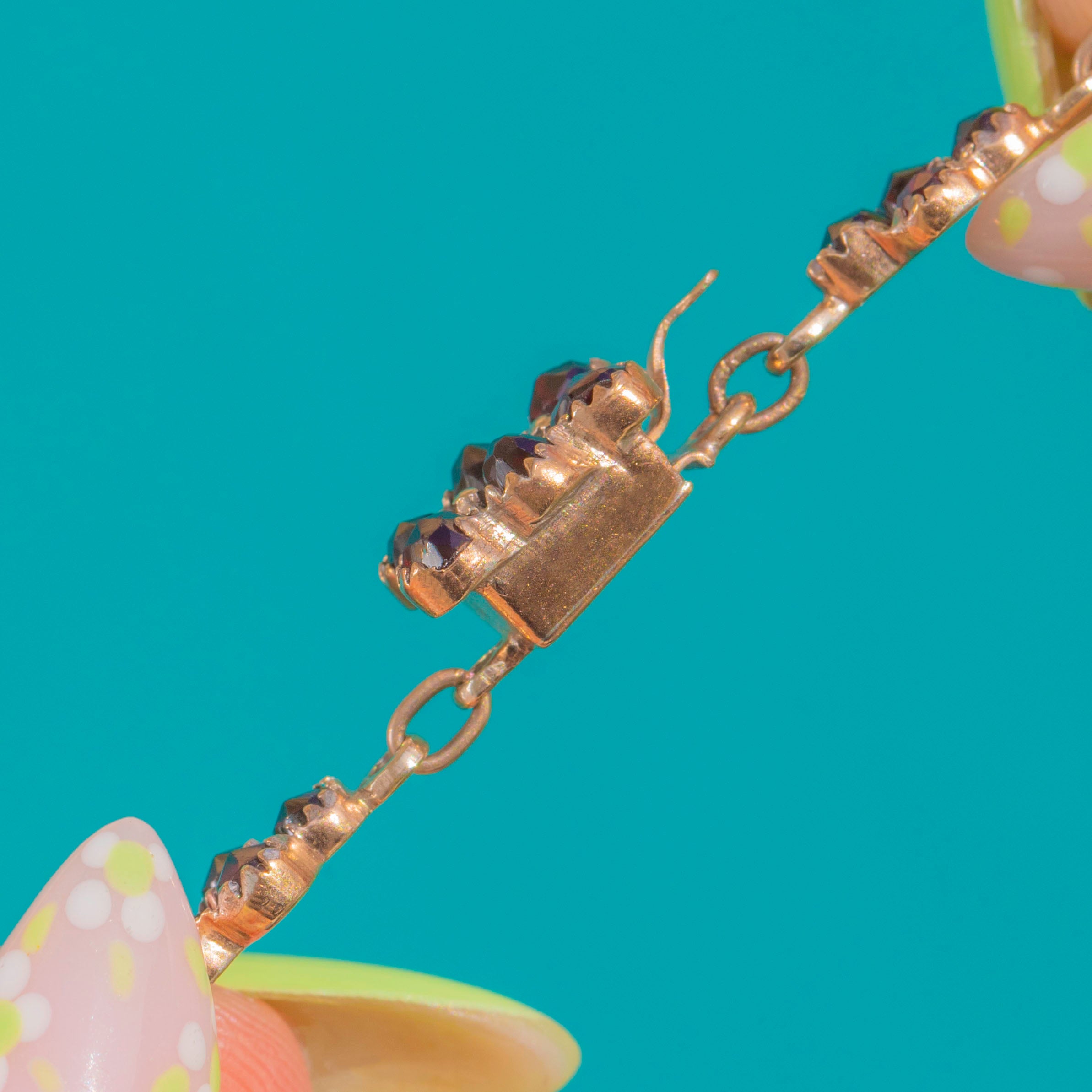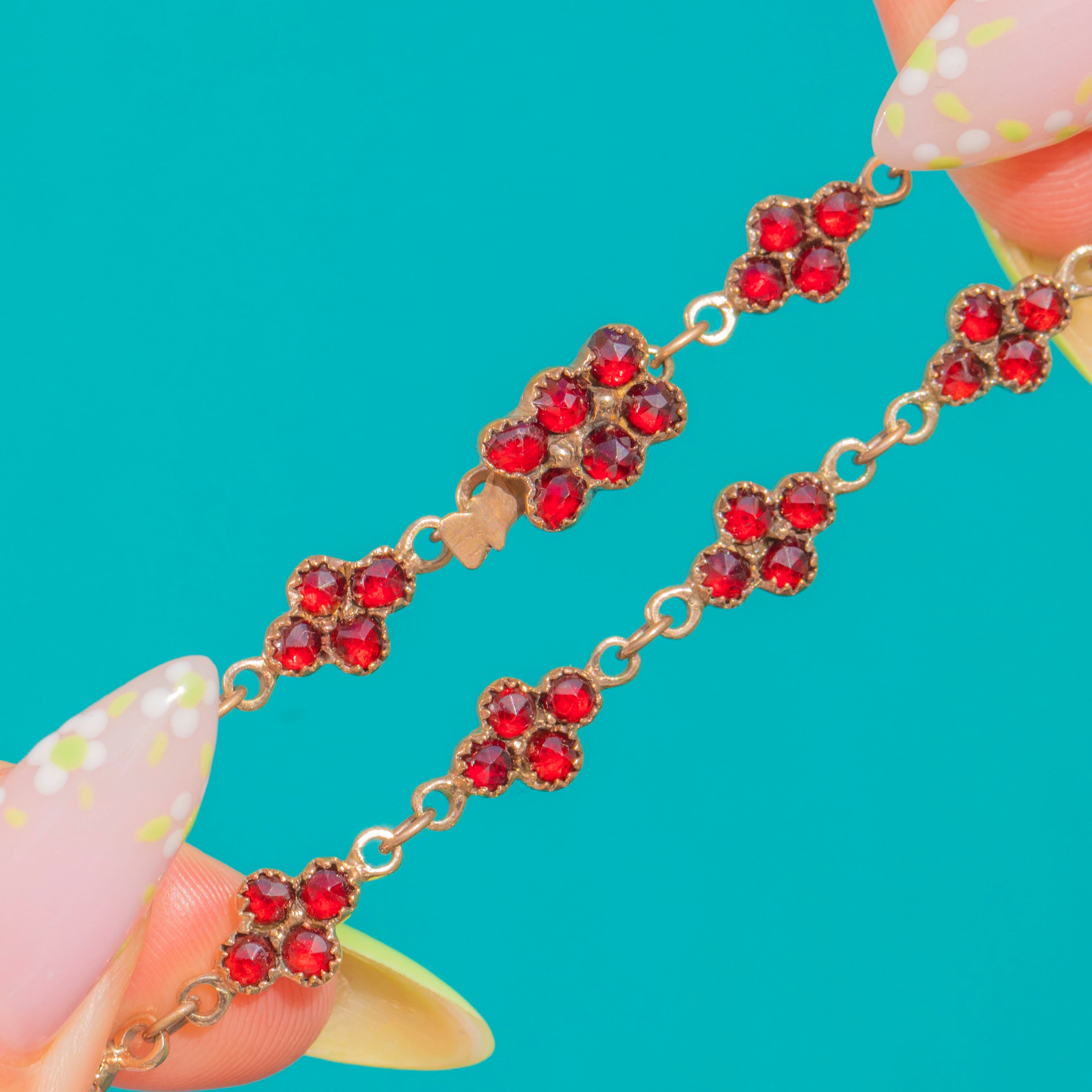 The rose-cut Garnets catch the light with a soft sparkle, their crimson hue accented by the delicate serrated rims and fine linking throughout. Finished with a neat box-and-tongue clasp, it’s an elegant, feminine piece that layers beautifully yet is striking worn solo.
