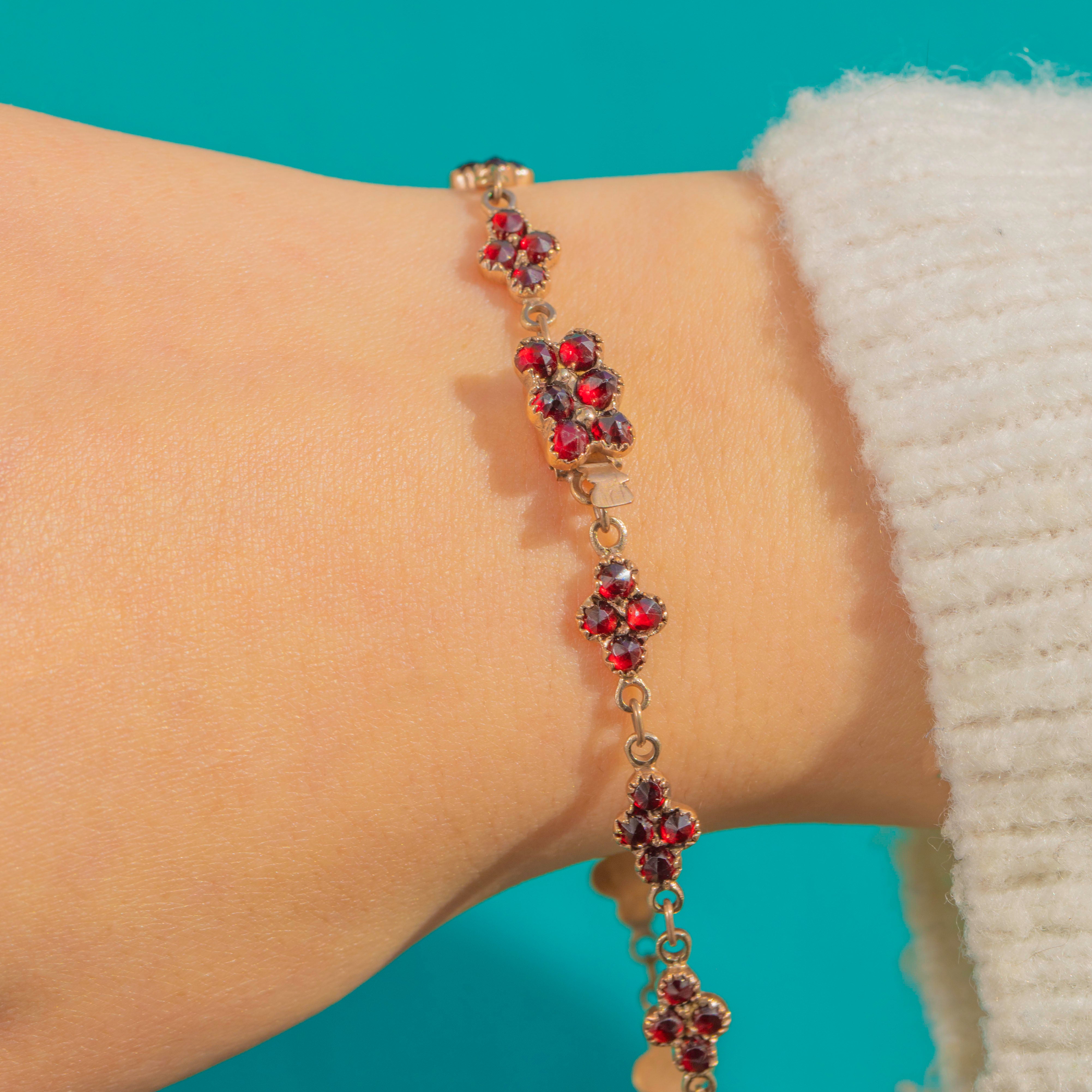 A romantic Victorian bracelet alive with the glow of rich red Garnets, this dainty treasure is formed of repeating floral clusters articulated for beautiful fluidity on the wrist. Each cluster is set in scalloped, closed-back settings that amplify the depth of colour, crafted in warm Garnet Gold for that unmistakable antique allure.