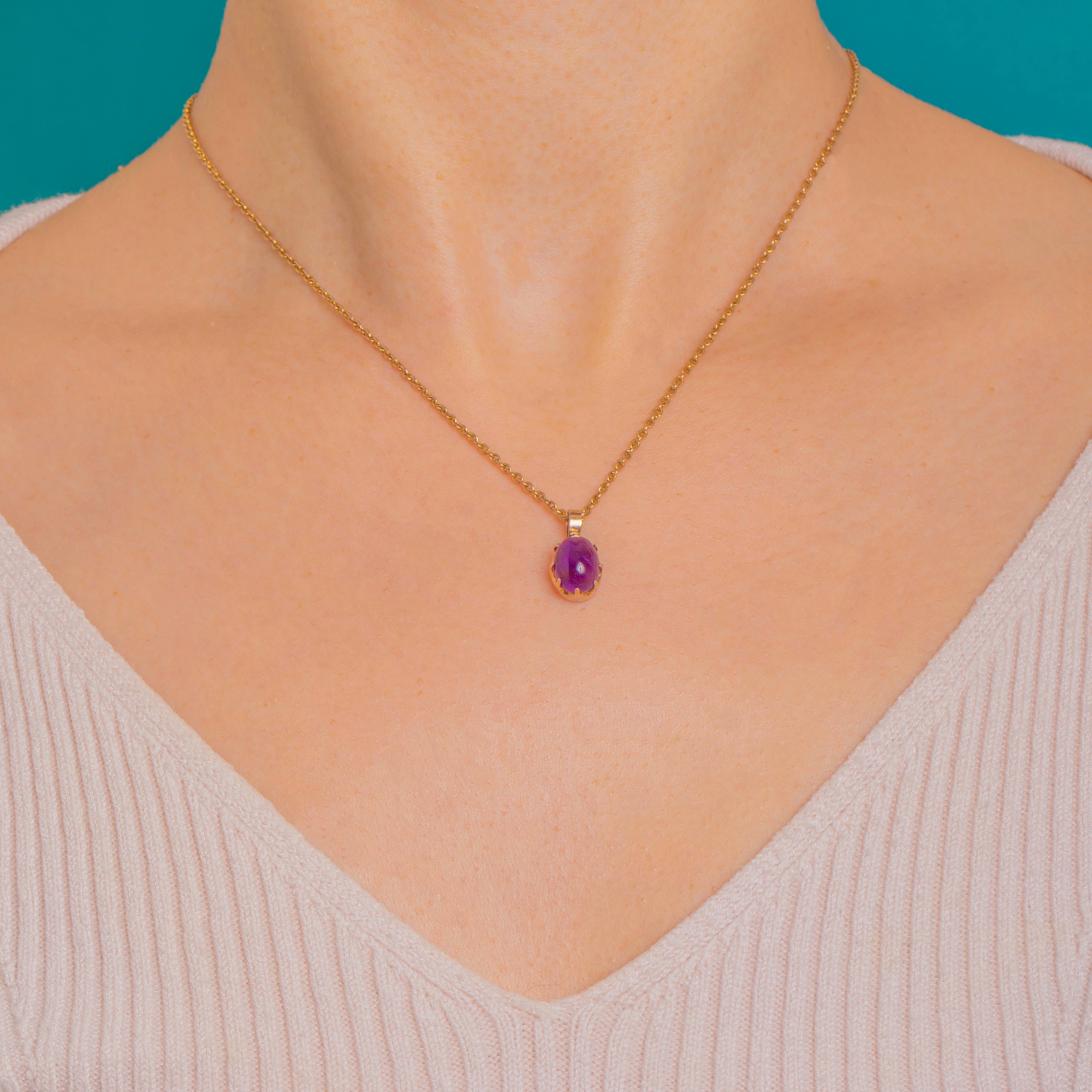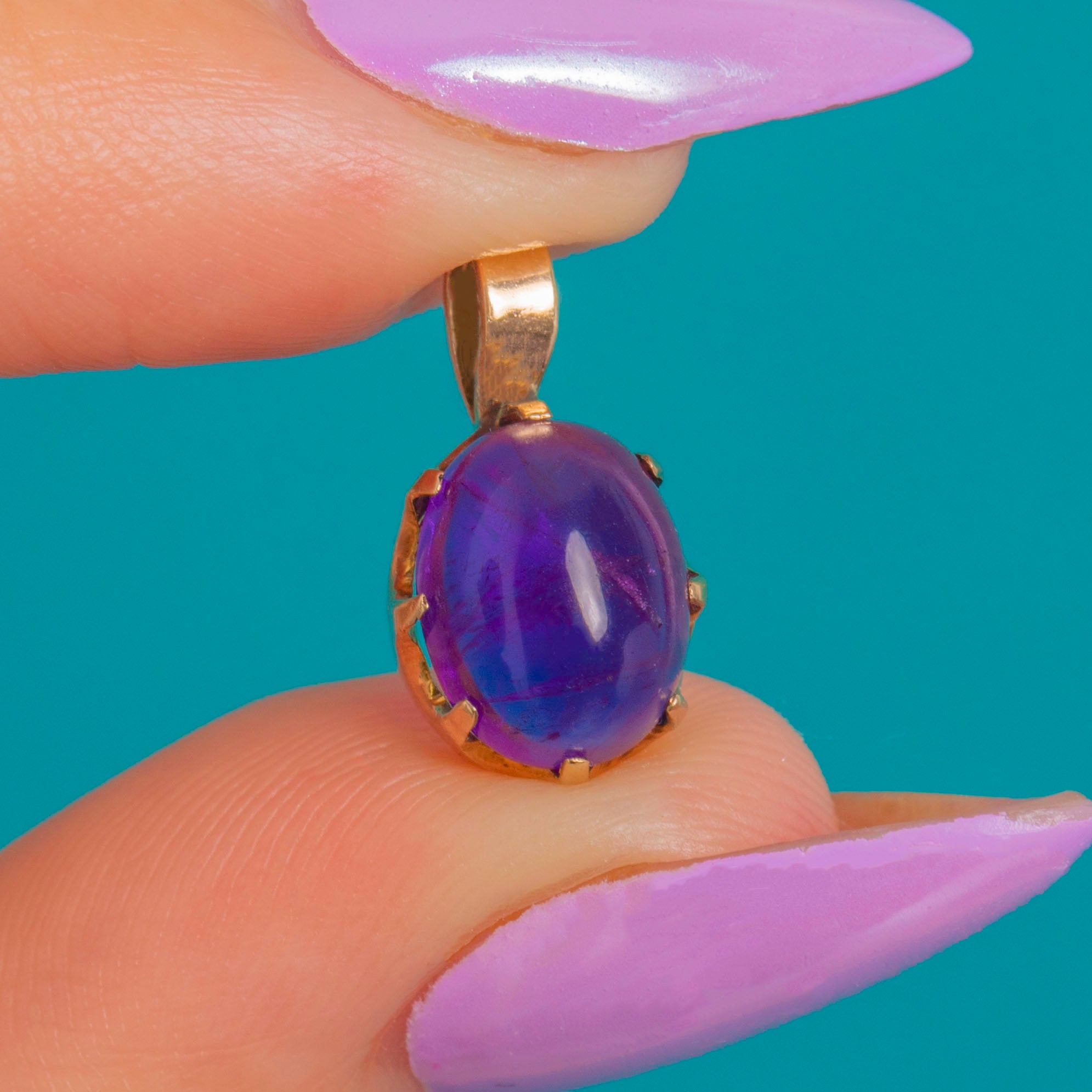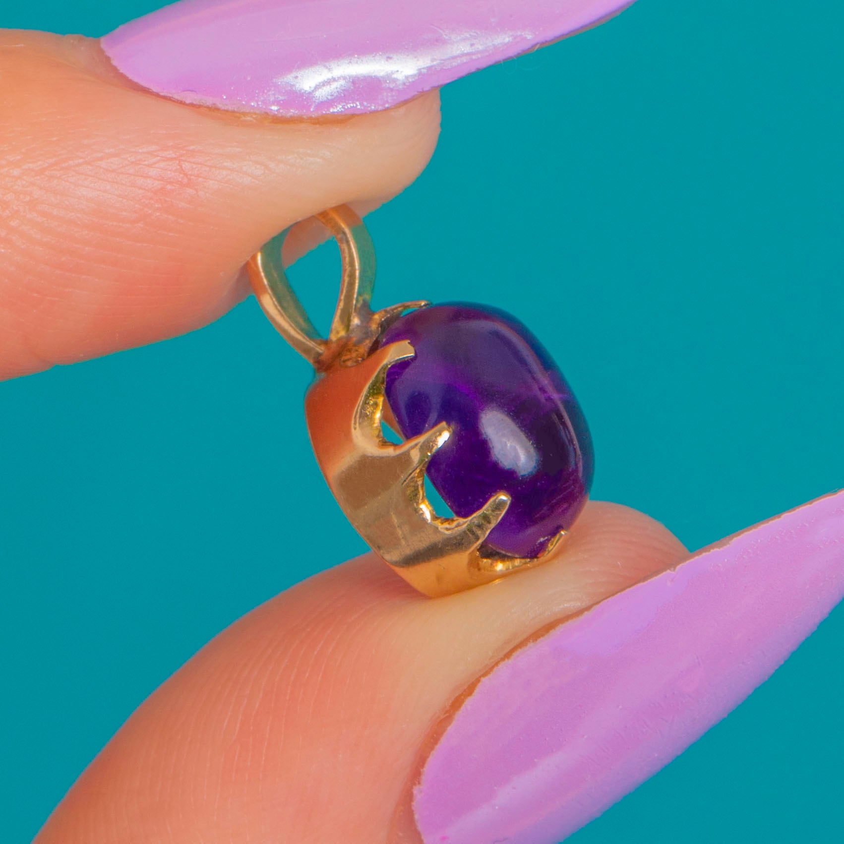 EXCELLENT: The Amethyst cabochon is smooth and lustrous with only the lightest surface wear visible under close inspection. The 9ct Gold setting and scalloped bezel are secure and well-preserved with a clean bail and no visible repairs. Overall, this piece has been well cared for.
