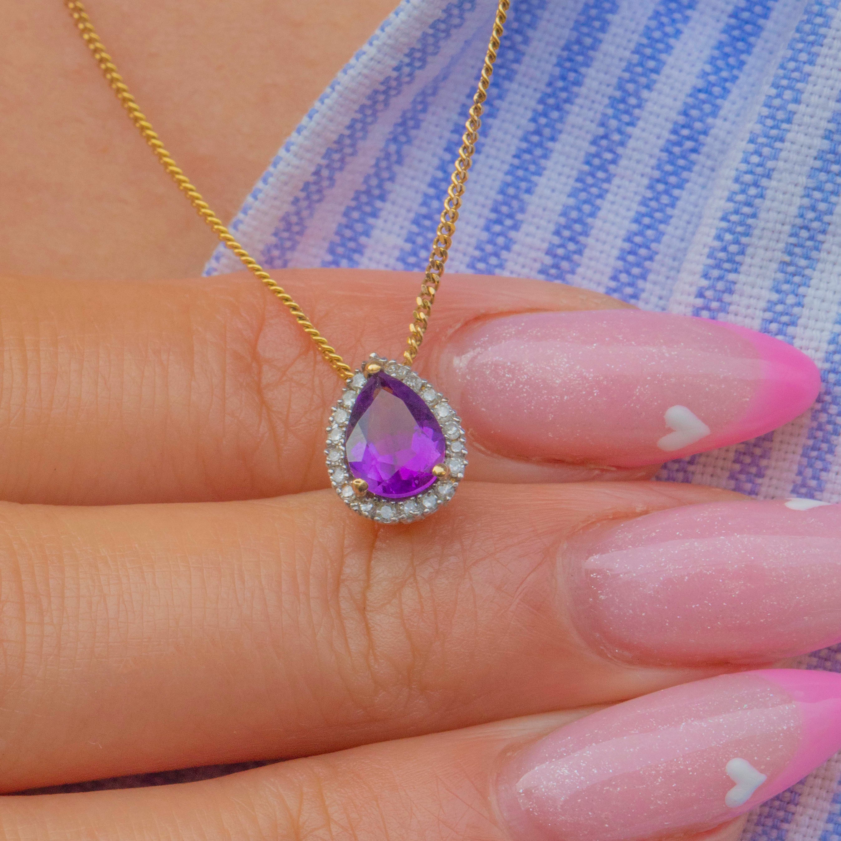 This elegant pendant features a vibrant pear-cut Amethyst framed by a sparkling Diamond halo, set in 9ct Yellow Gold with contrasting 9ct White Gold Diamond settings for added brilliance. The rich purple hue of the Amethyst glows beautifully, complemented by the fine 18" curb chain that completes the look.