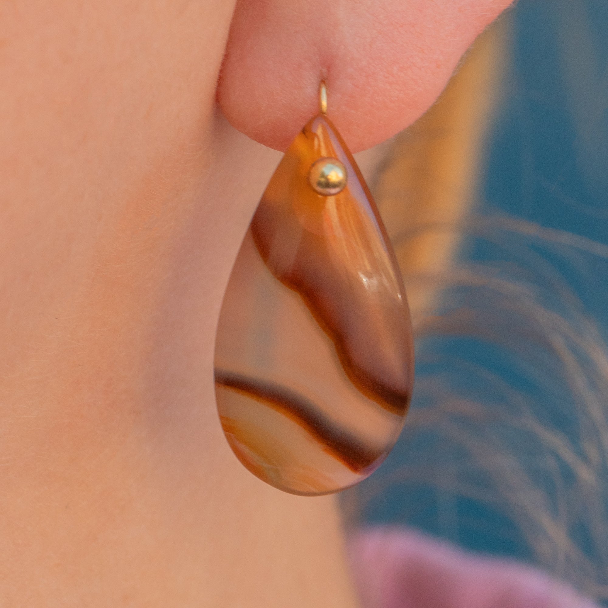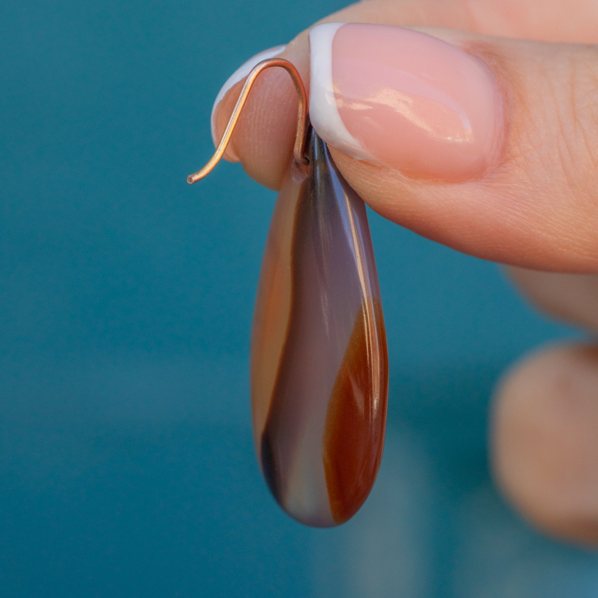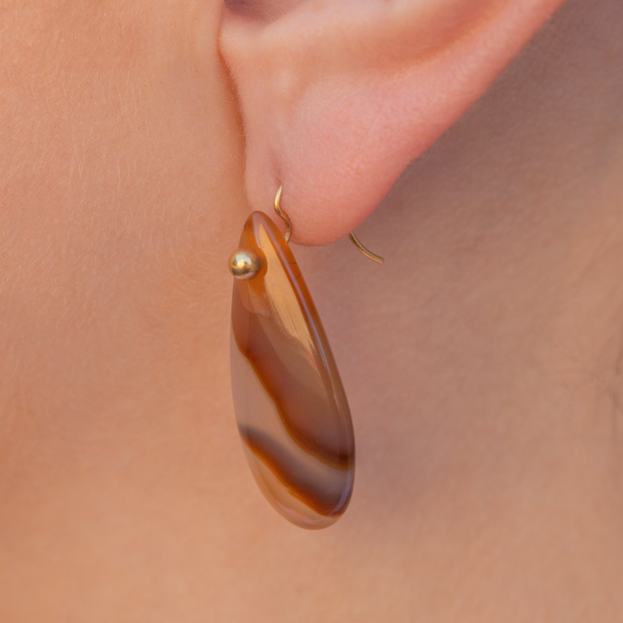 These 9ct Gold antique Agate pear drop earrings are simply delightful. Sleek pear cut striped Agates rest within elegant 9ct Gold hooks, infused with warm earthy tones throughout.