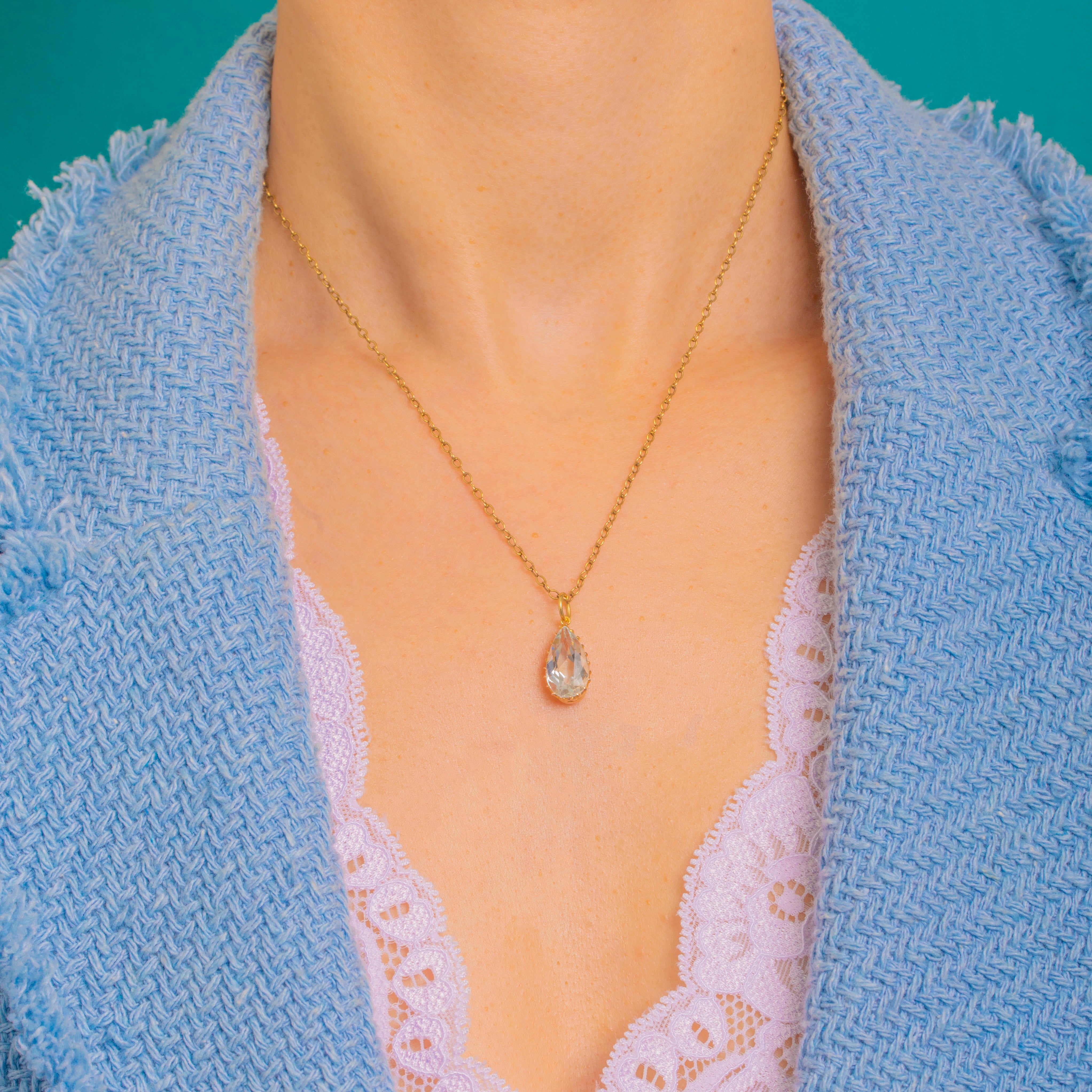 A serene Aquamarine pear drop shimmers in 9ct Gold, its elegant teardrop silhouette capturing the effortless romance of the Edwardian era. The faceted stone is cradled in a delicate rim with a refined, scalloped open gallery that invites light from every angle for a soft glow.