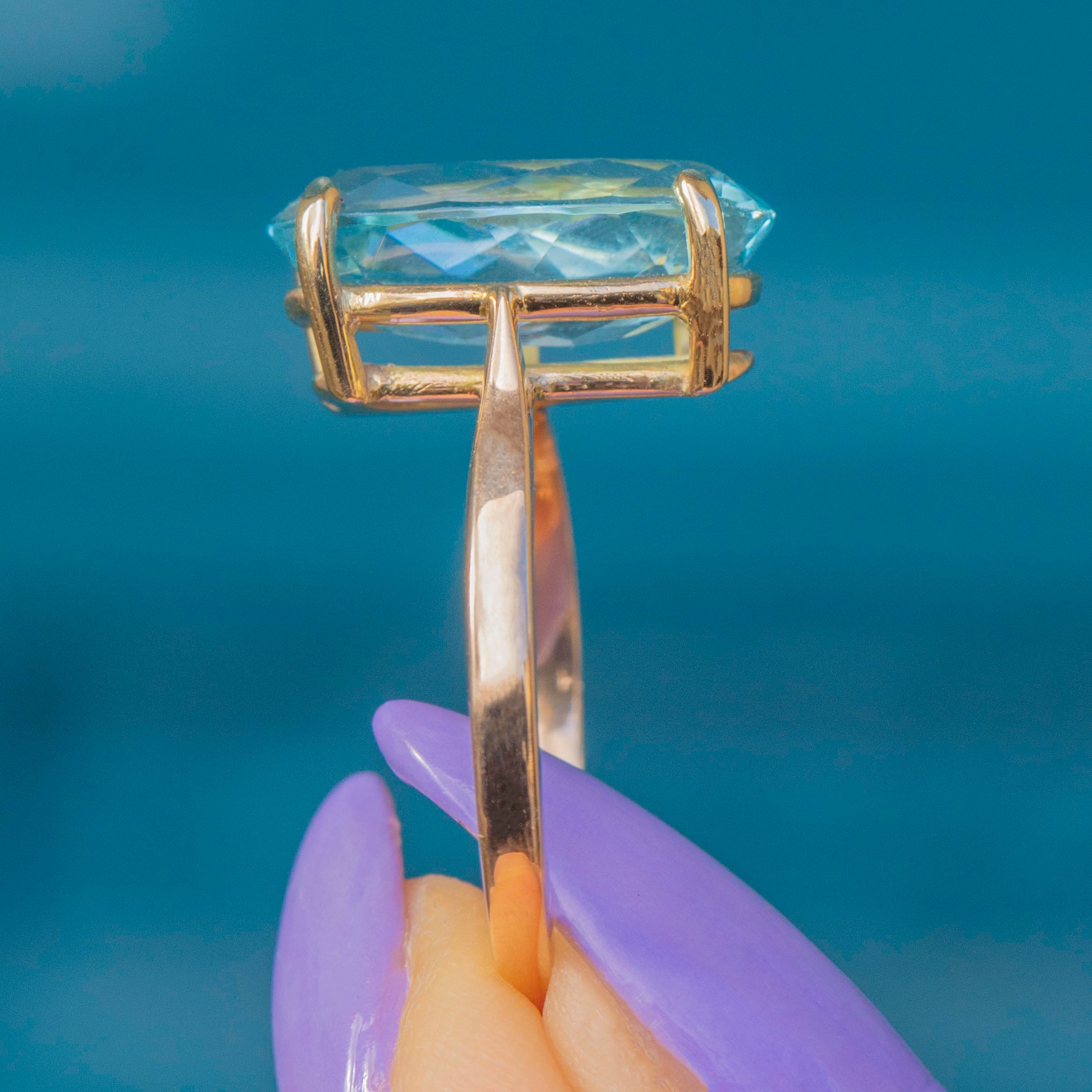 This exquisite 9ct Gold Aquamarine oval solitaire ring exudes elegance and sophistication. The 3.30ct Aquamarine is akin to a pool of icy water, with the facets shimmering and changing with the light, flashing with deep azure and turquoise undertones.