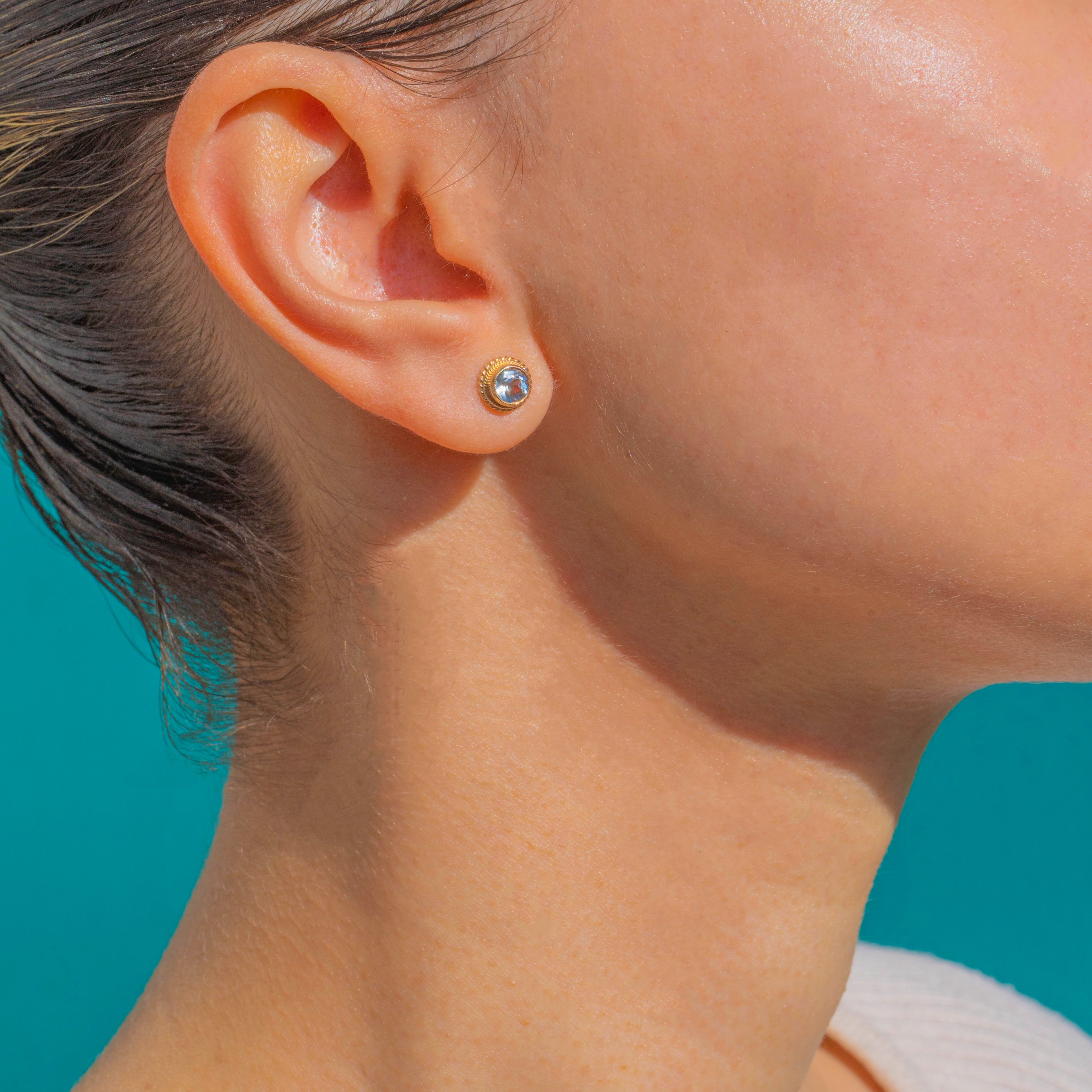 These Vintage 9ct Gold Aquamarine stud earrings are effortlessly elegant, each showcasing a pale blue round Aquamarine in a smooth bezel framed by a refined rope-twist border. The textured Gold halo adds a touch of heritage charm while keeping the look beautifully understated for everyday wear.