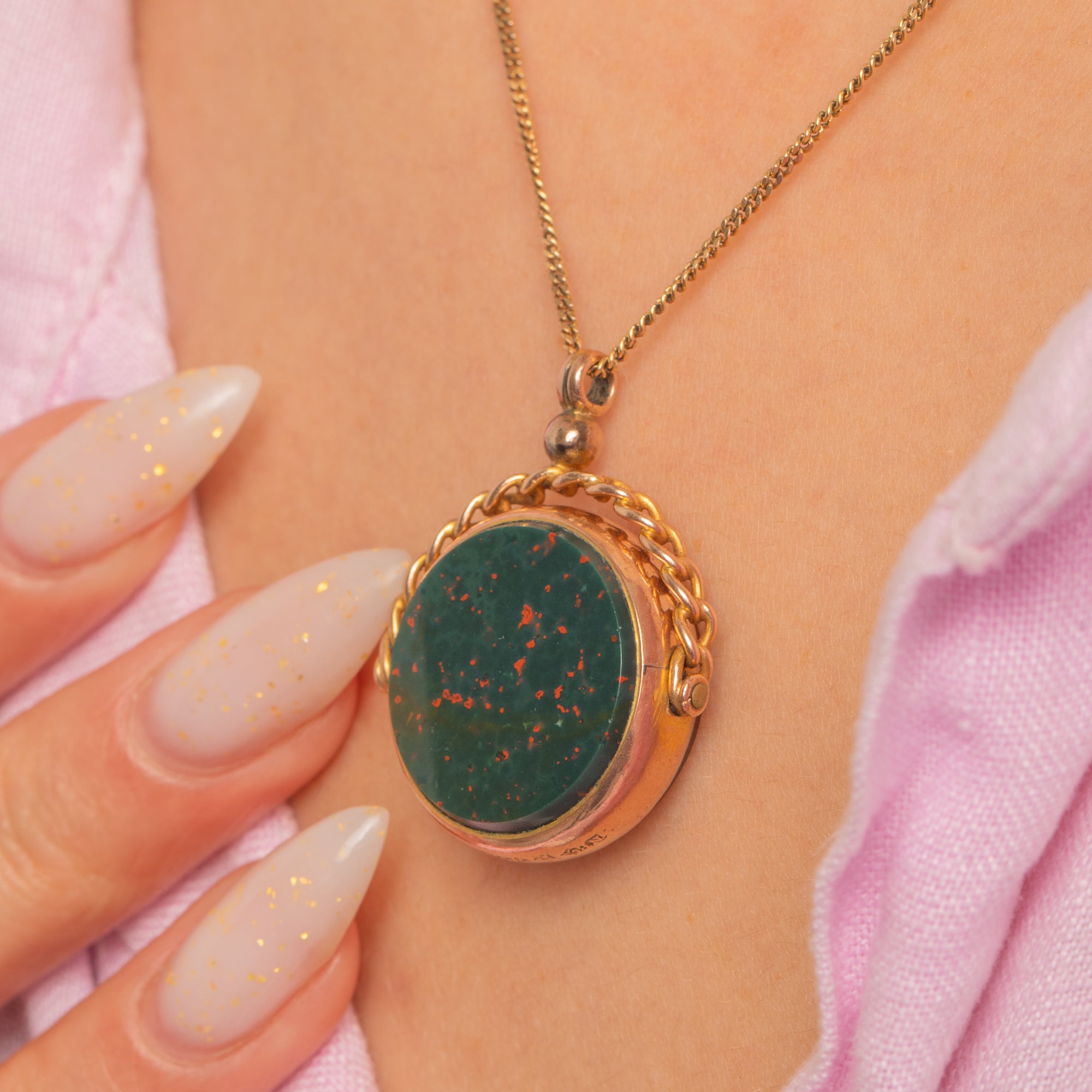 Choose serene dark green with vibrant red flecks one day, and glowing reddish‑brown the next; both faces are beautifully polished for a sleek, antique finish. Fully hallmarked for Chester and dating to 1911, this graceful charm is securely made and effortlessly wearable on your favourite chain, bringing colour, texture and history to every look.