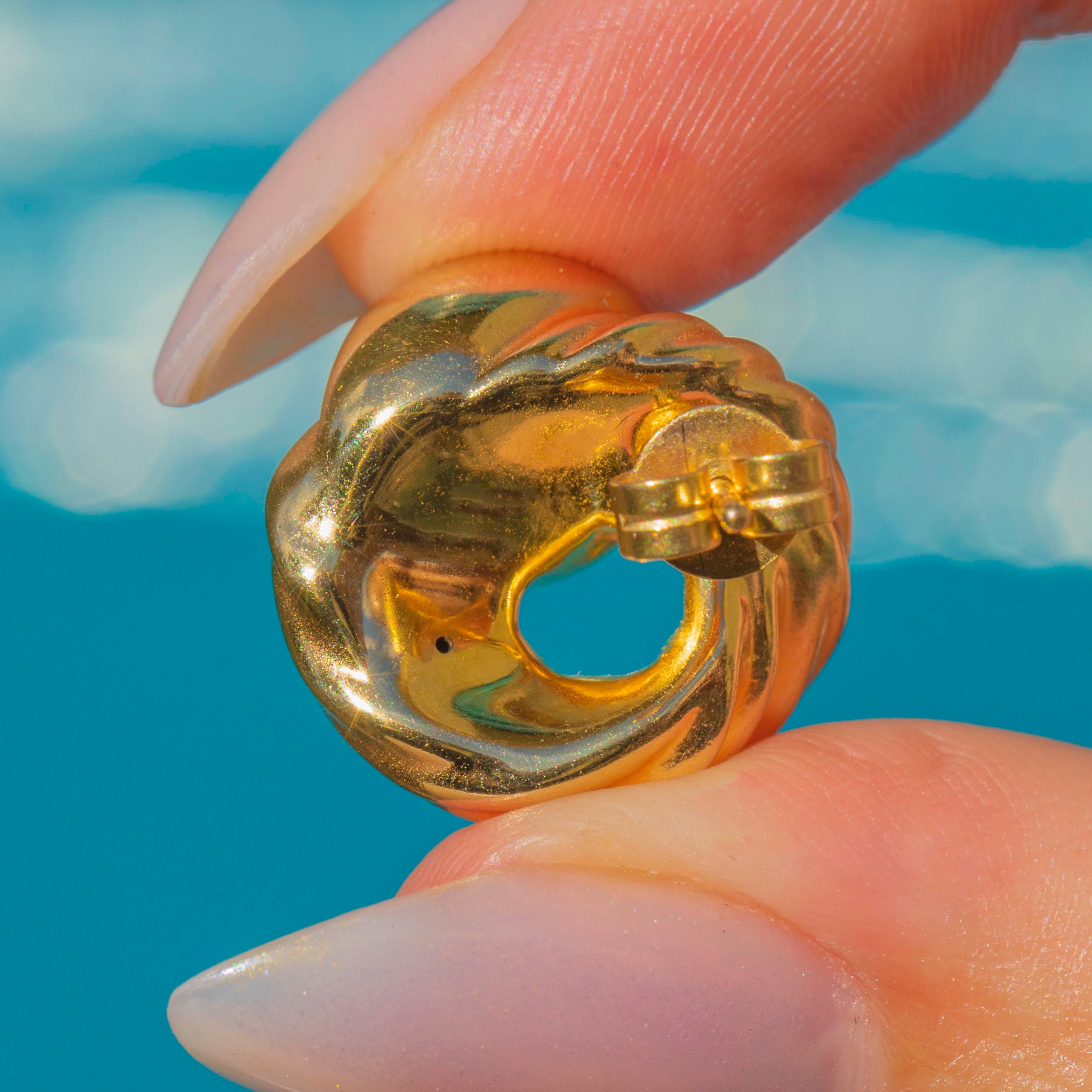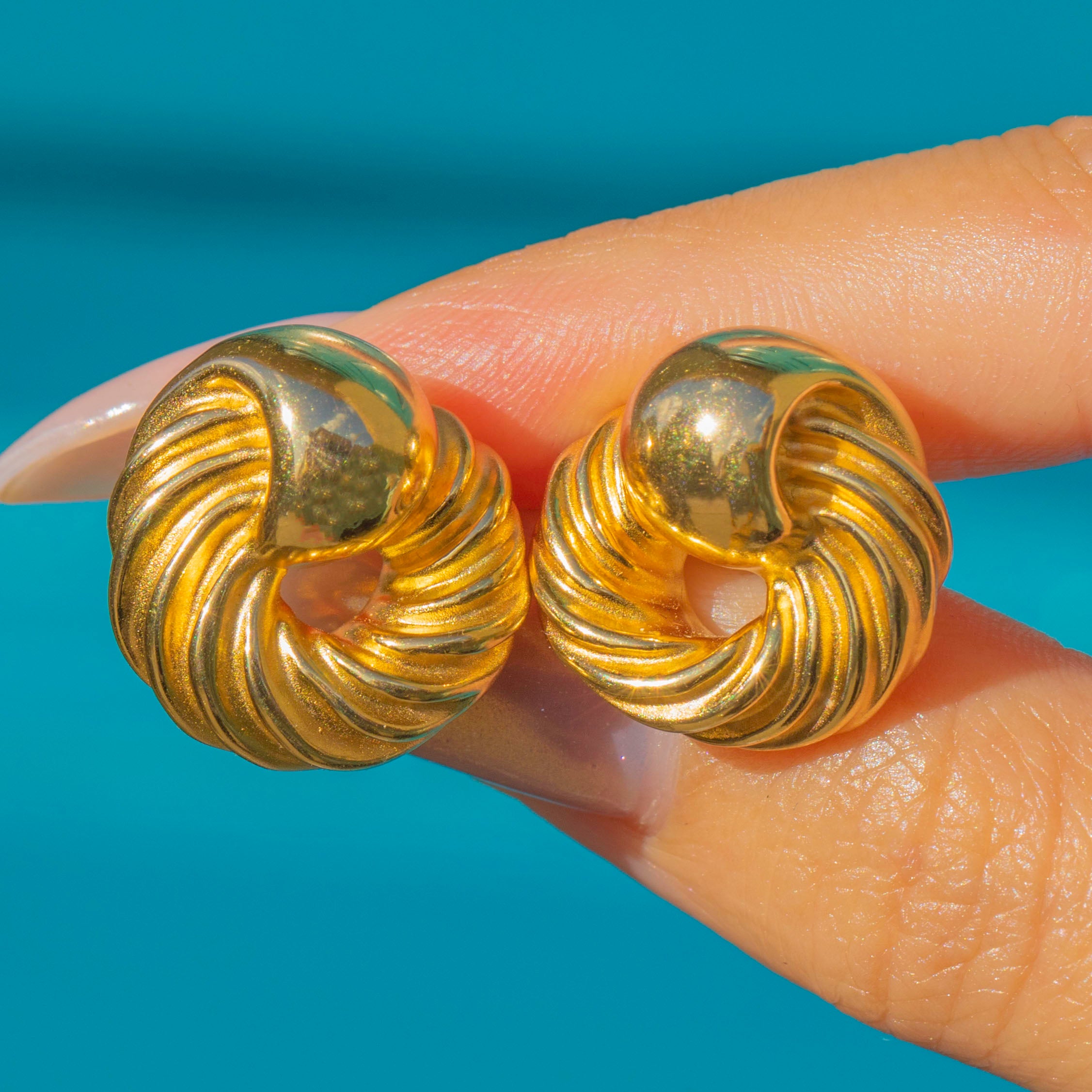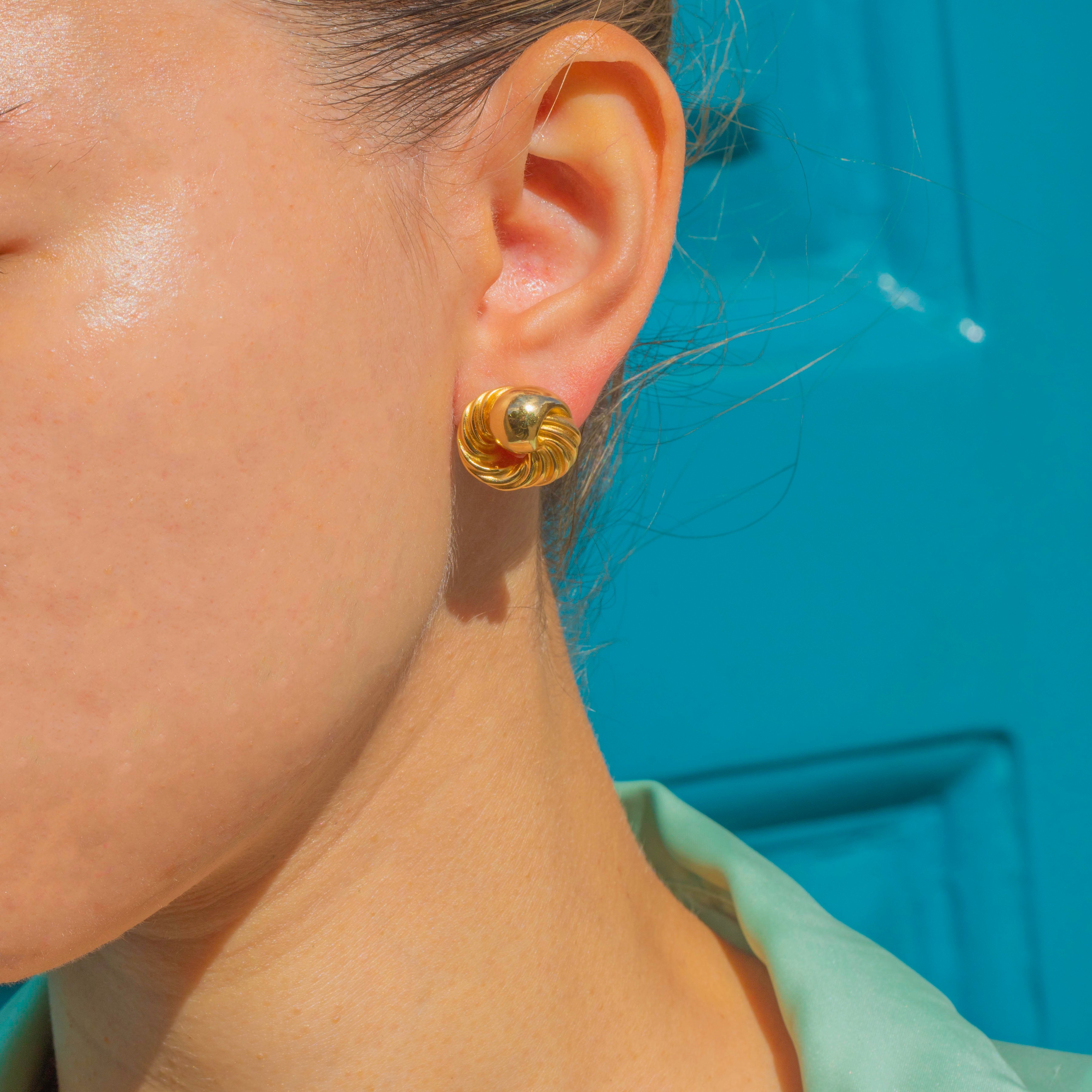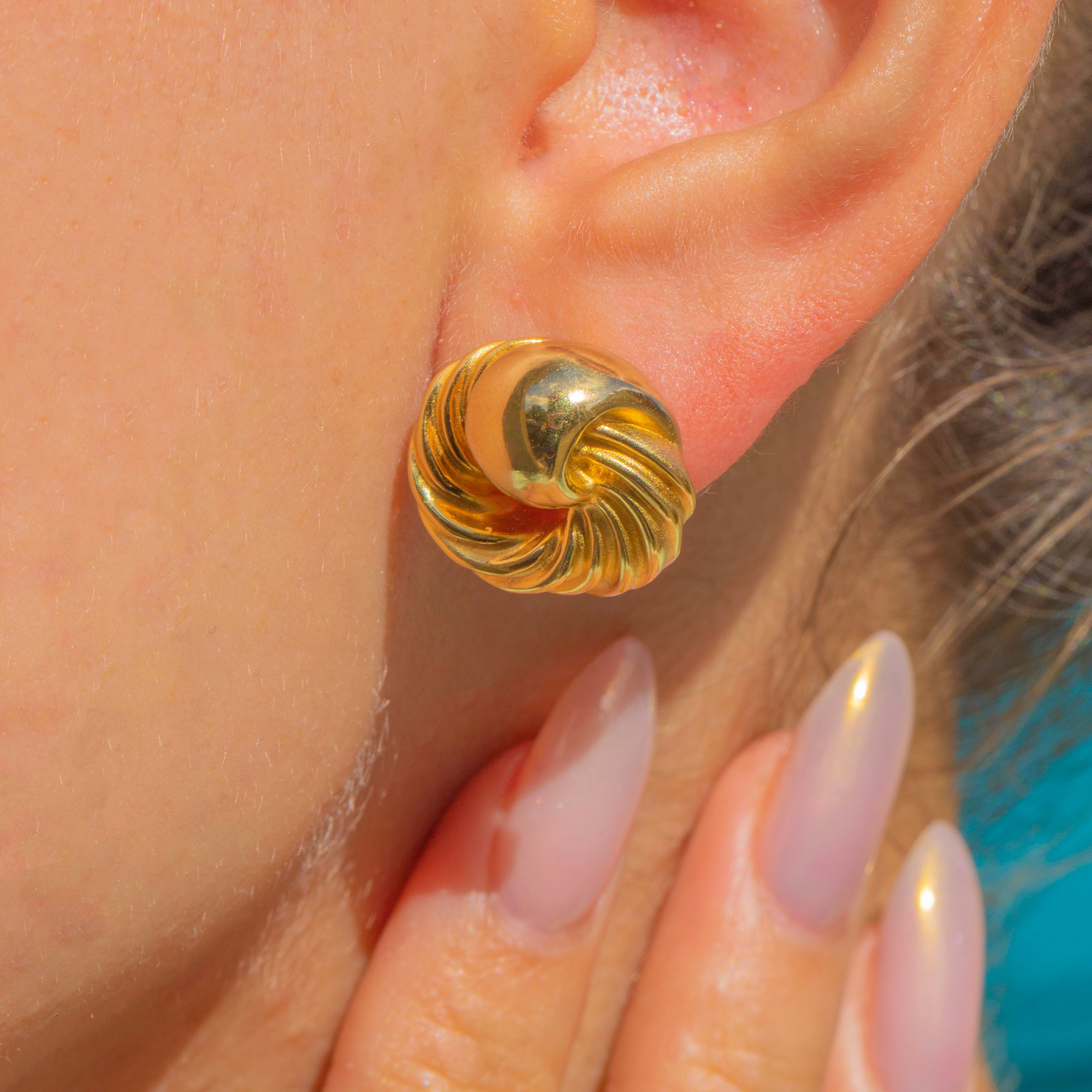 Bold yet refined, these Mid-Century Vintage earrings are crafted in rich 9ct Gold with a sculptural twisted design. Circular in form, they feature deep ridges that create a striking play of light across the Gold surface, giving them both texture and dimension.